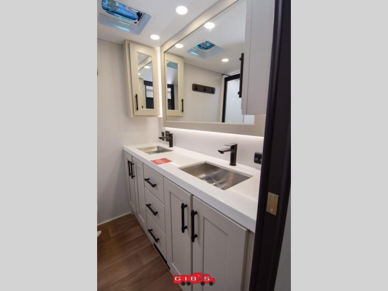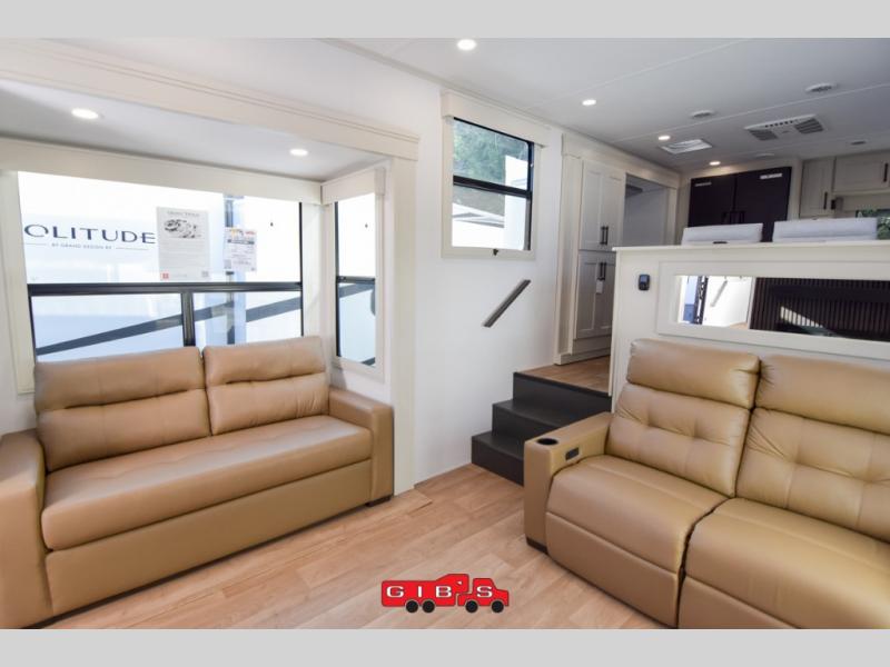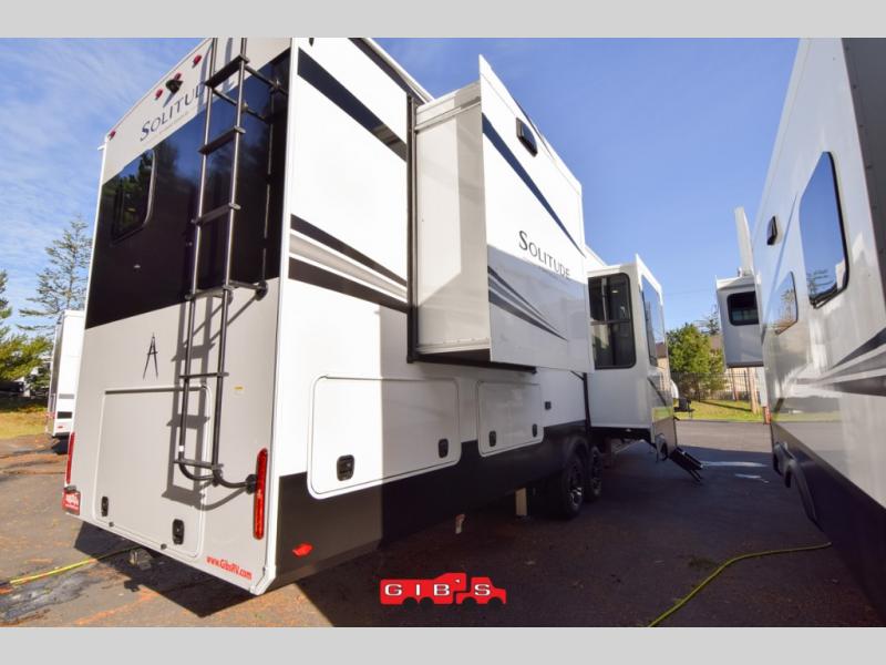 Each Solitude fifth wheel by Grand Design features a 101" wide-body construction, heavy duty 8,000 lb. axles, frameless tinted windows, and high-gloss gel coat sidewalls. You can camp year around thanks to the Weather-Tek Package that includes a 35K BTU high-capacity furnace, an all-in-one enclosed and heated utility center, and a fully enclosed underbelly with heated tanks and storage. Inside, you'll love the premium roller shades, hardwood cabinet doors, solid surface countertops, plus residential finishes throughout to make you truly feel at home. Each model also includes a MORryde CRE3000 suspension system, self adjusting brakes, and a MORryde pin box that will provide smooth towing from home to campground. Affordable luxury is possible with the Solitude fifth wheels; choose yours today!