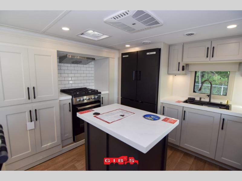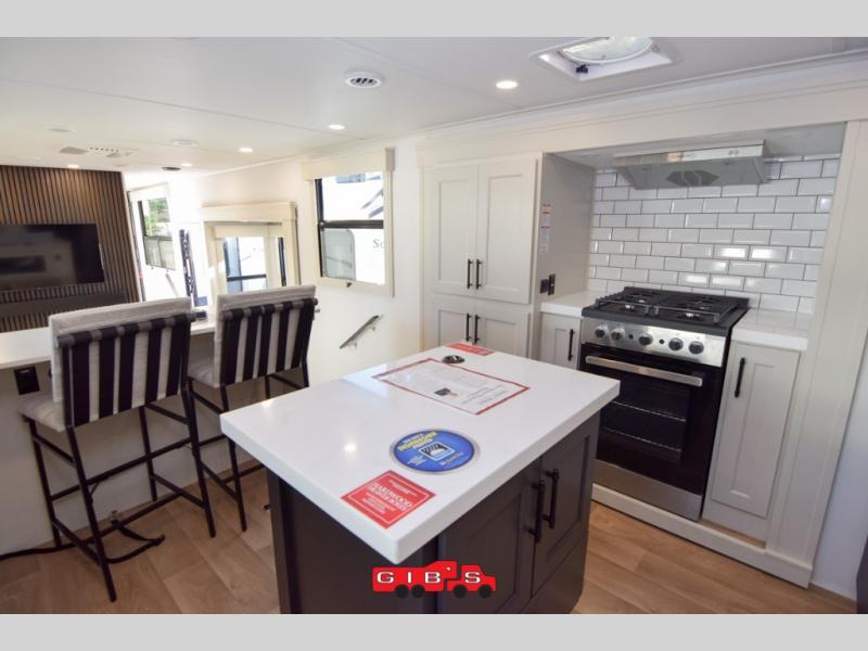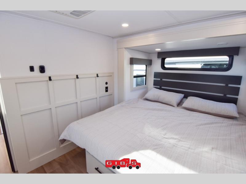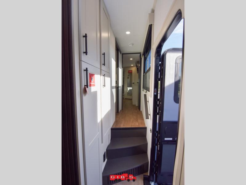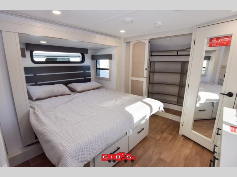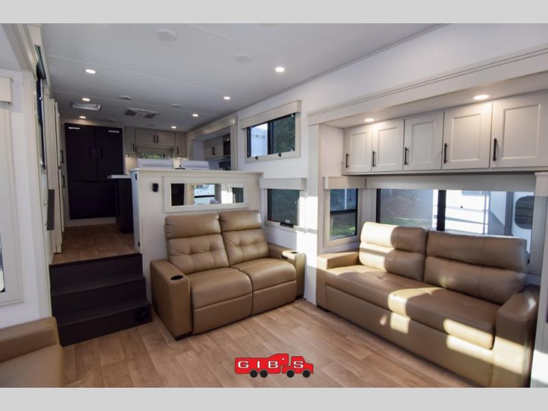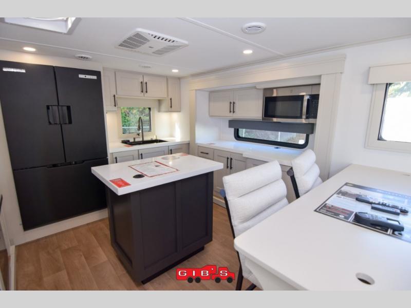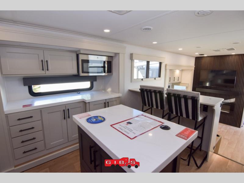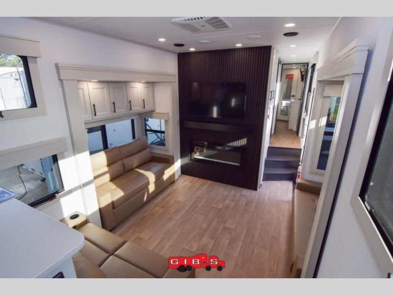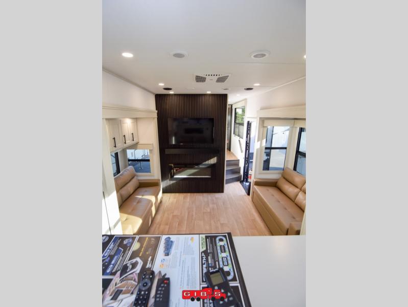 Enjoy each and every vacation, month-long trips, or even extended stays at an RV park in this spacious fifth wheel! The raised rear kitchen gives the cook plenty of room to whip up any type of meal using the stainless steel appliances including a built-in oven, an oversized pantry, and the raised bar top will provide you even more counter space on top of dining with two chairs that overlook the middle living area. Relaxing is made easy thanks to two tri-fold sofas and theatre seating while watching the big game on the LED Smart TV and enjoying the fireplace below. At night, retire to your own queen bed which slides out to provide more floor space, and you can store your clothes in the slide top dresser and front closet with washer and dryer prep.