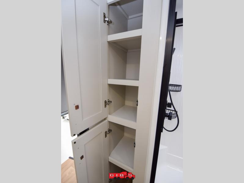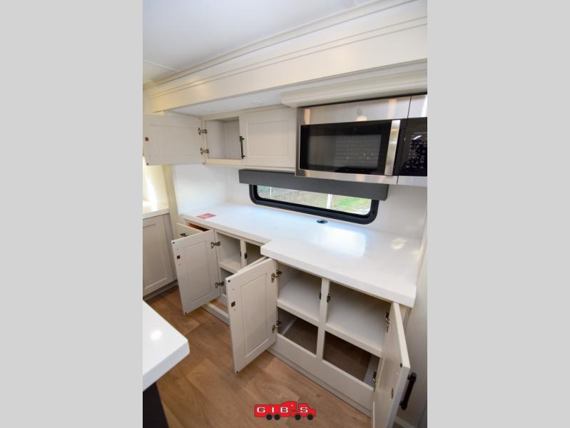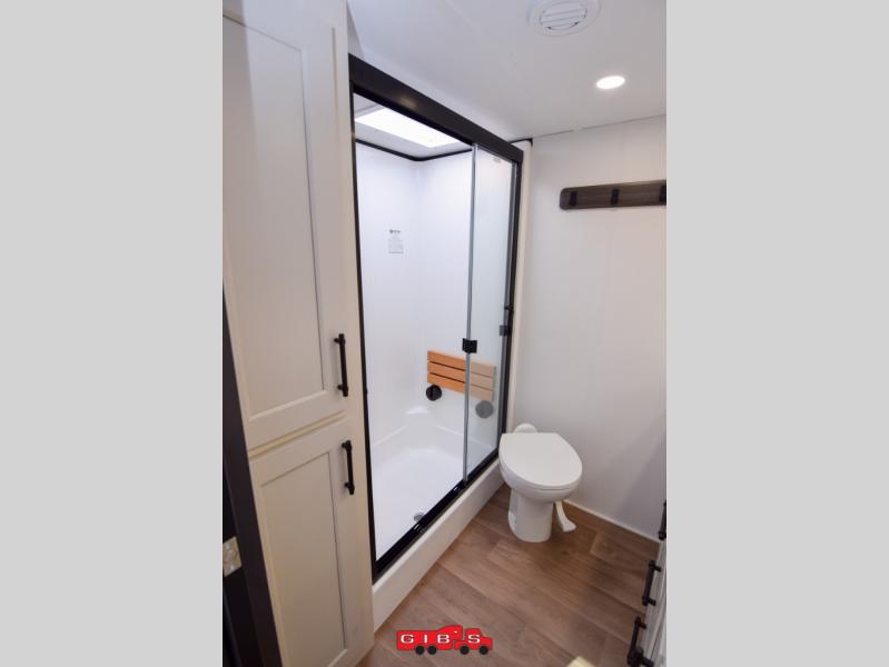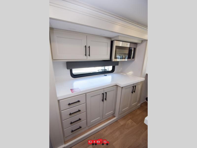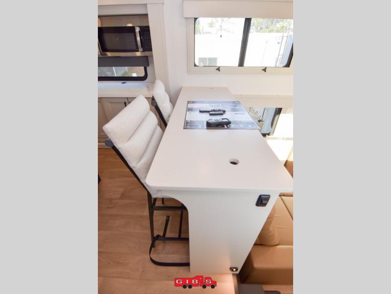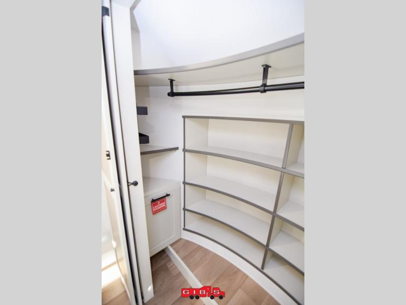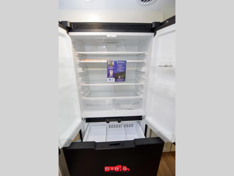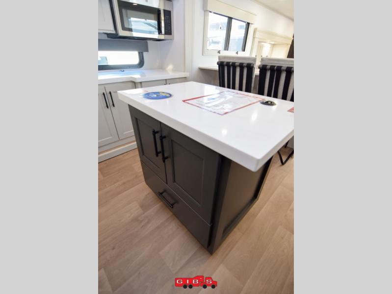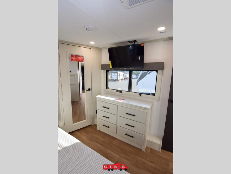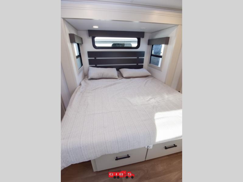 Enjoy each and every vacation, month-long trips, or even extended stays at an RV park in this spacious fifth wheel! The raised rear kitchen gives the cook plenty of room to whip up any type of meal using the stainless steel appliances including a built-in oven, an oversized pantry, and the raised bar top will provide you even more counter space on top of dining with two chairs that overlook the middle living area. Relaxing is made easy thanks to two tri-fold sofas and theatre seating while watching the big game on the LED Smart TV and enjoying the fireplace below. At night, retire to your own queen bed which slides out to provide more floor space, and you can store your clothes in the slide top dresser and front closet with washer and dryer prep.