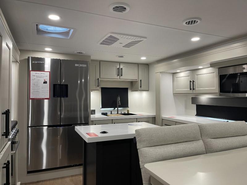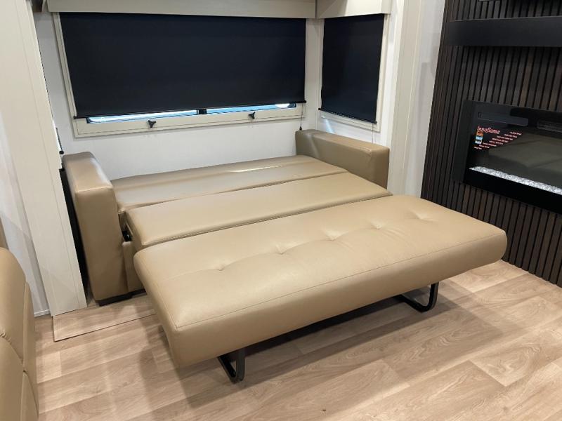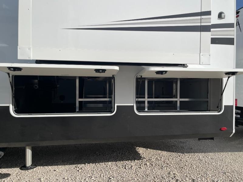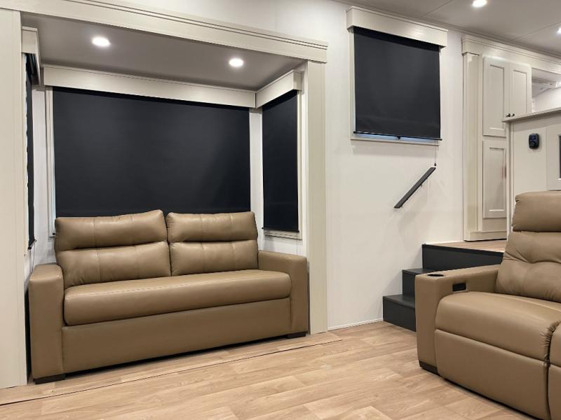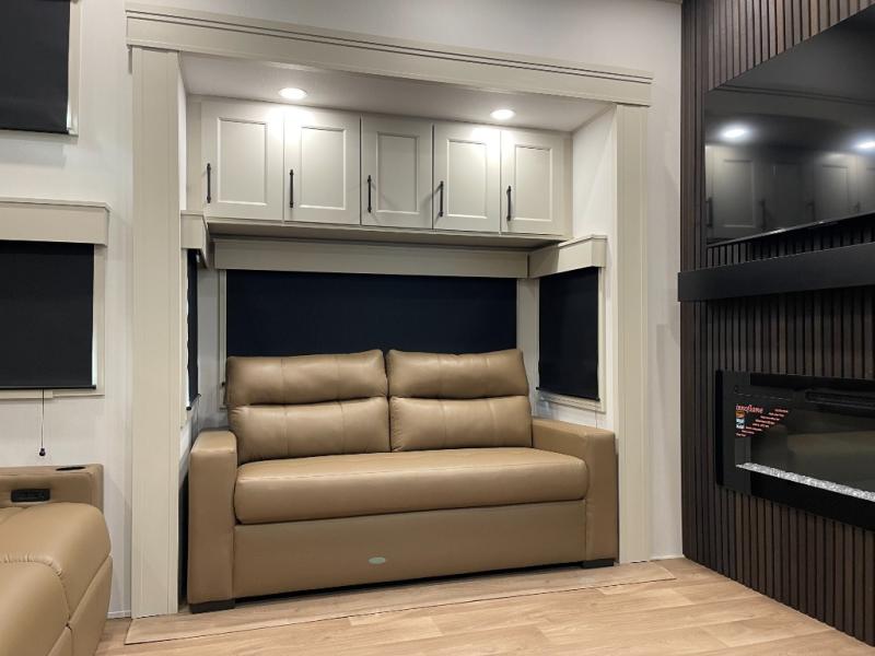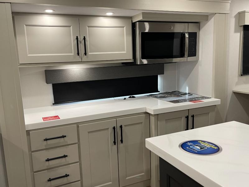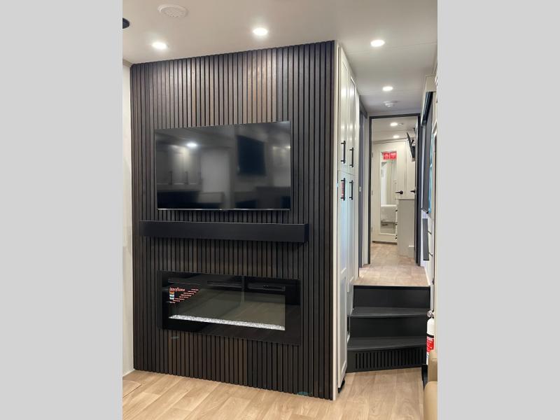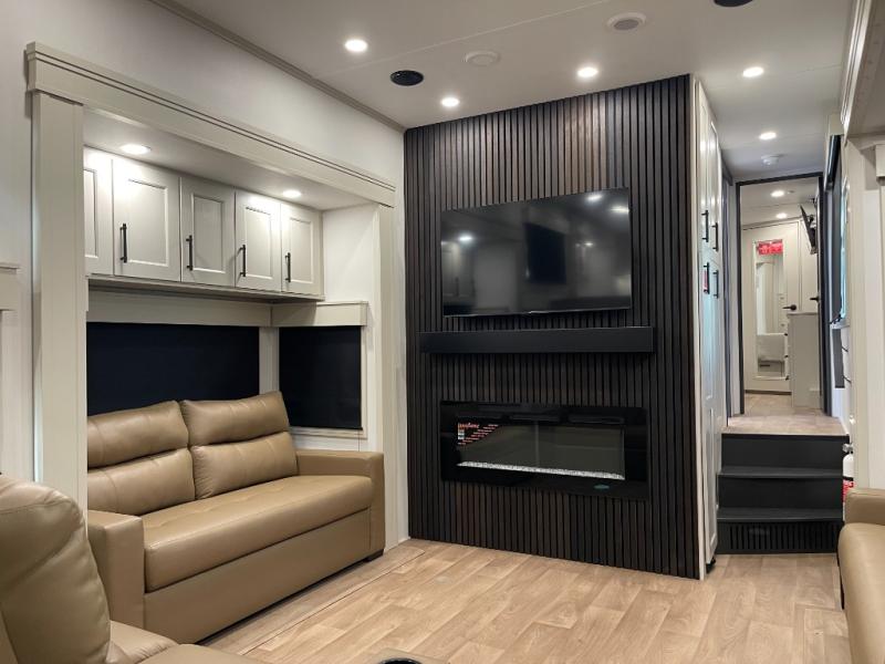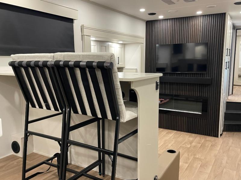 Enjoy each and every vacation, month-long trips, or even extended stays at an RV park in this spacious fifth wheel! The raised rear kitchen gives the cook plenty of room to whip up any type of meal using the stainless steel appliances including a built-in oven, an oversized pantry, and the raised bar top will provide you even more counter space on top of dining with two chairs that overlook the middle living area. Relaxing is made easy thanks to two tri-fold sofas and theatre seating while watching the big game on the LED Smart TV and enjoying the fireplace below. At night, retire to your own queen bed which slides out to provide more floor space, and you can store your clothes in the slide top dresser and front closet with washer and dryer prep.