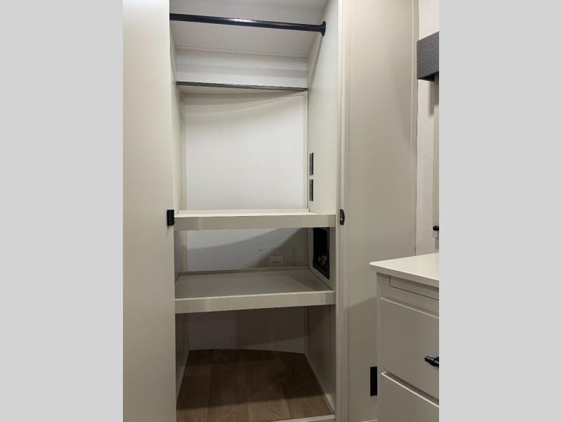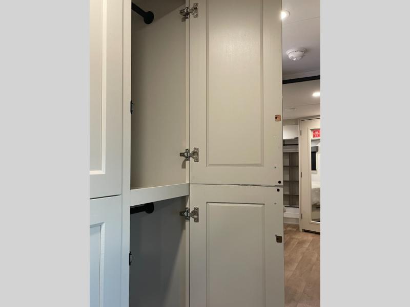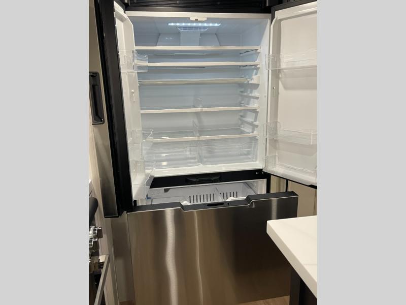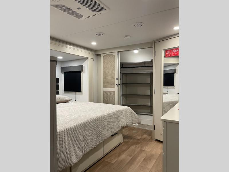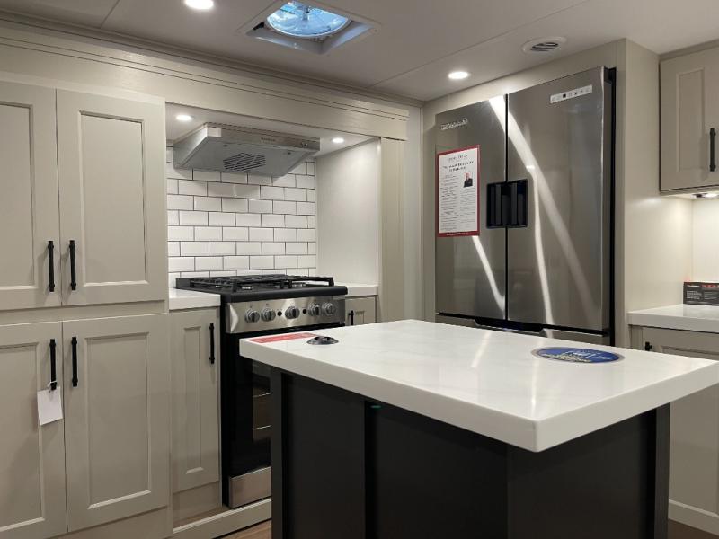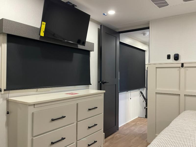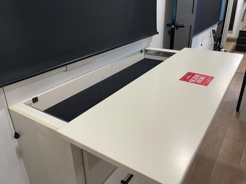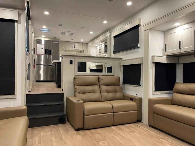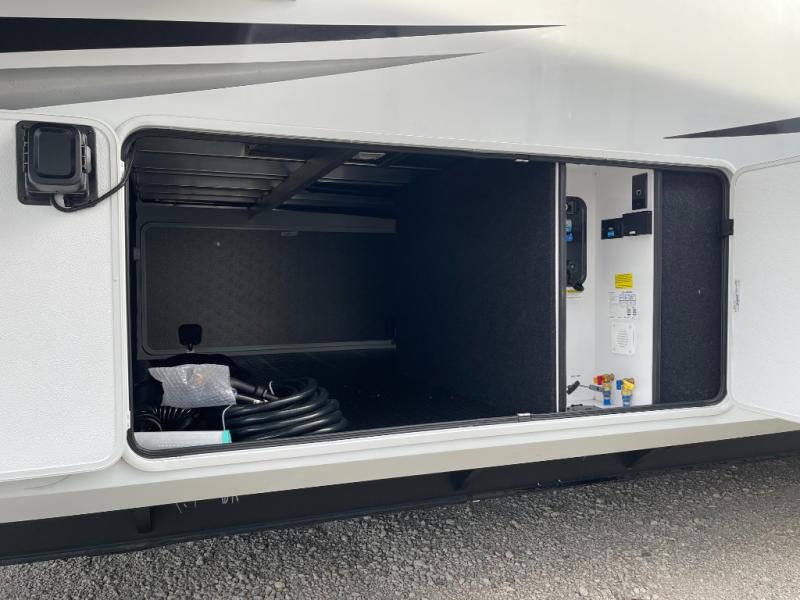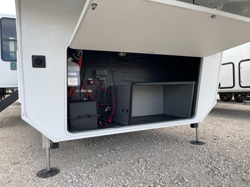 Enjoy each and every vacation, month-long trips, or even extended stays at an RV park in this spacious fifth wheel! The raised rear kitchen gives the cook plenty of room to whip up any type of meal using the stainless steel appliances including a built-in oven, an oversized pantry, and the raised bar top will provide you even more counter space on top of dining with two chairs that overlook the middle living area. Relaxing is made easy thanks to two tri-fold sofas and theatre seating while watching the big game on the LED Smart TV and enjoying the fireplace below. At night, retire to your own queen bed which slides out to provide more floor space, and you can store your clothes in the slide top dresser and front closet with washer and dryer prep.