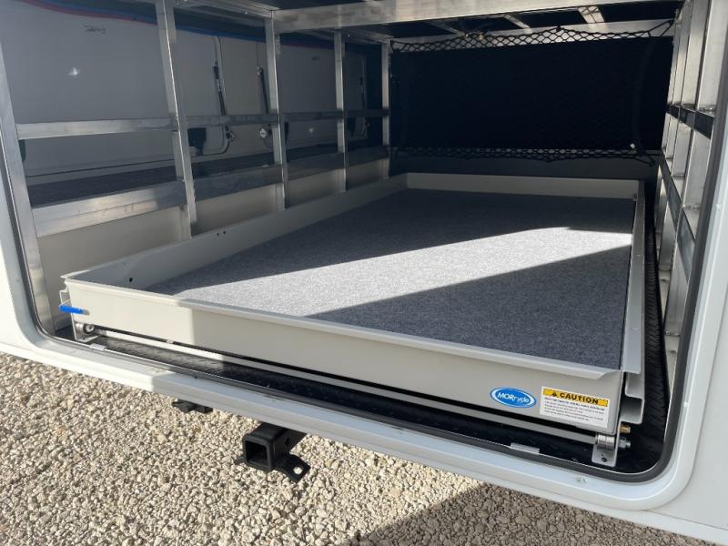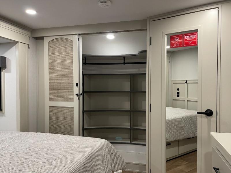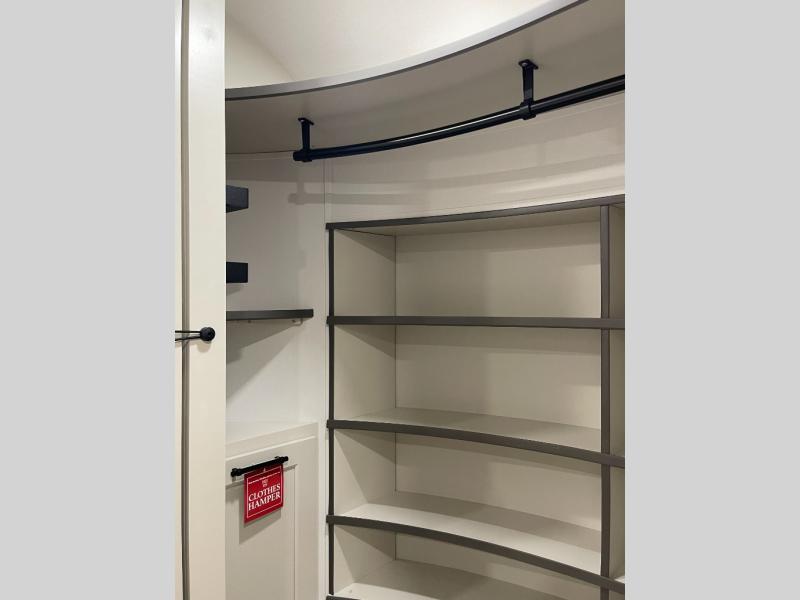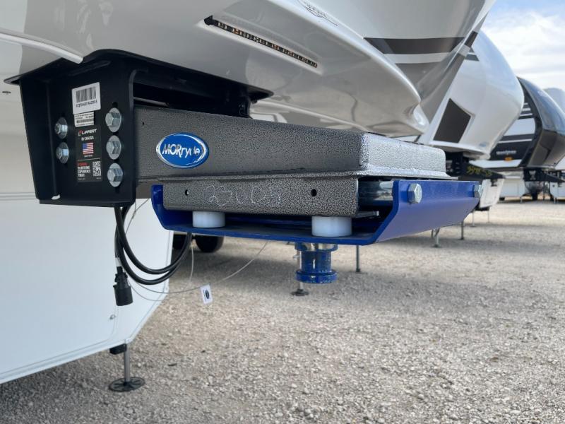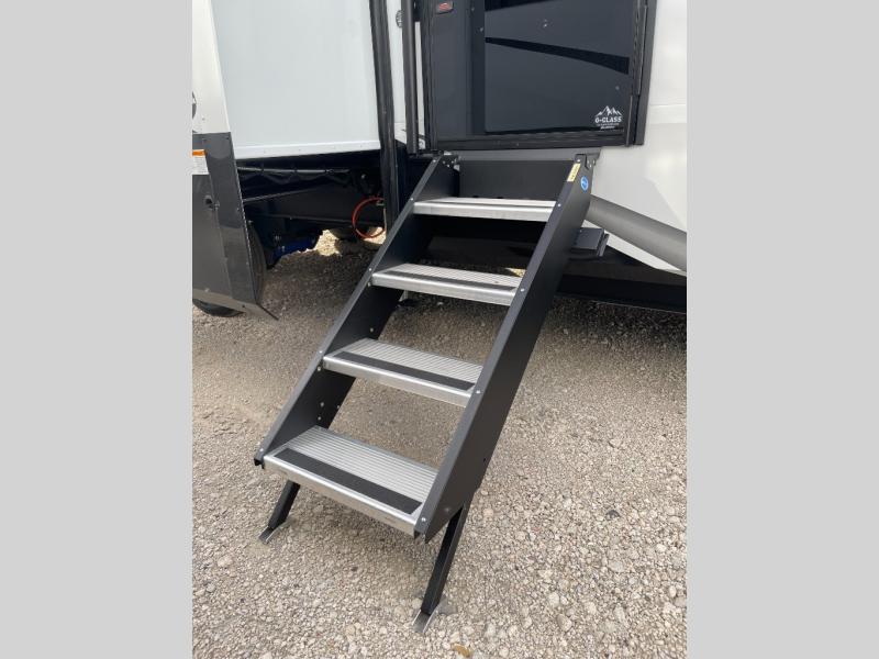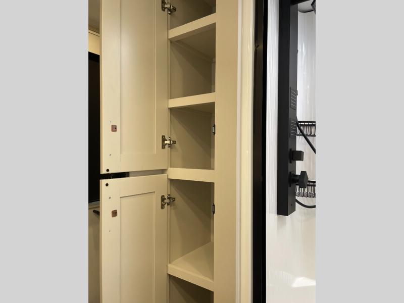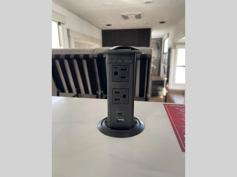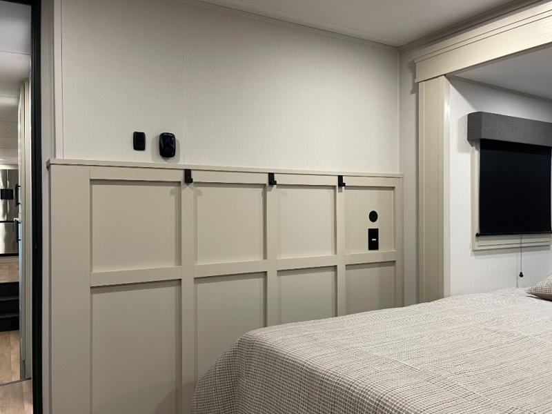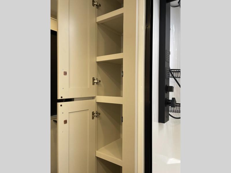 Enjoy each and every vacation, month-long trips, or even extended stays at an RV park in this spacious fifth wheel! The raised rear kitchen gives the cook plenty of room to whip up any type of meal using the stainless steel appliances including a built-in oven, an oversized pantry, and the raised bar top will provide you even more counter space on top of dining with two chairs that overlook the middle living area. Relaxing is made easy thanks to two tri-fold sofas and theatre seating while watching the big game on the LED Smart TV and enjoying the fireplace below. At night, retire to your own queen bed which slides out to provide more floor space, and you can store your clothes in the slide top dresser and front closet with washer and dryer prep.