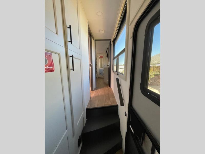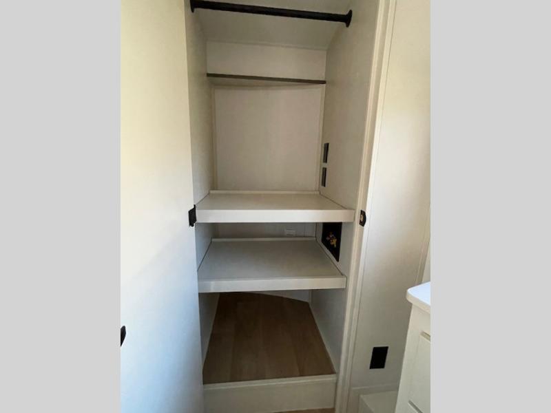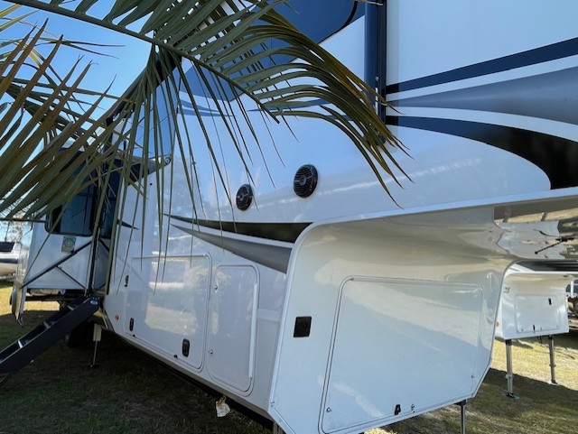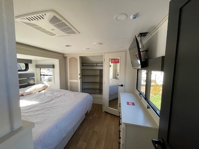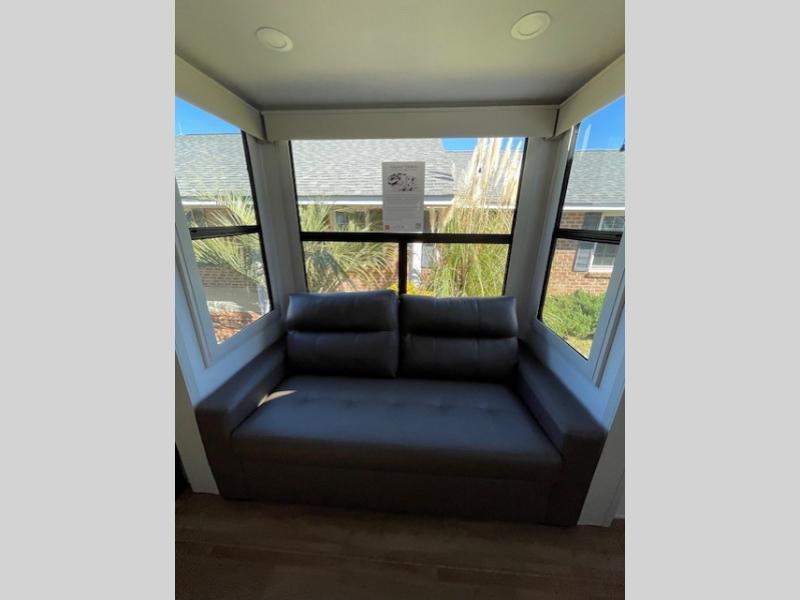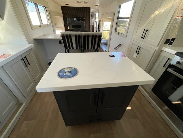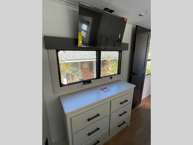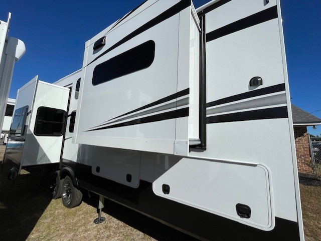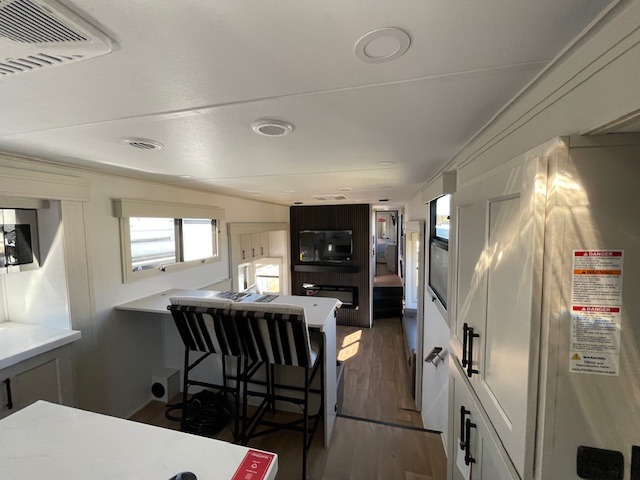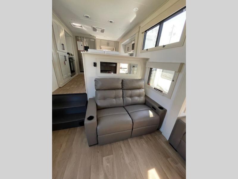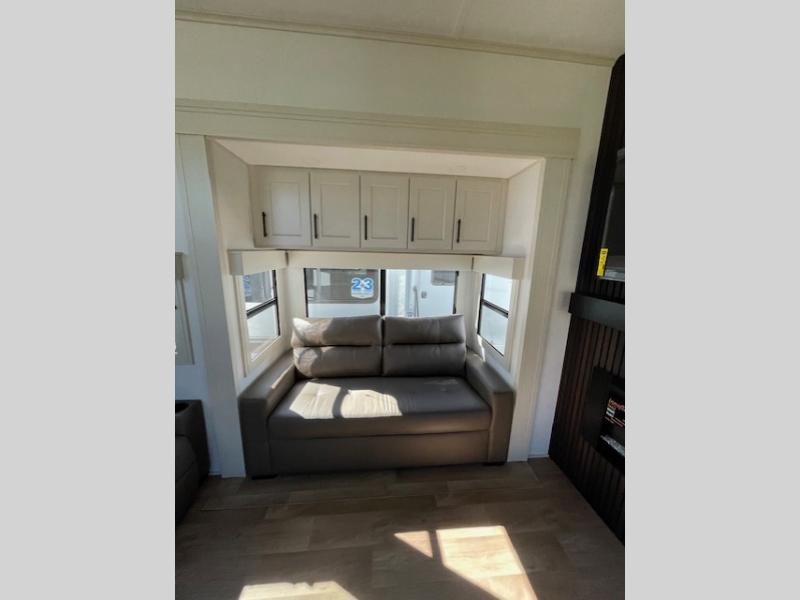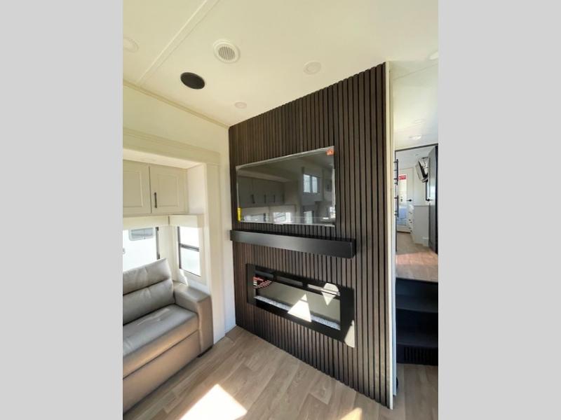 Enjoy each and every vacation, month-long trips, or even extended stays at an RV park in this spacious fifth wheel! The raised rear kitchen gives the cook plenty of room to whip up any type of meal using the stainless steel appliances including a built-in oven, an oversized pantry, and the raised bar top will provide you even more counter space on top of dining with two chairs that overlook the middle living area. Relaxing is made easy thanks to two tri-fold sofas and theatre seating while watching the big game on the LED Smart TV and enjoying the fireplace below. At night, retire to your own queen bed which slides out to provide more floor space, and you can store your clothes in the slide top dresser and front closet with washer and dryer prep.