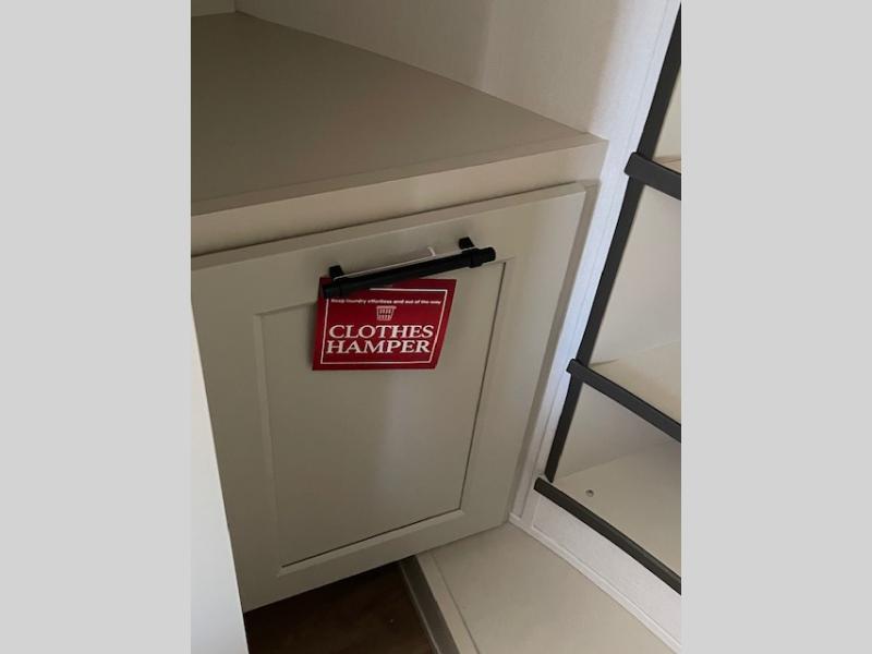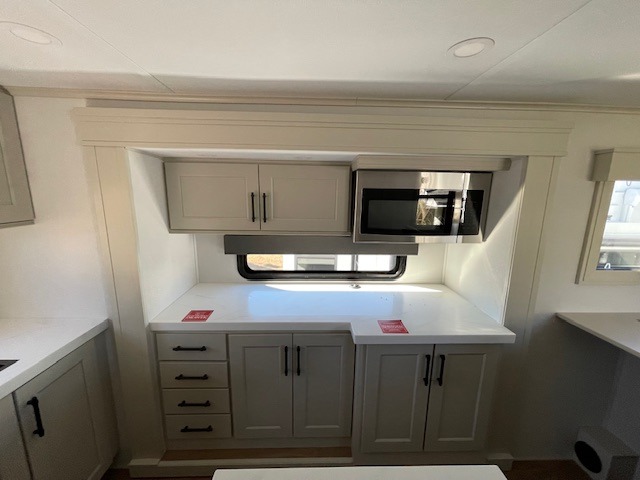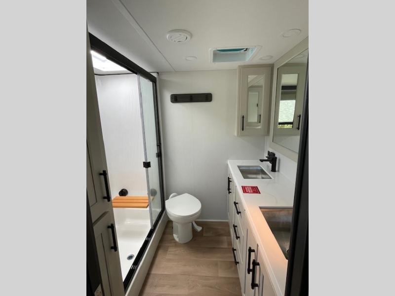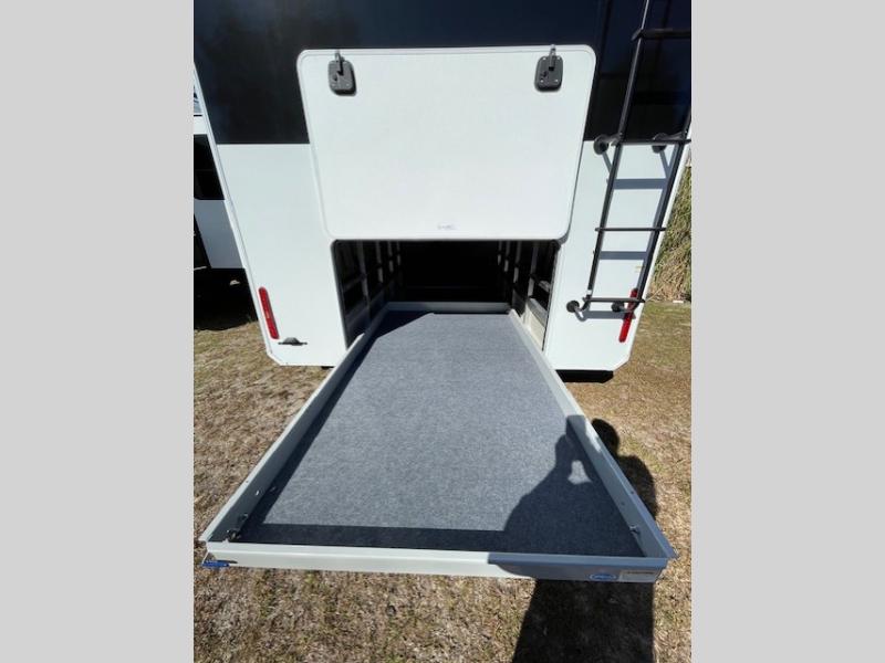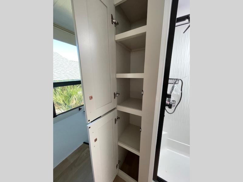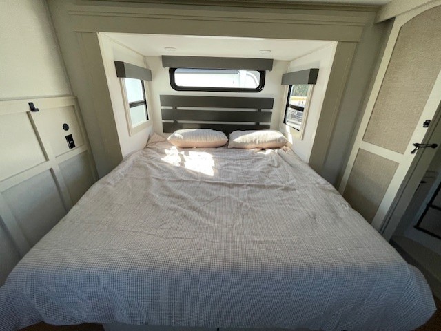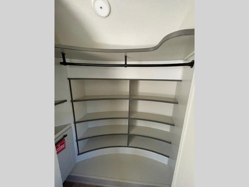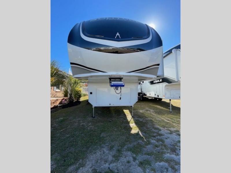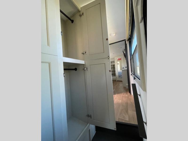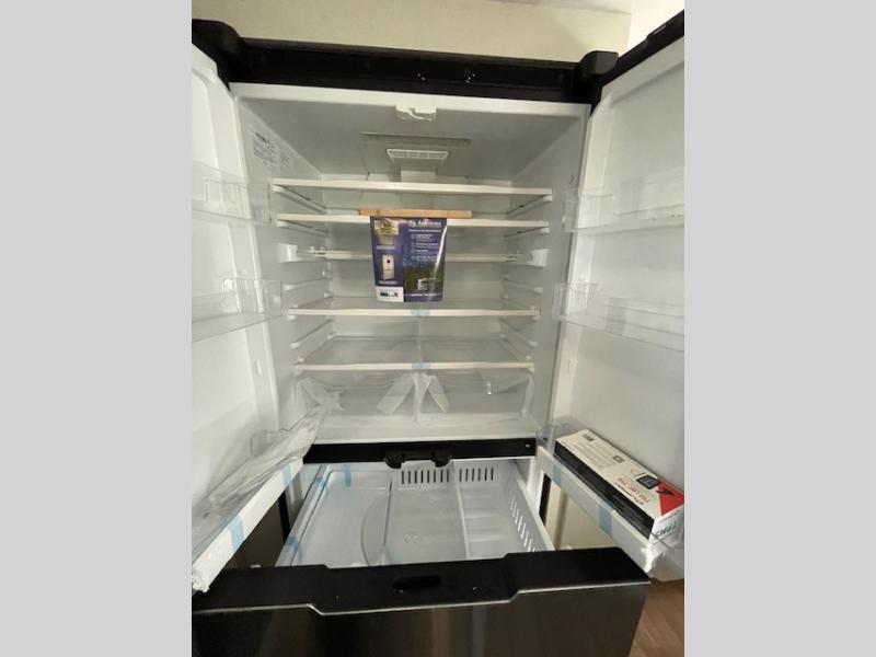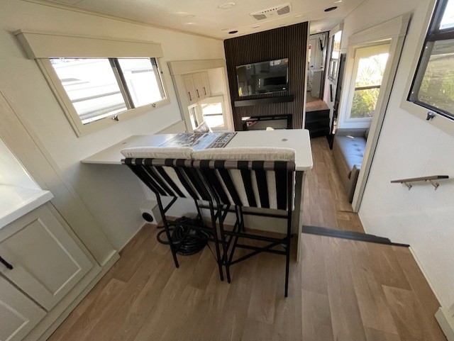 Enjoy each and every vacation, month-long trips, or even extended stays at an RV park in this spacious fifth wheel! The raised rear kitchen gives the cook plenty of room to whip up any type of meal using the stainless steel appliances including a built-in oven, an oversized pantry, and the raised bar top will provide you even more counter space on top of dining with two chairs that overlook the middle living area. Relaxing is made easy thanks to two tri-fold sofas and theatre seating while watching the big game on the LED Smart TV and enjoying the fireplace below. At night, retire to your own queen bed which slides out to provide more floor space, and you can store your clothes in the slide top dresser and front closet with washer and dryer prep.