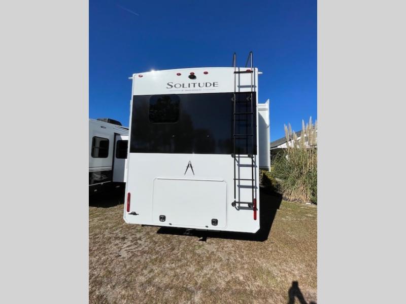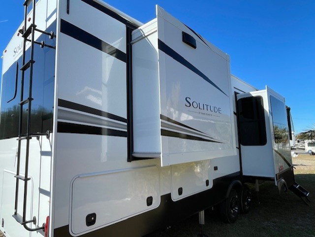 Each Solitude fifth wheel by Grand Design features a 101" wide-body construction, heavy duty 8,000 lb. axles, frameless tinted windows, and high-gloss gel coat sidewalls. You can camp year around thanks to the Weather-Tek Package that includes a 35K BTU high-capacity furnace, an all-in-one enclosed and heated utility center, and a fully enclosed underbelly with heated tanks and storage. Inside, you'll love the premium roller shades, hardwood cabinet doors, solid surface countertops, plus residential finishes throughout to make you truly feel at home. Each model also includes a MORryde CRE3000 suspension system, self adjusting brakes, and a MORryde pin box that will provide smooth towing from home to campground. Affordable luxury is possible with the Solitude fifth wheels; choose yours today!