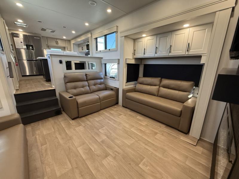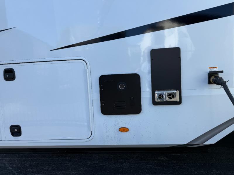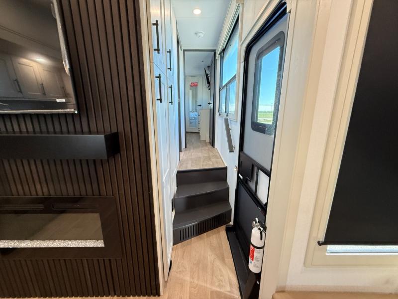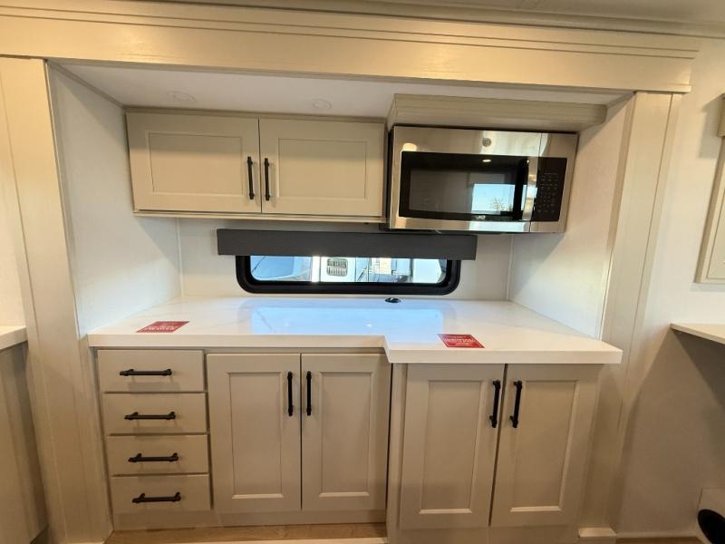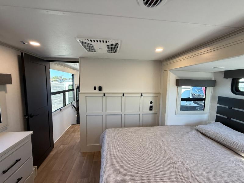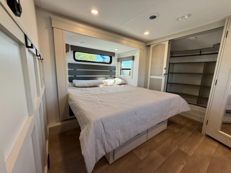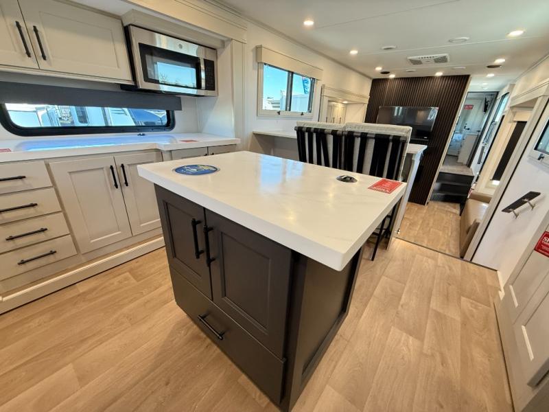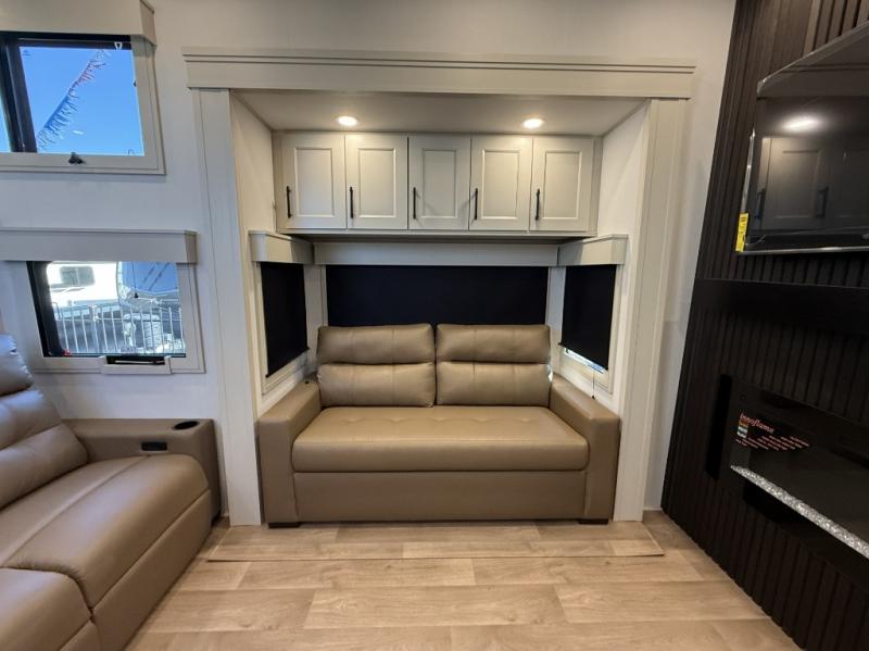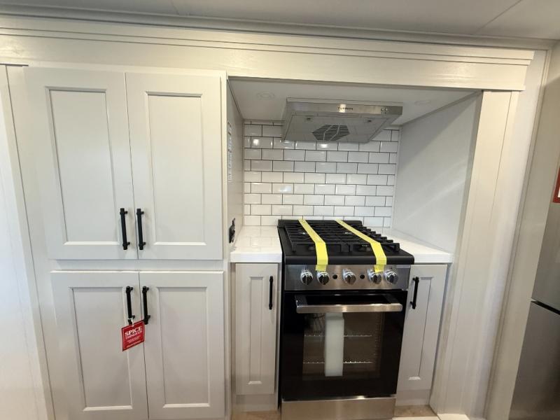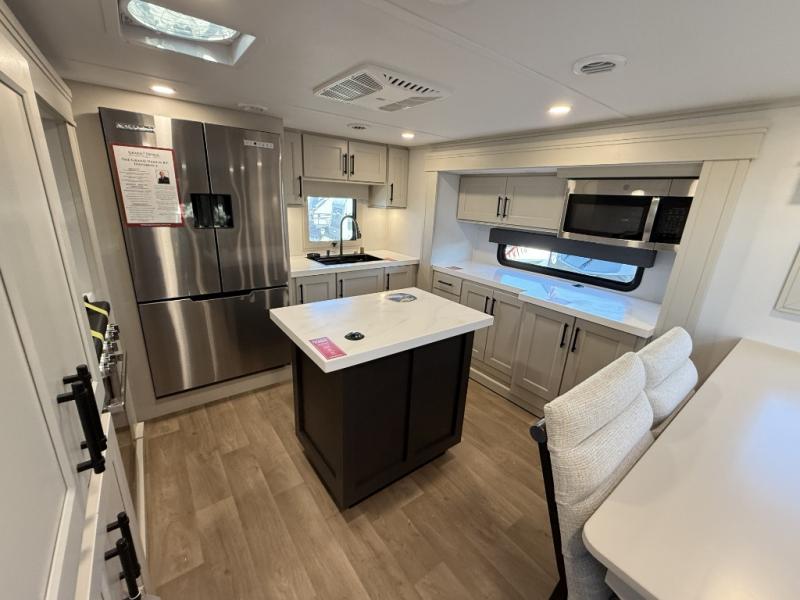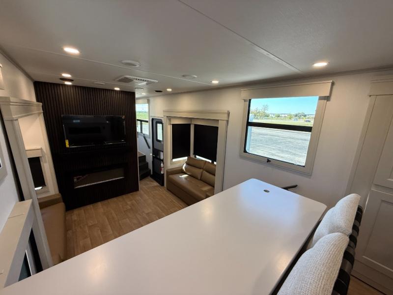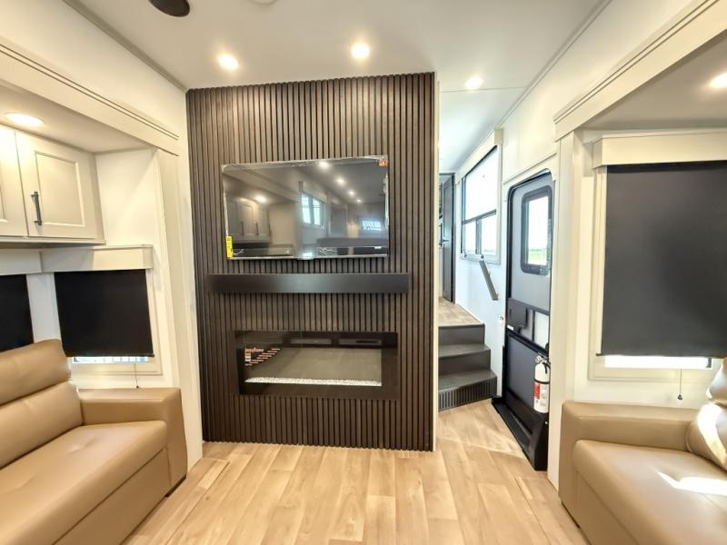 Enjoy each and every vacation, month-long trips, or even extended stays at an RV park in this spacious fifth wheel! The raised rear kitchen gives the cook plenty of room to whip up any type of meal using the stainless steel appliances including a built-in oven, an oversized pantry, and the raised bar top will provide you even more counter space on top of dining with two chairs that overlook the middle living area. Relaxing is made easy thanks to two tri-fold sofas and theatre seating while watching the big game on the LED Smart TV and enjoying the fireplace below. At night, retire to your own queen bed which slides out to provide more floor space, and you can store your clothes in the slide top dresser and front closet with washer and dryer prep.