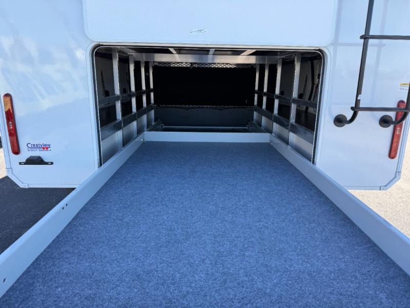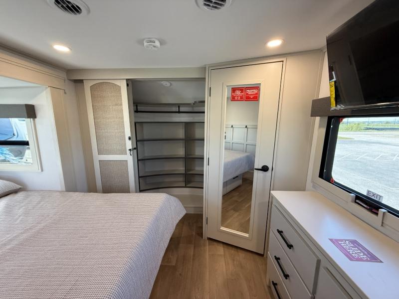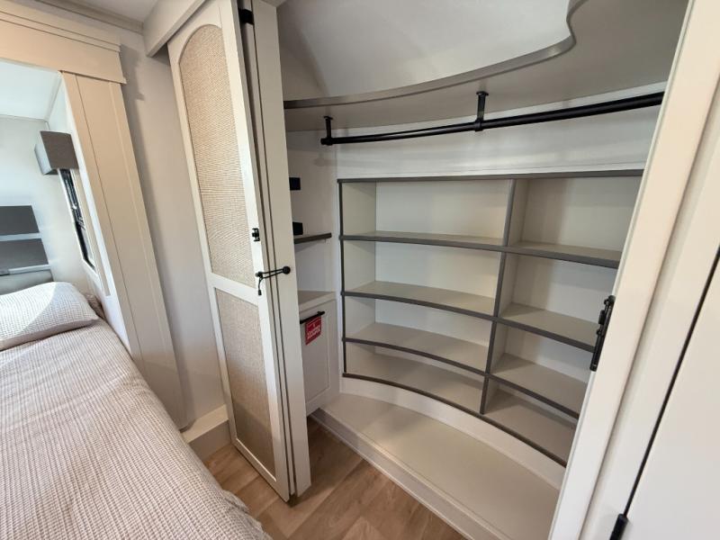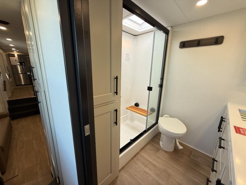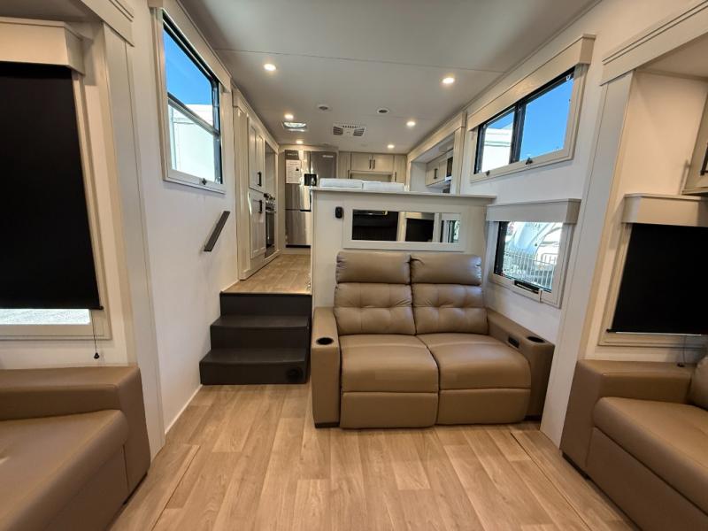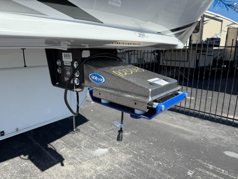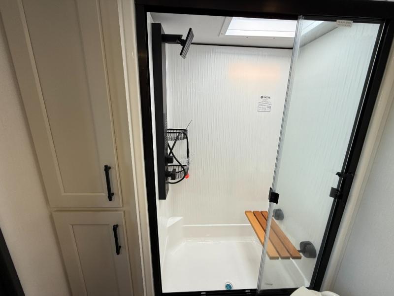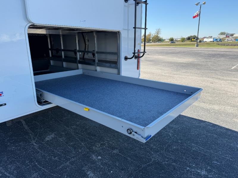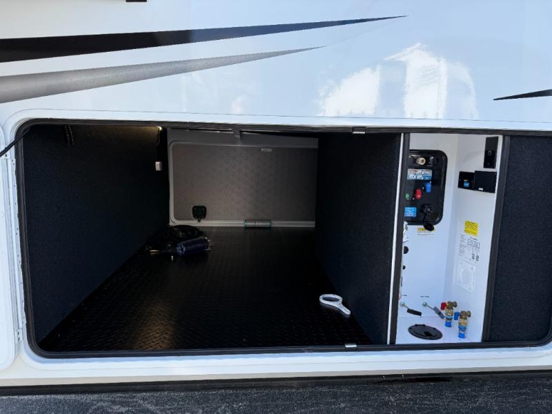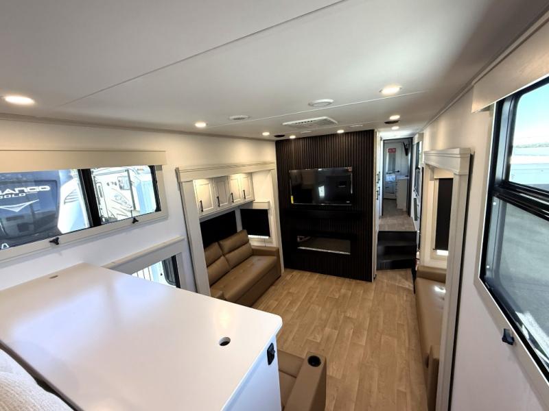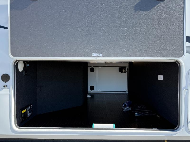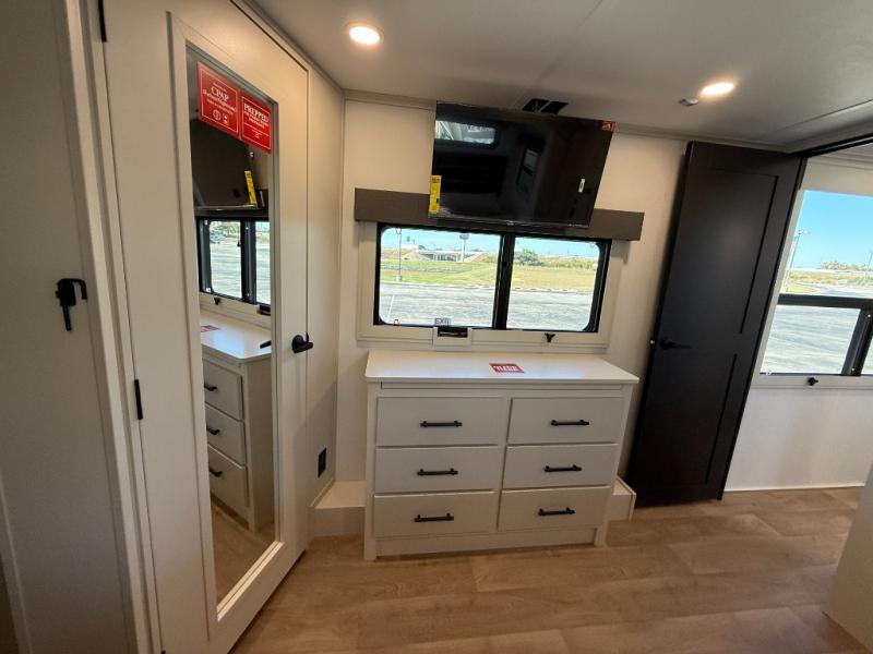 Enjoy each and every vacation, month-long trips, or even extended stays at an RV park in this spacious fifth wheel! The raised rear kitchen gives the cook plenty of room to whip up any type of meal using the stainless steel appliances including a built-in oven, an oversized pantry, and the raised bar top will provide you even more counter space on top of dining with two chairs that overlook the middle living area. Relaxing is made easy thanks to two tri-fold sofas and theatre seating while watching the big game on the LED Smart TV and enjoying the fireplace below. At night, retire to your own queen bed which slides out to provide more floor space, and you can store your clothes in the slide top dresser and front closet with washer and dryer prep.