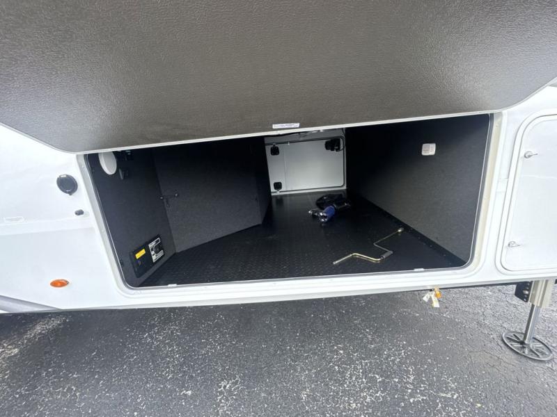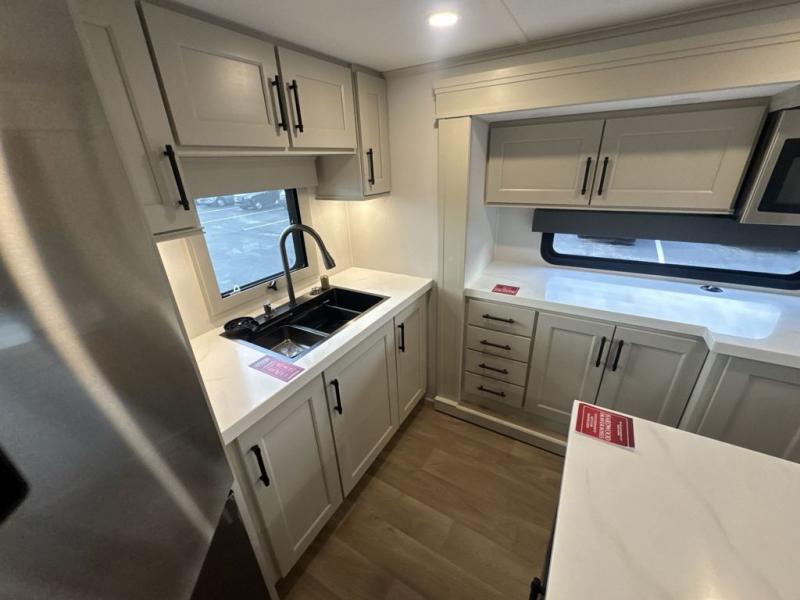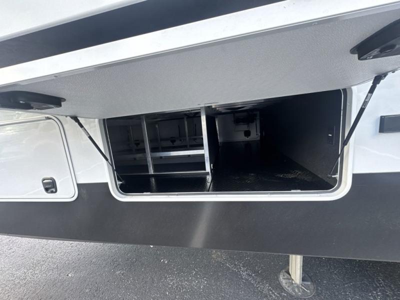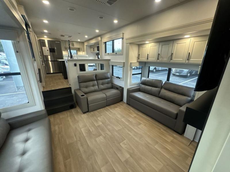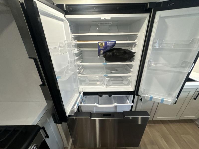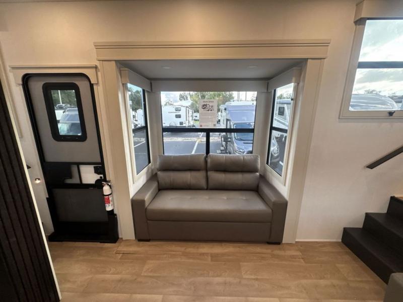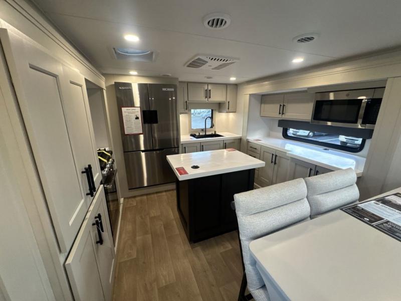 Enjoy each and every vacation, month-long trips, or even extended stays at an RV park in this spacious fifth wheel! The raised rear kitchen gives the cook plenty of room to whip up any type of meal using the stainless steel appliances including a built-in oven, an oversized pantry, and the raised bar top will provide you even more counter space on top of dining with two chairs that overlook the middle living area. Relaxing is made easy thanks to two tri-fold sofas and theatre seating while watching the big game on the LED Smart TV and enjoying the fireplace below. At night, retire to your own queen bed which slides out to provide more floor space, and you can store your clothes in the slide top dresser and front closet with washer and dryer prep.