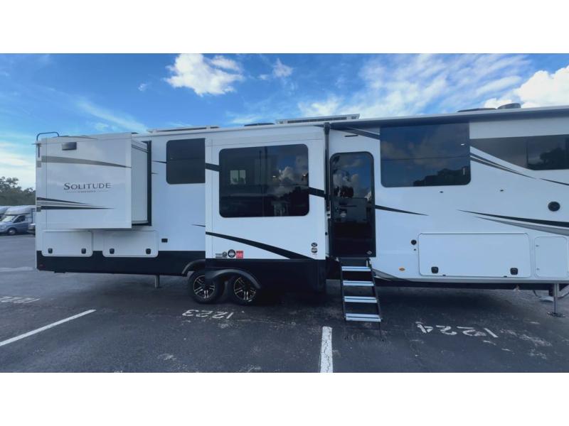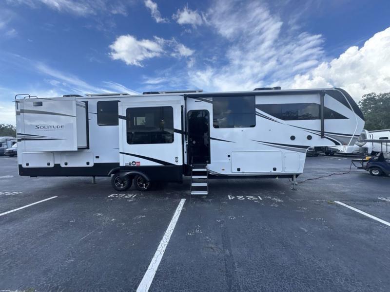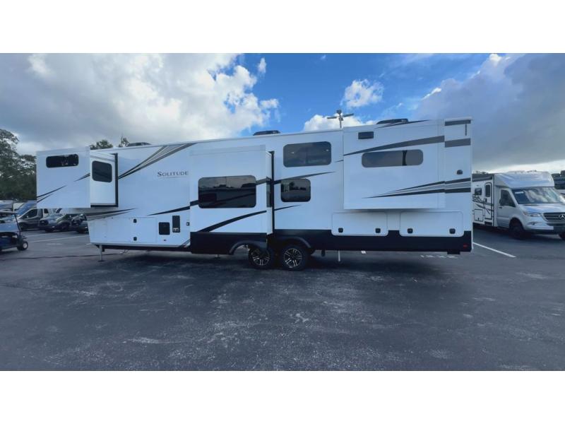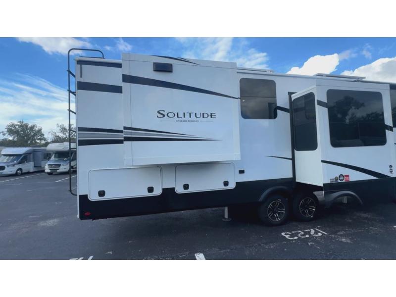 Each Solitude fifth wheel by Grand Design features a 101" wide-body construction, heavy duty 8,000 lb. axles, frameless tinted windows, and high-gloss gel coat sidewalls. You can camp year around thanks to the Weather-Tek Package that includes a 35K BTU high-capacity furnace, an all-in-one enclosed and heated utility center, and a fully enclosed underbelly with heated tanks and storage. Inside, you'll love the premium roller shades, hardwood cabinet doors, solid surface countertops, plus residential finishes throughout to make you truly feel at home. Each model also includes a MORryde CRE3000 suspension system, self adjusting brakes, and a MORryde pin box that will provide smooth towing from home to campground. Affordable luxury is possible with the Solitude fifth wheels; choose yours today!