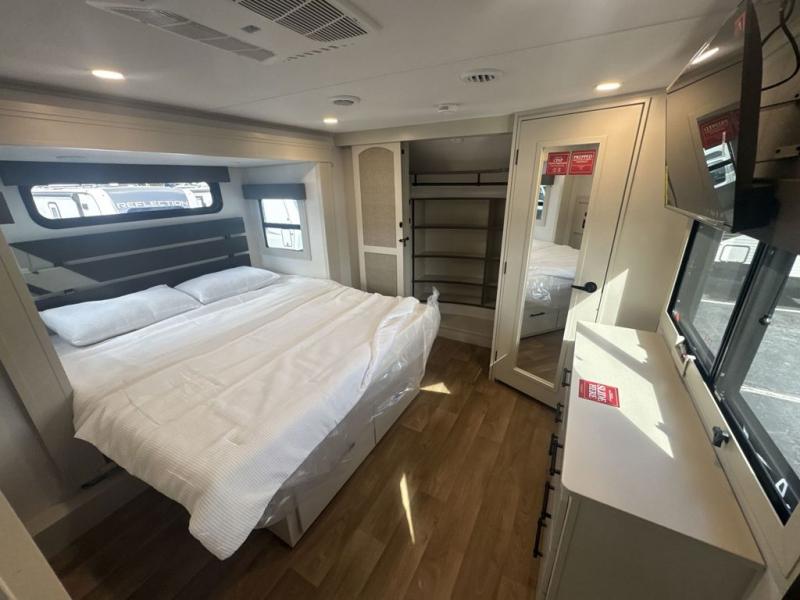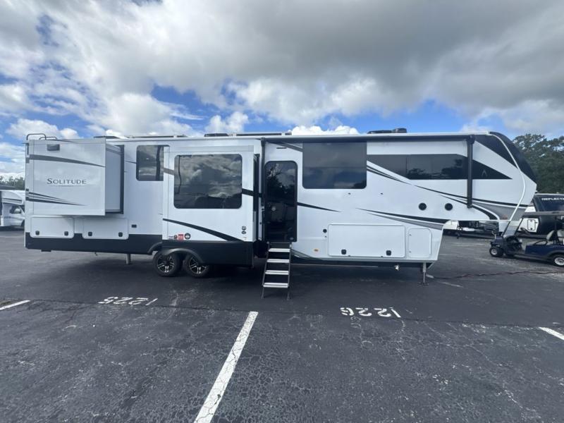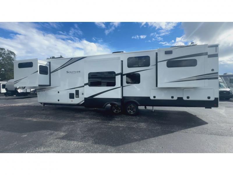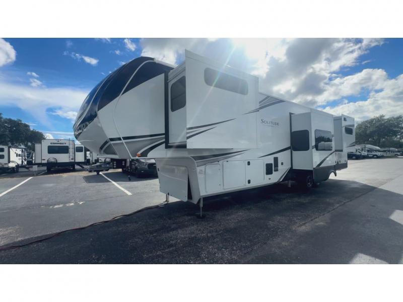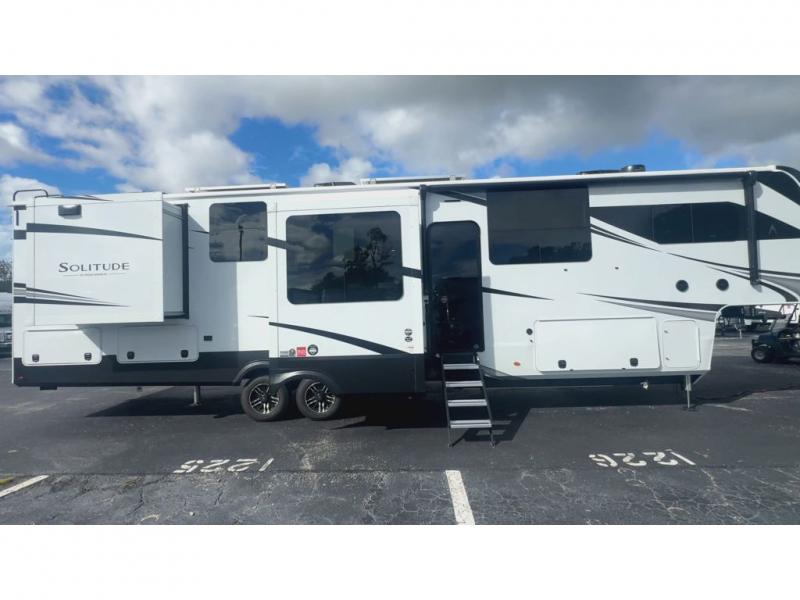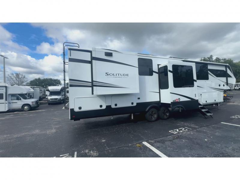 Each Solitude fifth wheel by Grand Design features a 101" wide-body construction, heavy duty 8,000 lb. axles, frameless tinted windows, and high-gloss gel coat sidewalls. You can camp year around thanks to the Weather-Tek Package that includes a 35K BTU high-capacity furnace, an all-in-one enclosed and heated utility center, and a fully enclosed underbelly with heated tanks and storage. Inside, you'll love the premium roller shades, hardwood cabinet doors, solid surface countertops, plus residential finishes throughout to make you truly feel at home. Each model also includes a MORryde CRE3000 suspension system, self adjusting brakes, and a MORryde pin box that will provide smooth towing from home to campground. Affordable luxury is possible with the Solitude fifth wheels; choose yours today!