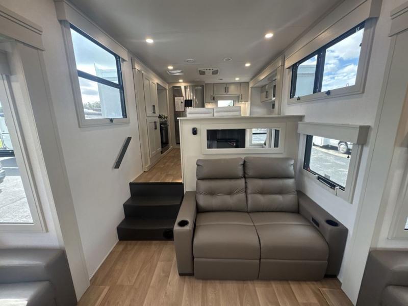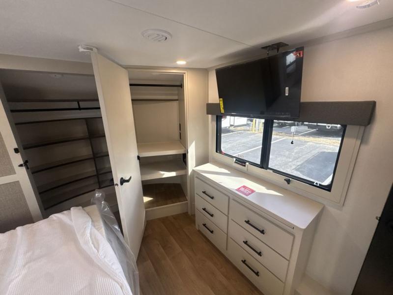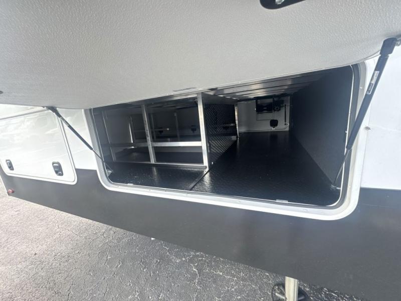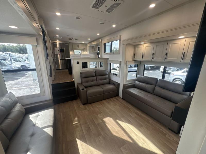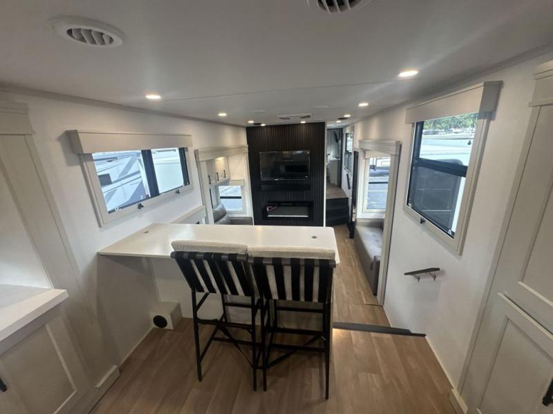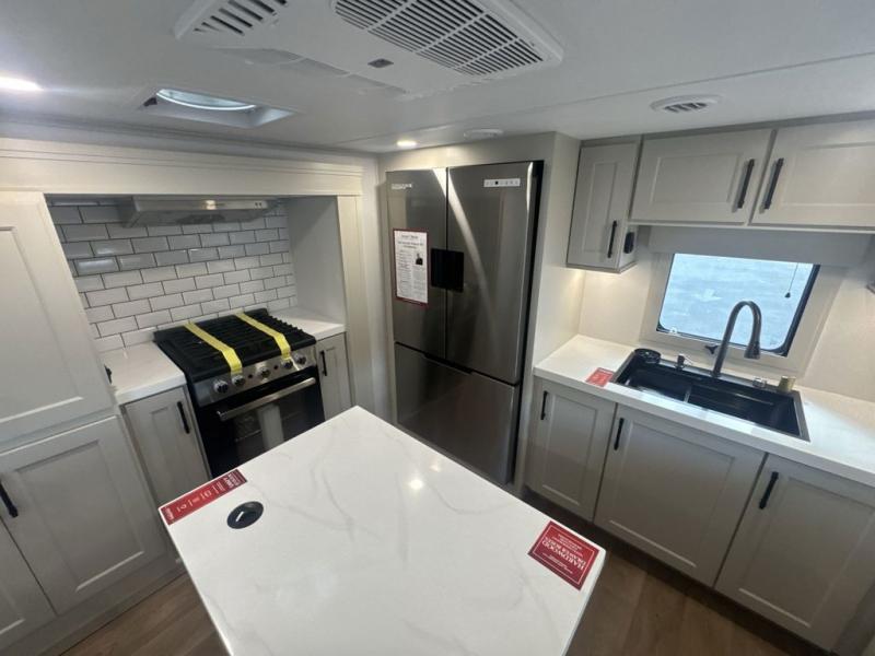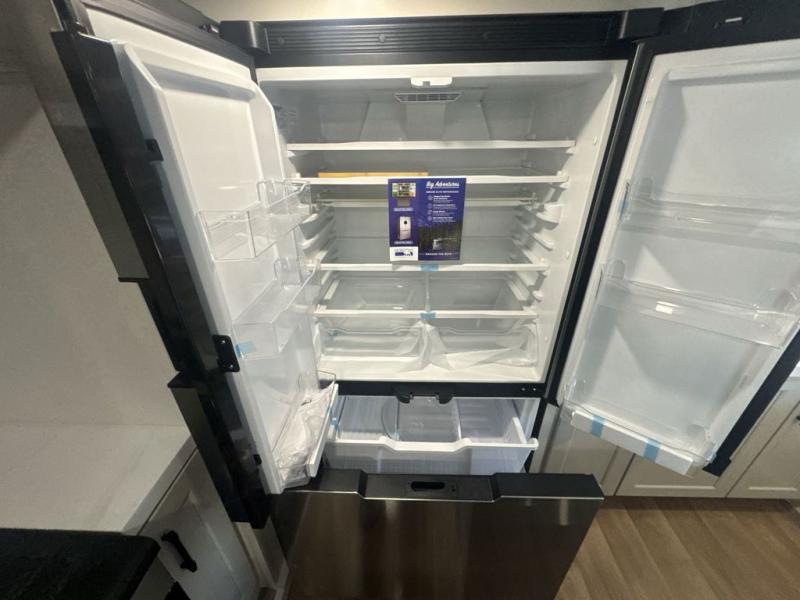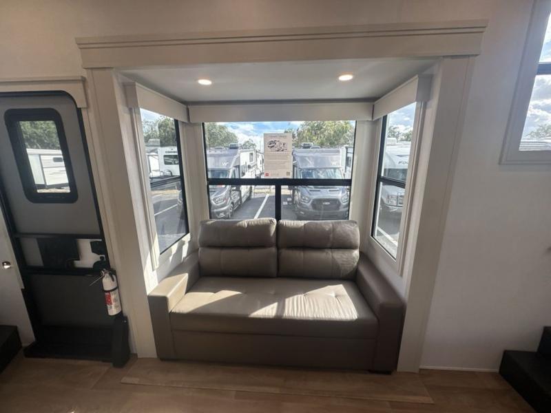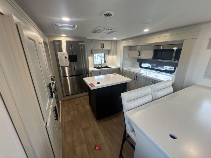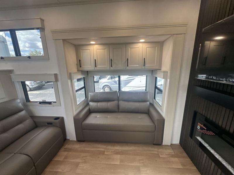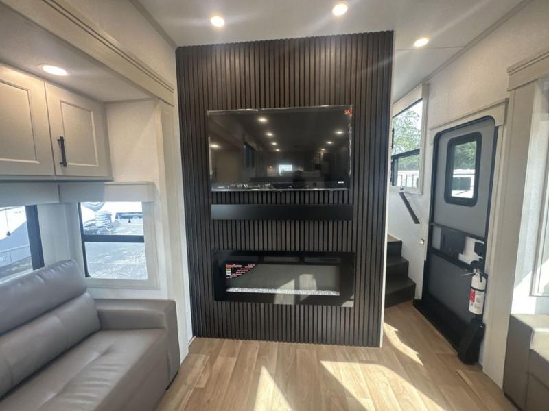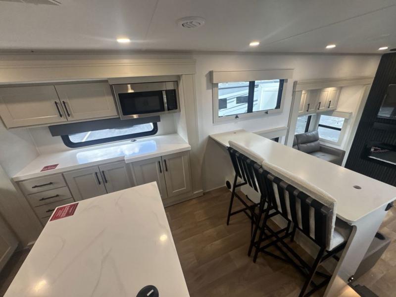 Enjoy each and every vacation, month-long trips, or even extended stays at an RV park in this spacious fifth wheel! The raised rear kitchen gives the cook plenty of room to whip up any type of meal using the stainless steel appliances including a built-in oven, an oversized pantry, and the raised bar top will provide you even more counter space on top of dining with two chairs that overlook the middle living area. Relaxing is made easy thanks to two tri-fold sofas and theatre seating while watching the big game on the LED Smart TV and enjoying the fireplace below. At night, retire to your own queen bed which slides out to provide more floor space, and you can store your clothes in the slide top dresser and front closet with washer and dryer prep.