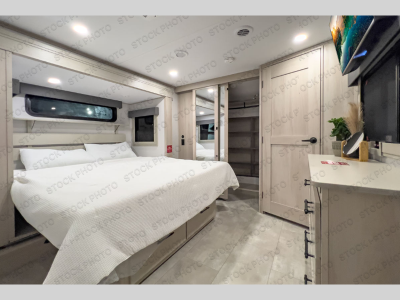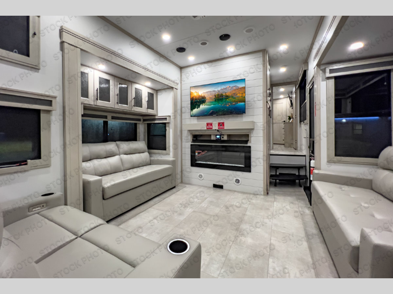 Enjoy each and every vacation, month-long trips, or even extended stays at an RV park in this spacious fifth wheel! The raised rear kitchen gives the cook plenty of room to whip up any type of meal using the stainless steel appliances including a built-in oven, an oversized pantry, and the raised bar top will provide you even more counter space on top of dining with two chairs that overlook the middle living area. Relaxing is made easy thanks to two tri-fold sofas and theatre seating while watching the big game on the LED Smart TV and enjoying the fireplace below. At night, retire to your own queen bed which slides out to provide more floor space, and you can store your clothes in the slide top dresser and front closet with washer and dryer prep.