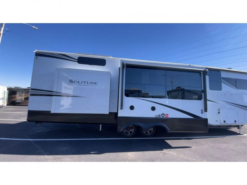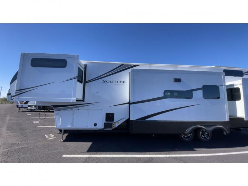 Each Solitude fifth wheel by Grand Design features a 101" wide-body construction, heavy duty 8,000 lb. axles, frameless tinted windows, and high-gloss gel coat sidewalls. You can camp year around thanks to the Weather-Tek Package that includes a 35K BTU high-capacity furnace, an all-in-one enclosed and heated utility center, and a fully enclosed underbelly with heated tanks and storage. Inside, you'll love the premium roller shades, hardwood cabinet doors, solid surface countertops, plus residential finishes throughout to make you truly feel at home. Each model also includes a MORryde CRE3000 suspension system, self adjusting brakes, and a MORryde pin box that will provide smooth towing from home to campground. Affordable luxury is possible with the Solitude fifth wheels; choose yours today!