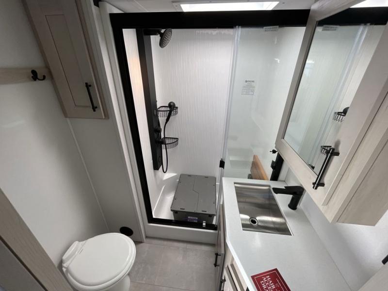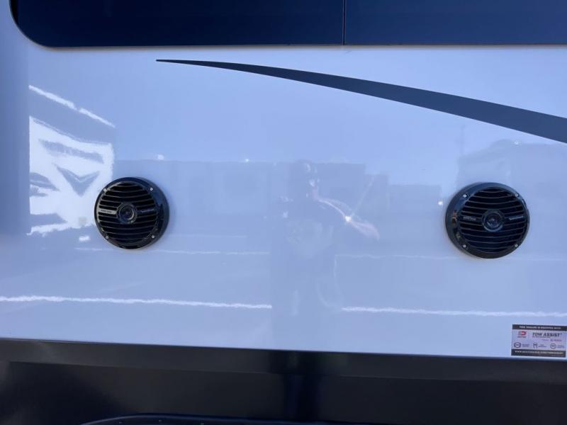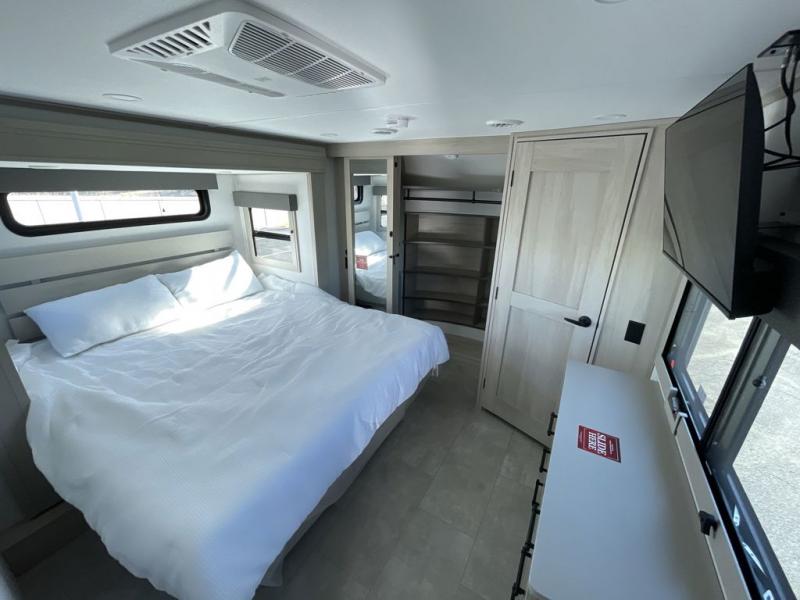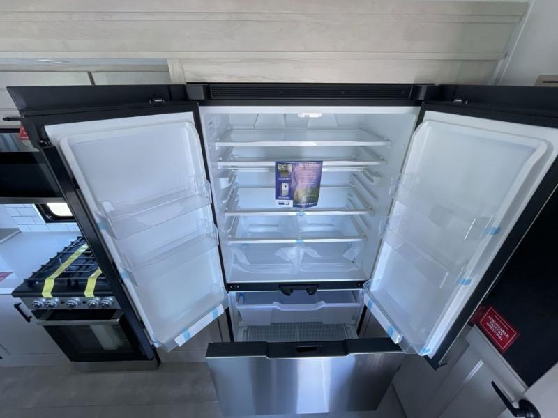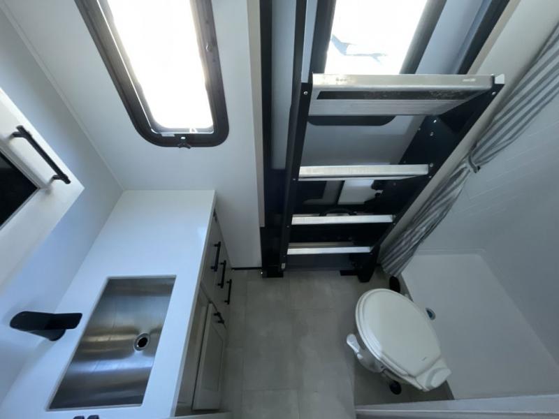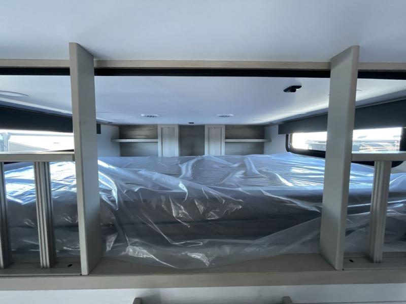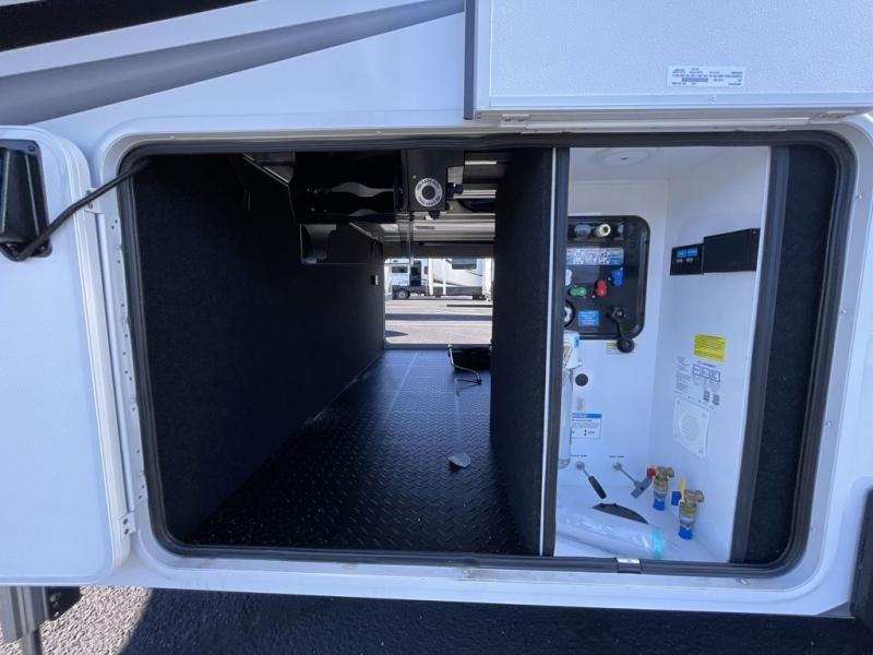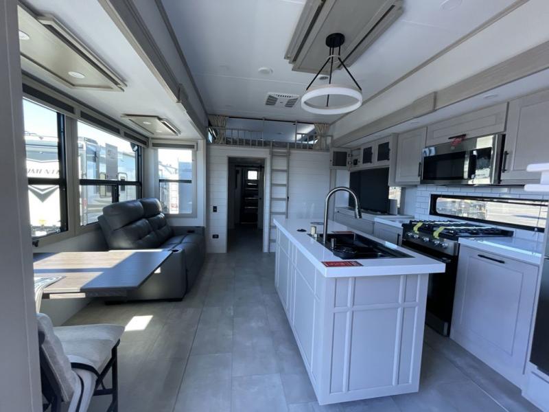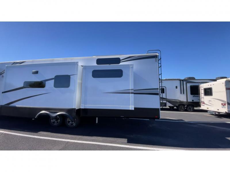 For an affordable luxury extended stay for your family, this Solitude is it! Two private bedrooms plus an overhead Sky Suite loft above the rear bedroom which also has it's own private rear entry/exit door is just the beginning of what is in store for your camping convenience. The upscale kitchen features an island with dishwasher prep, a smart sink, a 12V 20 cu. ft. refrigerator for your perishables, and a built-in oven. There is also a microwave, pantry, and hutch for your dishes, plus a free standing dinette! You can easily take along extra family and friends with the second private bedroom featuring it's own private bath and entry which is great for another couple, and there is even loft space above this rear private bedroom for added storage or sleeping for children. And, you will find ample storage for clothing and belongings throughout with nice size closets, overhead cabinets, plus loads of outside storage.