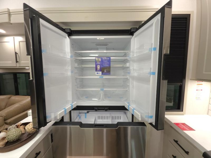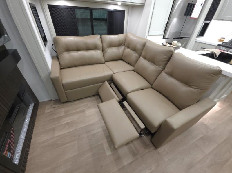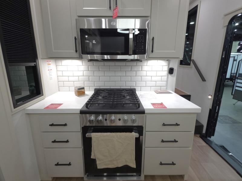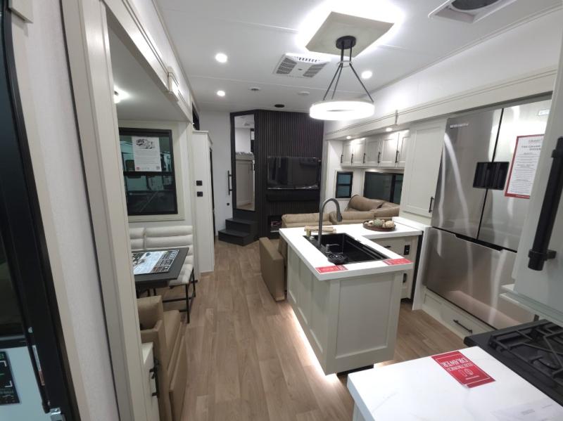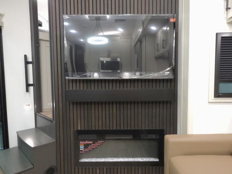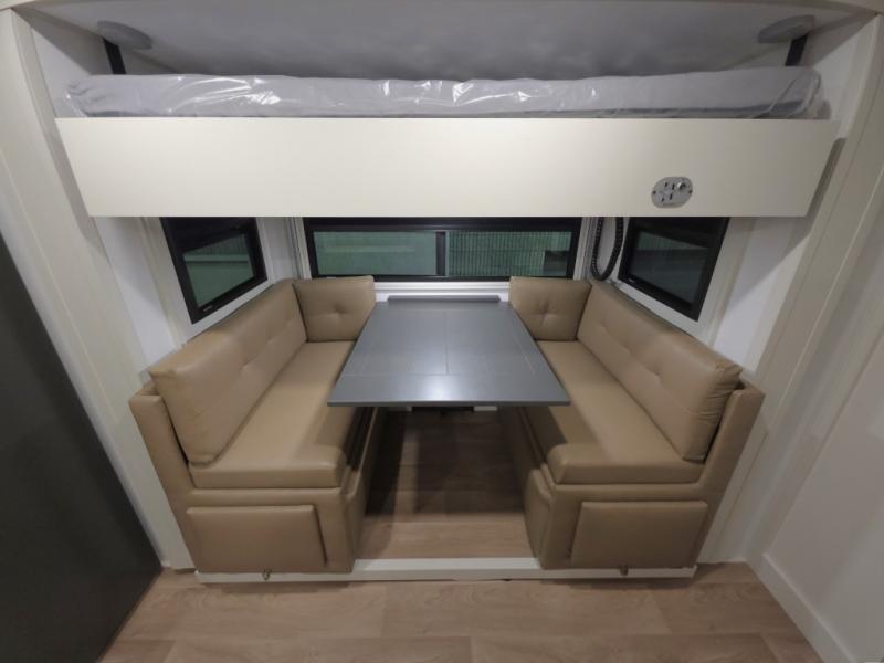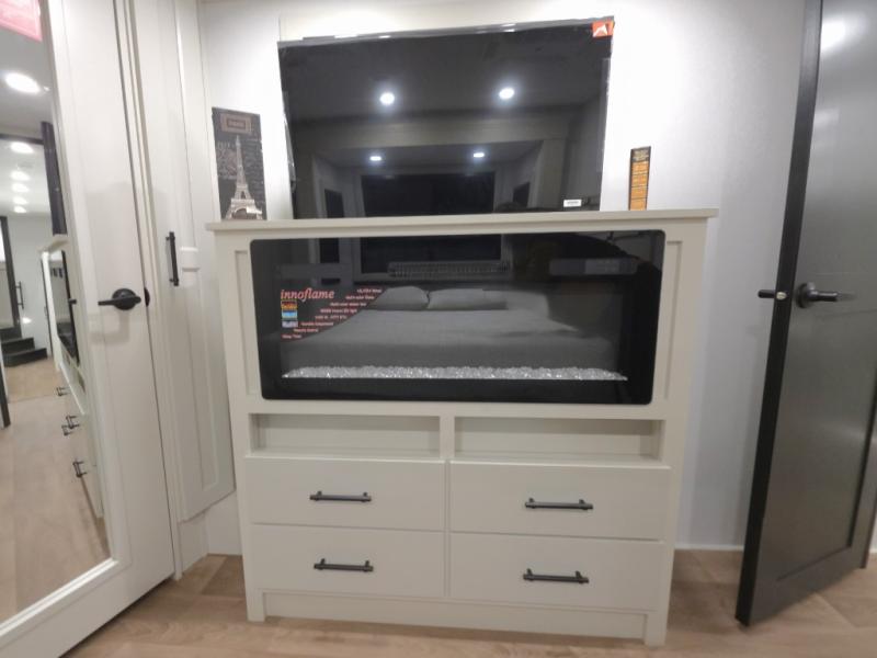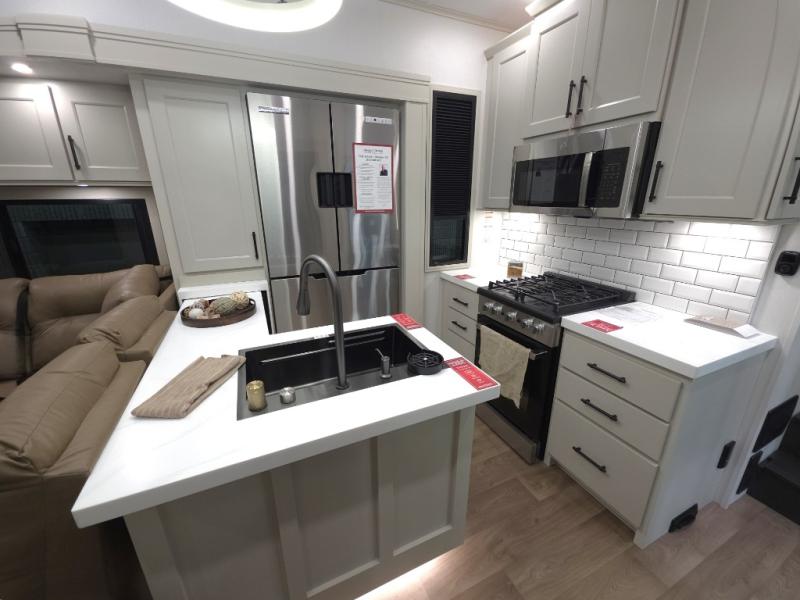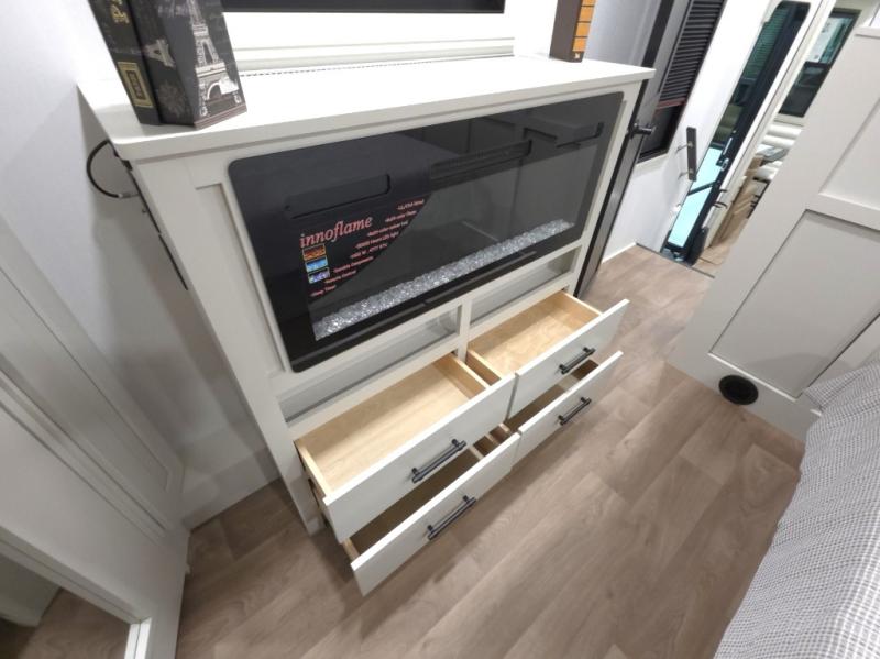 The mid-kitchen features a 20 cu. ft. refrigerator, free-standing dinette, and plenty of counter space for meal prep. Combined with a fireplace and residential finishes, it’s the perfect space to cook, dine, and relax in total comfort.