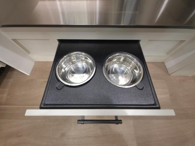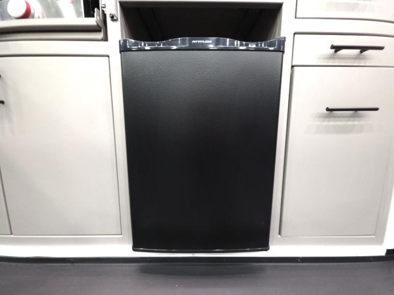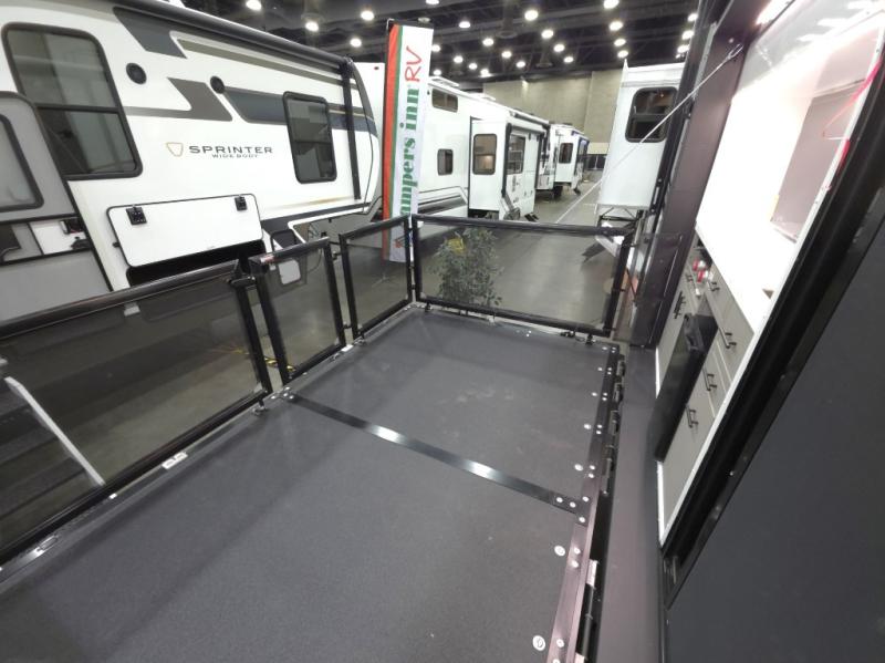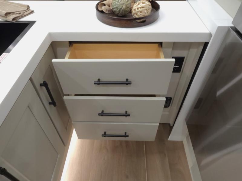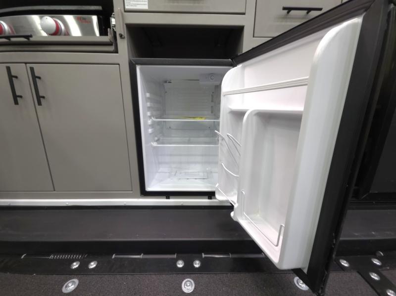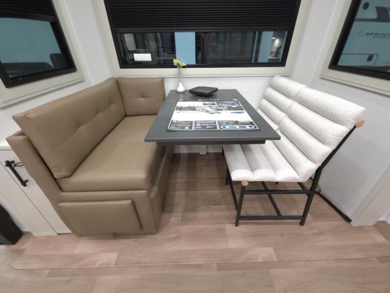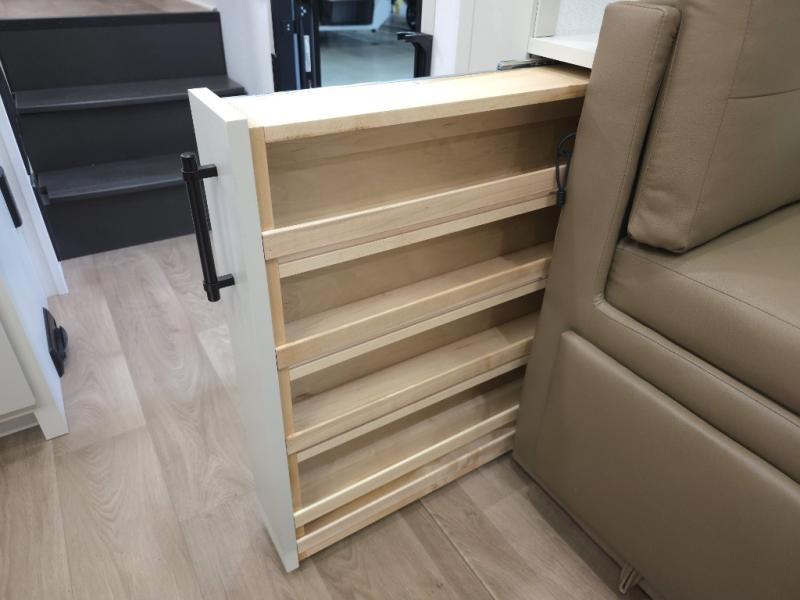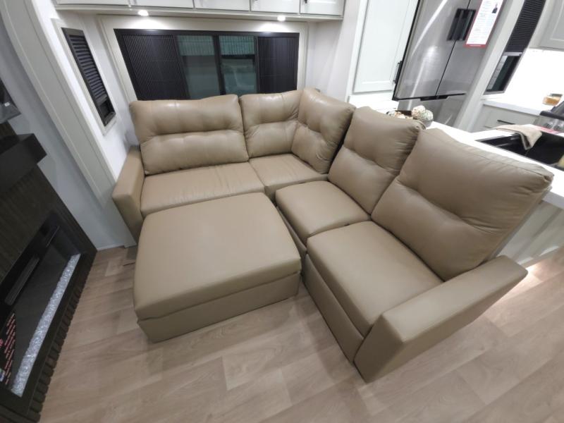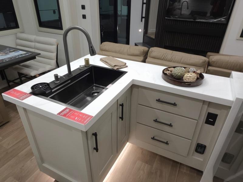 The mid-kitchen features a 20 cu. ft. refrigerator, free-standing dinette, and plenty of counter space for meal prep. Combined with a fireplace and residential finishes, it’s the perfect space to cook, dine, and relax in total comfort.