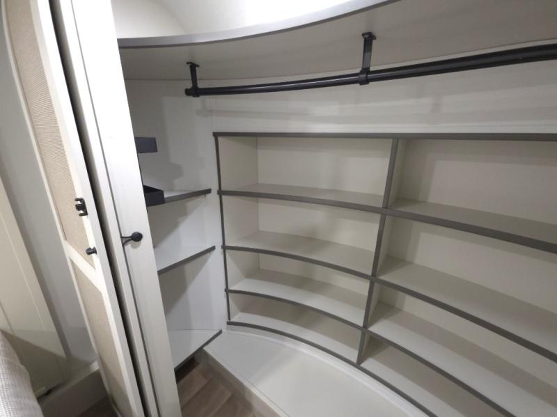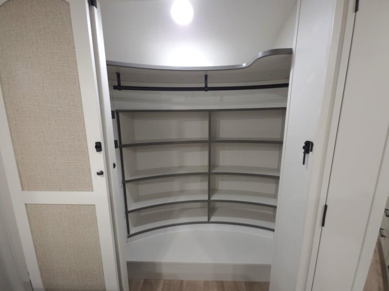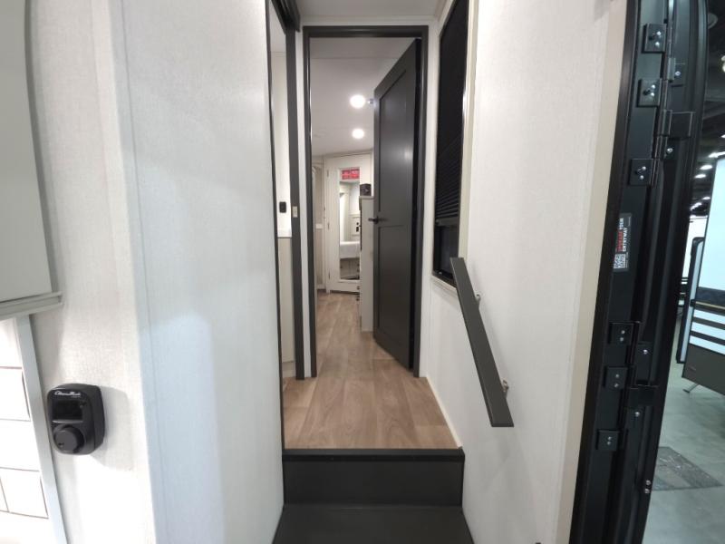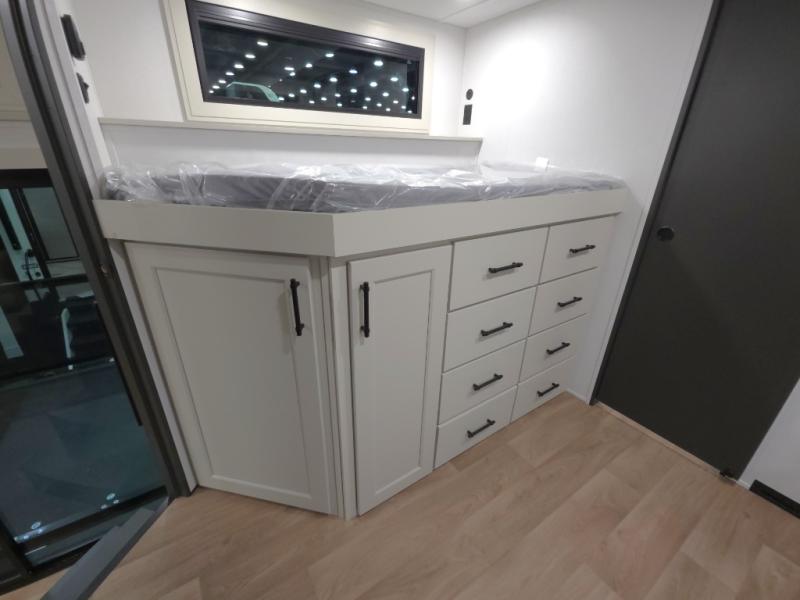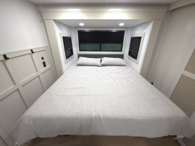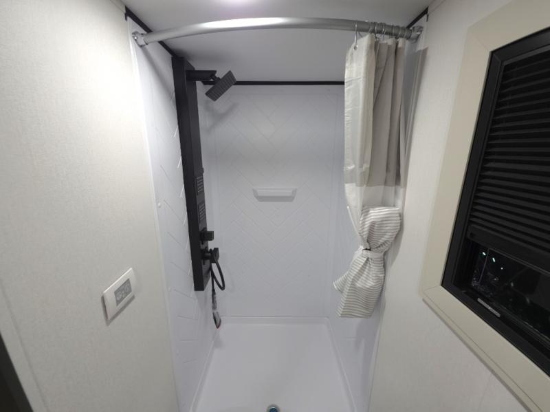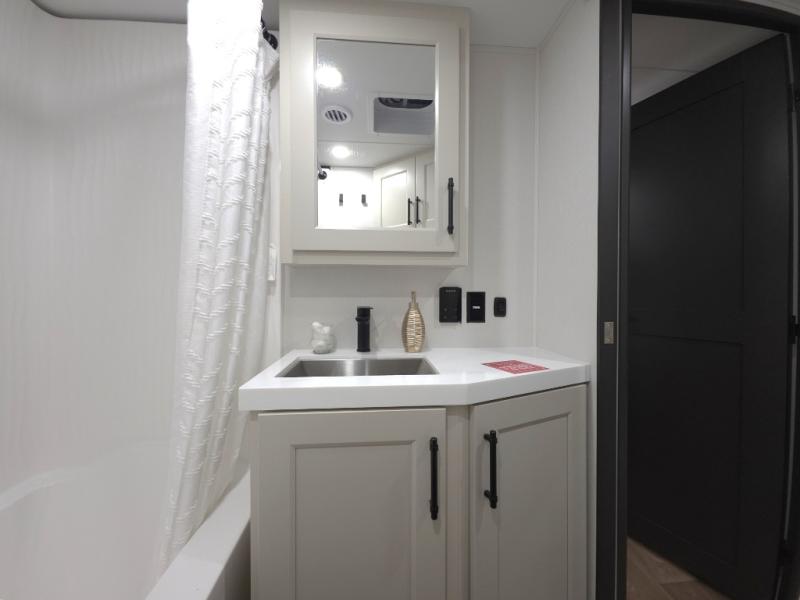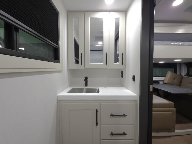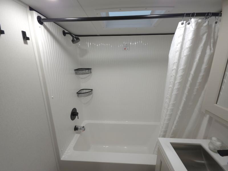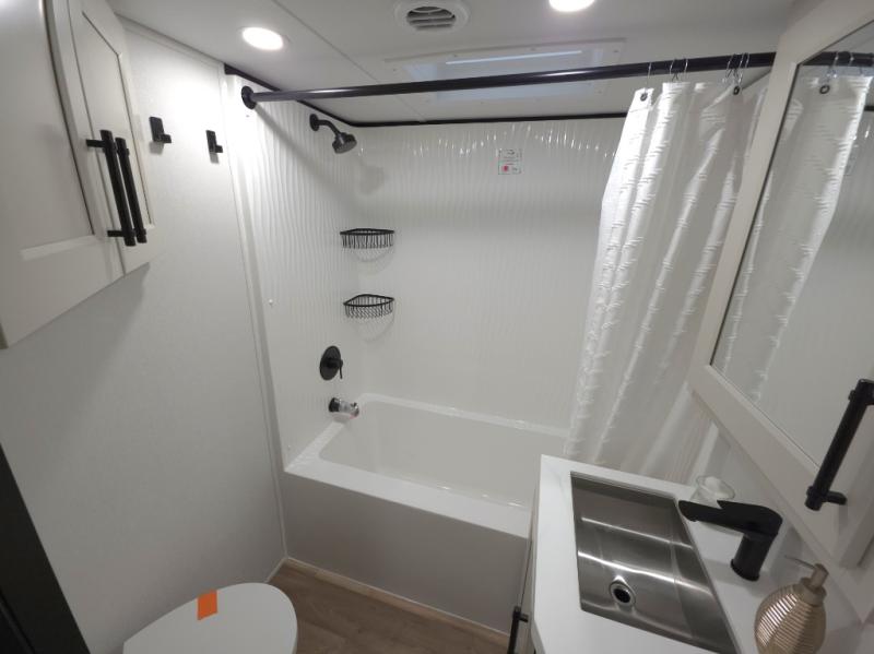 Traveling with family or guests? You’ll love having two full bathrooms, including a luxurious master bath with a soaking tub—a rare find in RVs. The rear bath offers quick access from the bunkhouse or patio area, ensuring everyone has their own space.