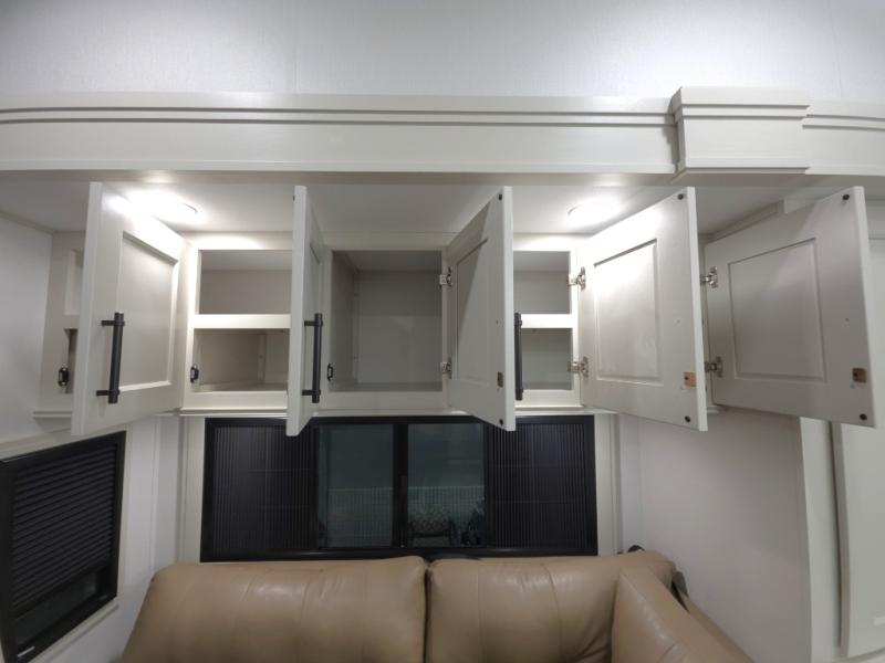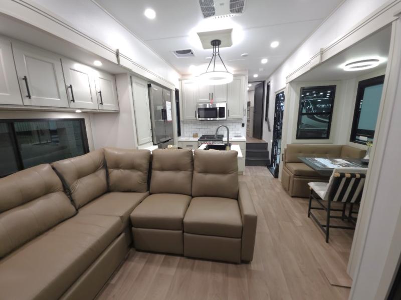 Built to handle long hauls and extended adventures, the Solitude 414LJMJ is equipped with a laminated construction, three heavy-duty axles, and ST215/75R 17.5LRH tires for stability and strength. With a UVW of 19,000 lbs and a GVWR of 23,500 lbs, this model is engineered for confident towing and long-lasting reliability.