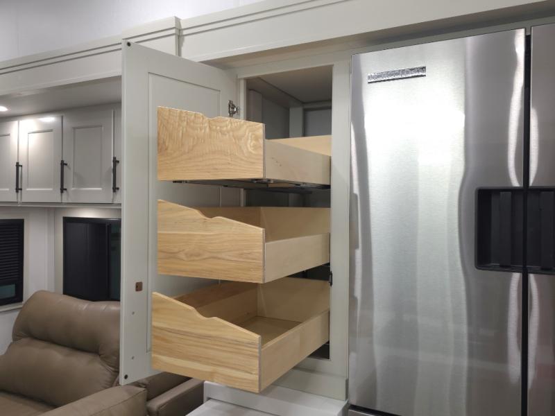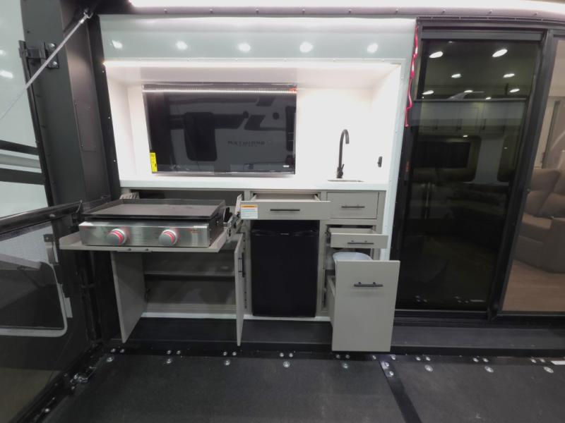 Enjoy three power awnings for shaded comfort, an LPG capacity of 60 lbs, and a universal docking station for added convenience. Whether relaxing on the patio or grilling at the outdoor kitchen, this Solitude was built for memorable moments.