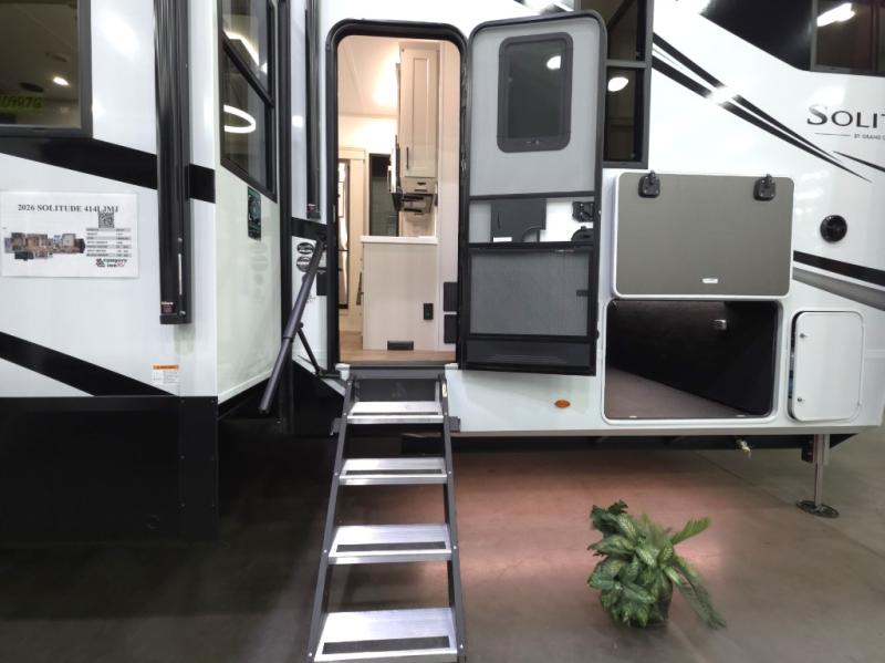 Experience the perfect balance of residential luxury and outdoor adventure in the 2026 Grand Design Solitude 414LJMJ. Designed for those who crave space, comfort, and sophistication, this stunning fifth wheel takes upscale RV living to a whole new level. With a side patio for entertaining, two full bathrooms, and a rear bunkhouse, this model is built for families and travelers who expect more from their home on the road. Whether you’re exploring scenic highways or setting up camp for a long stay, the Solitude 414LJMJ ensures you do it in style.
