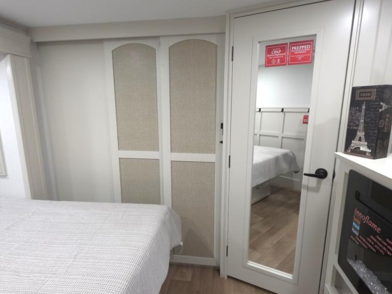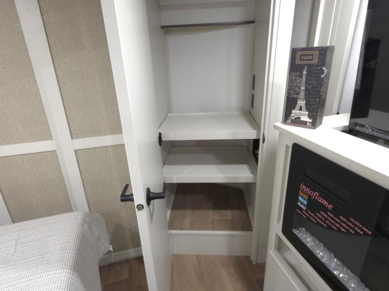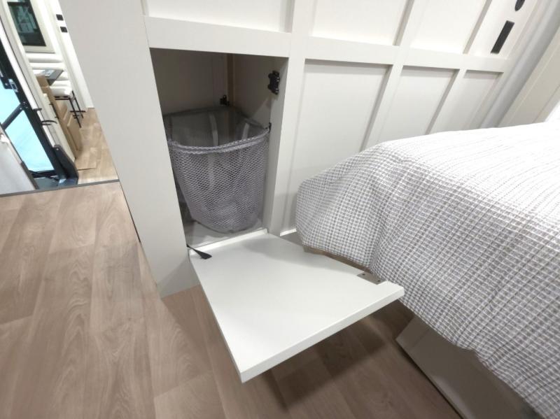 Enjoy a peaceful retreat in the front king bedroom (70" x 80") featuring a 40-inch TV, pass-thru clothes hamper, and washer/dryer prep. The attention to detail creates a truly residential feel, blending comfort and function for full-time or extended-stay living.