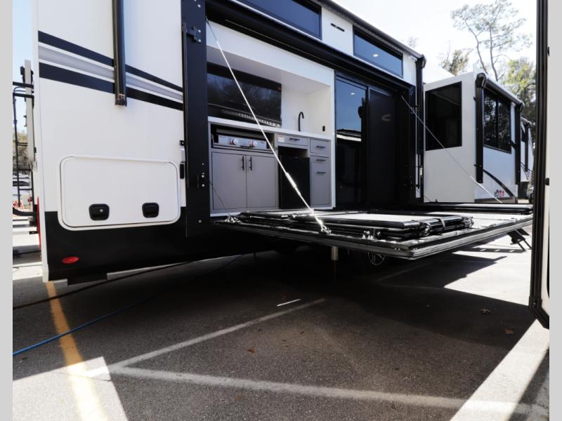 • Exclusive Side Party Patio with exterior entertainment system, large flat-screen TV, refrigerator, sink, and outdoor cooking skillet — perfect for tailgating, relaxing, or hosting family and friends
