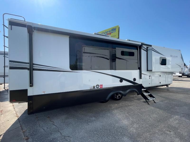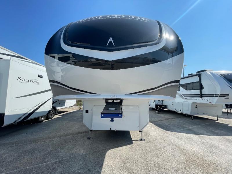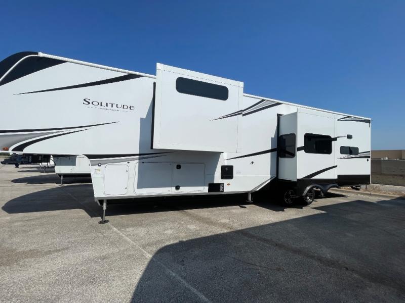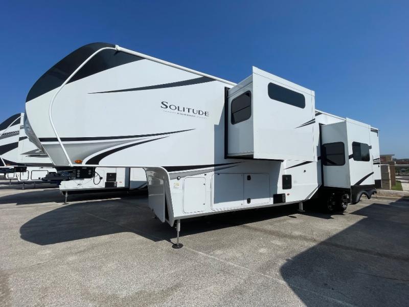 Each Solitude fifth wheel by Grand Design features a 101" wide-body construction, heavy duty 8,000 lb. axles, frameless tinted windows, and high-gloss gel coat sidewalls. You can camp year around thanks to the Weather-Tek Package that includes a 35K BTU high-capacity furnace, an all-in-one enclosed and heated utility center, and a fully enclosed underbelly with heated tanks and storage. Inside, you'll love the premium roller shades, hardwood cabinet doors, solid surface countertops, plus residential finishes throughout to make you truly feel at home. Each model also includes a MORryde CRE3000 suspension system, self adjusting brakes, and a MORryde pin box that will provide smooth towing from home to campground. Affordable luxury is possible with the Solitude fifth wheels; choose yours today!