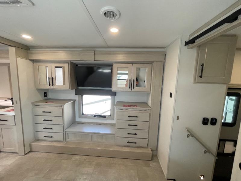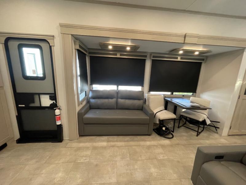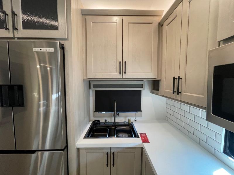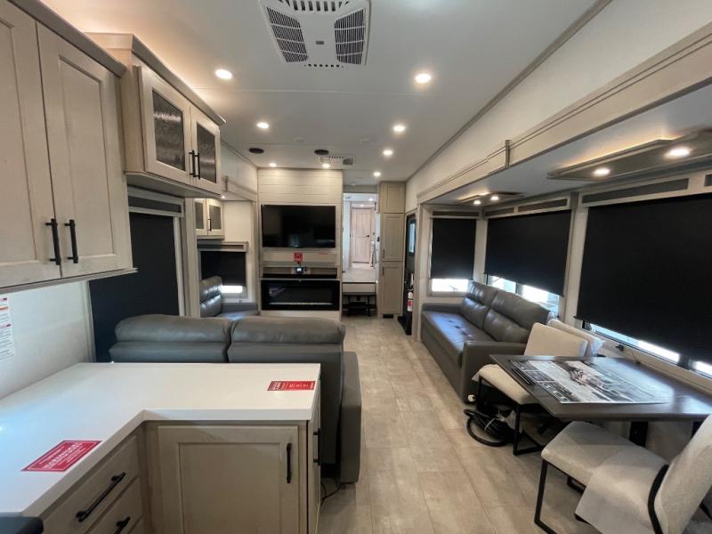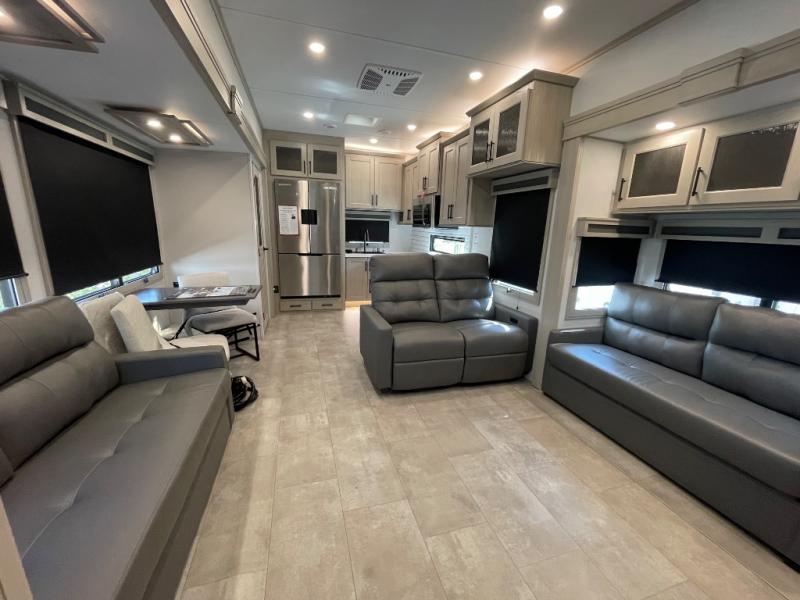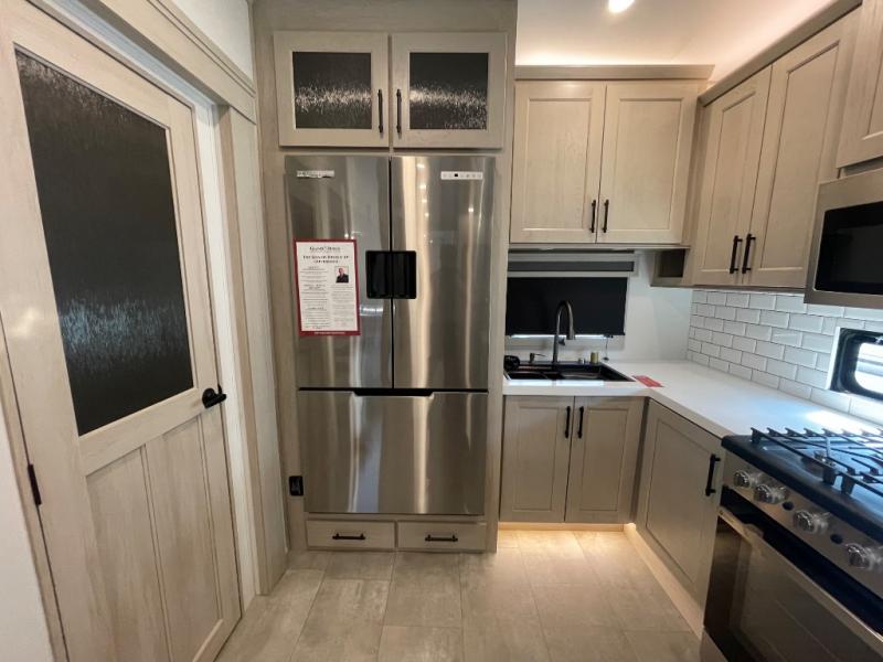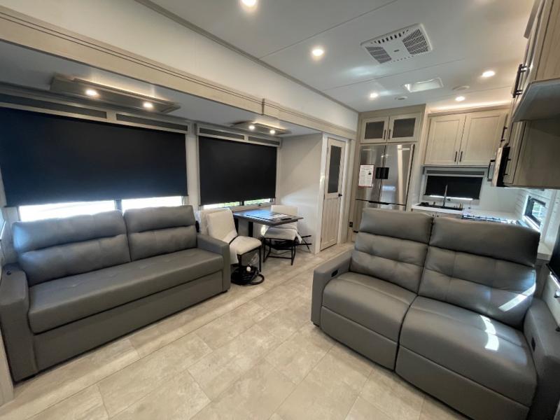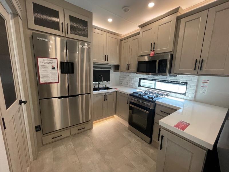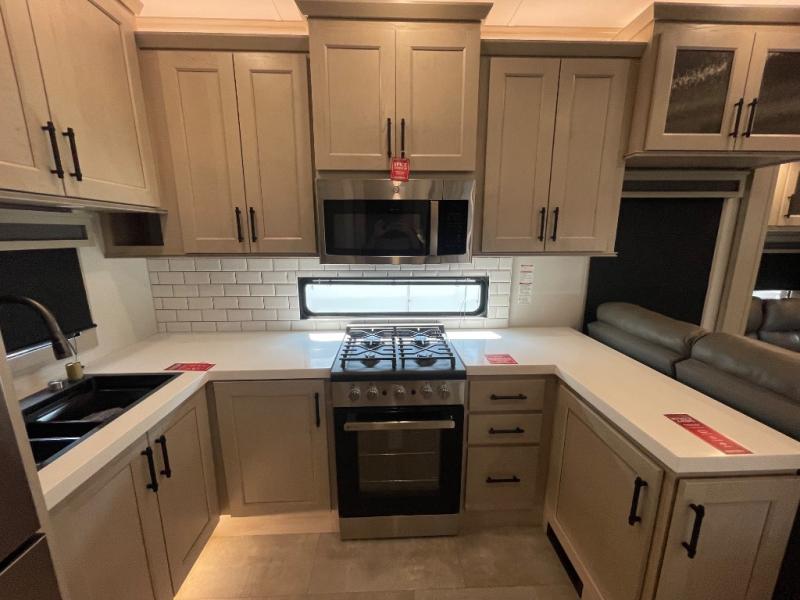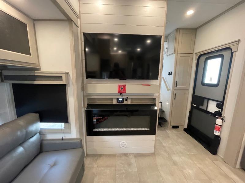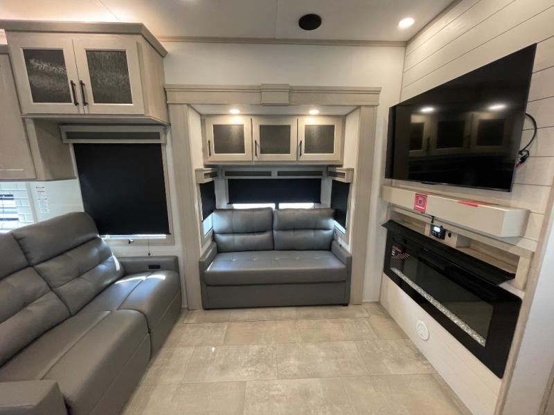 Comfort will come easy in this four slide out fifth wheel! You will feel right at home with a master bedroom that includes a queen bed slide out with a king bed option, dual dressers with a seat in between, plus a large front bath with tons of space. The convenient half bath is right as you enter the unit for convenience. Your crew can get cozy on the dual tri-fold sofas within dual opposing slides, or on the theater seating across from the LED TV and fireplace. One feature you will love about this fifth wheel is the rear kitchen with wrap-around counter space, a built-in oven, plus a 20 cu. ft. 12V refrigerator and a large pantry to keep food fresh.