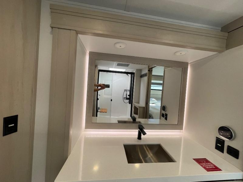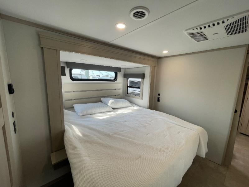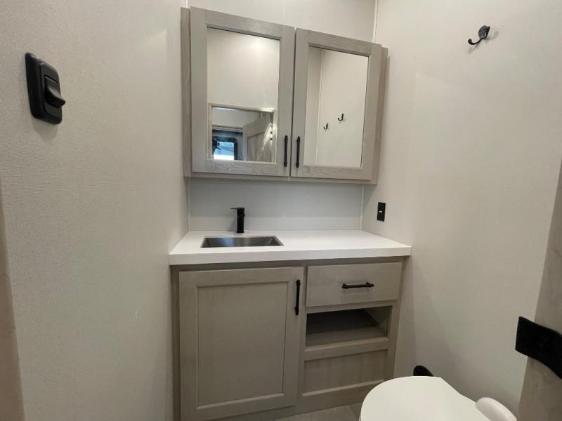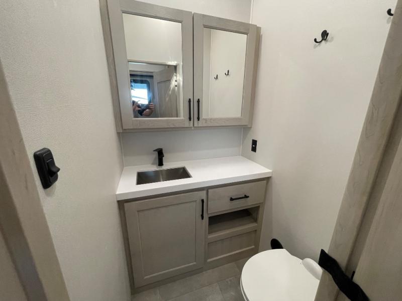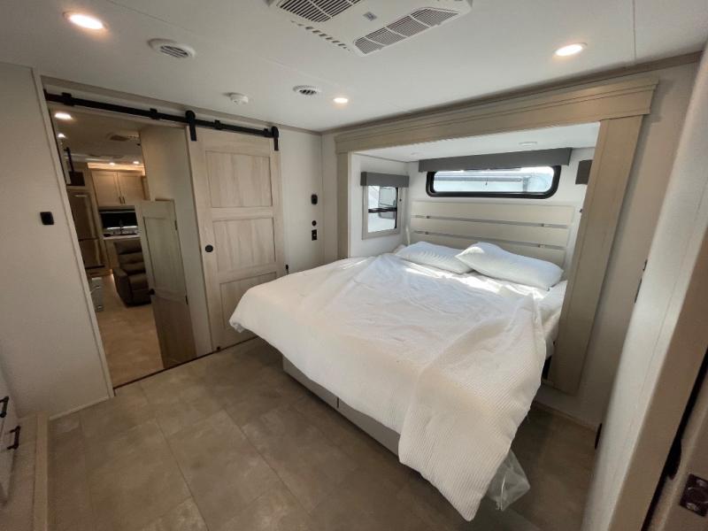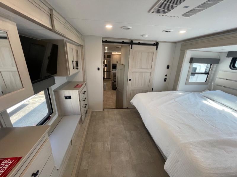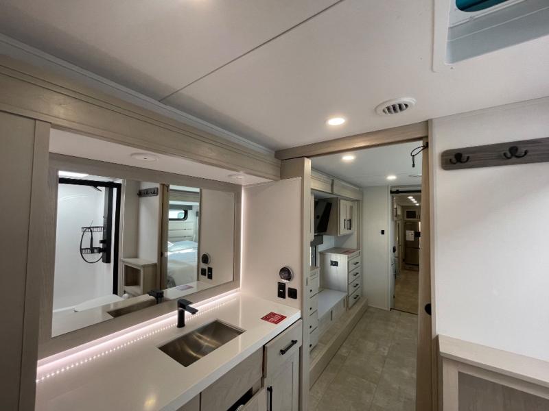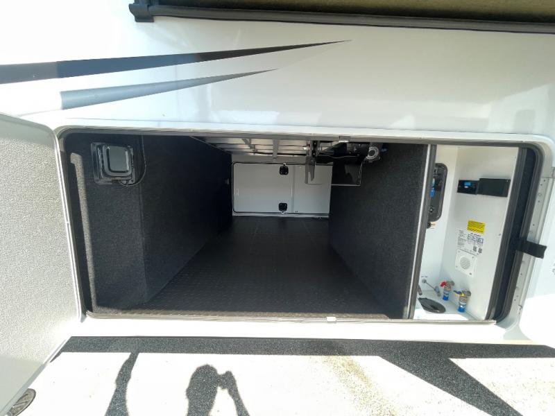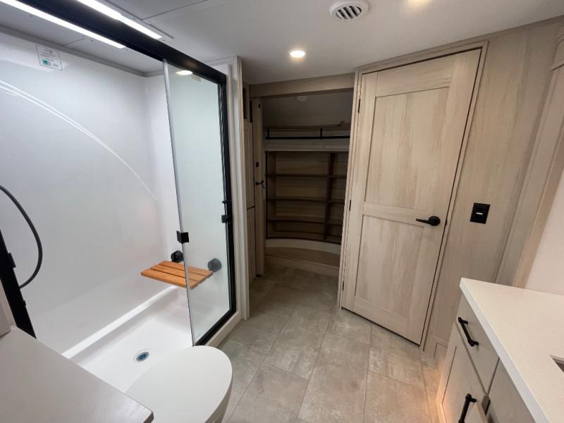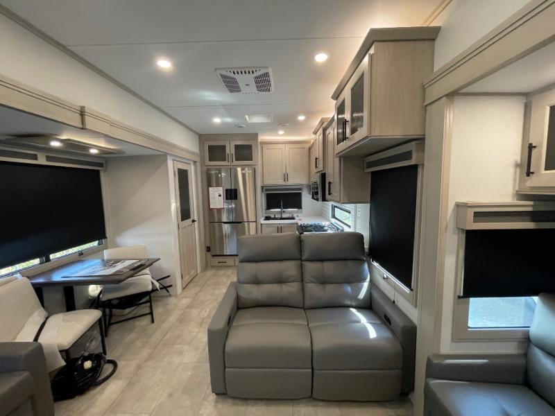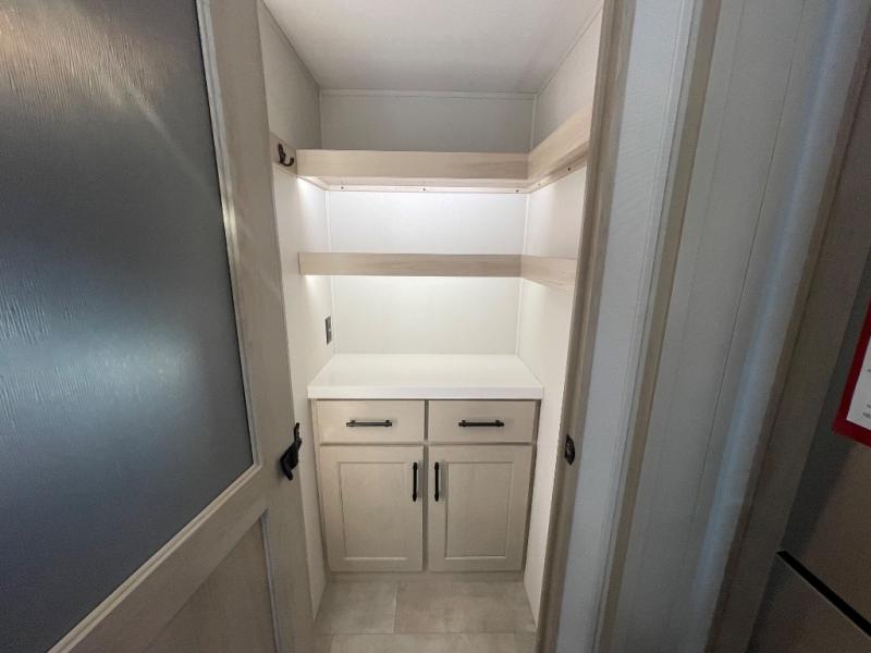 Comfort will come easy in this four slide out fifth wheel! You will feel right at home with a master bedroom that includes a queen bed slide out with a king bed option, dual dressers with a seat in between, plus a large front bath with tons of space. The convenient half bath is right as you enter the unit for convenience. Your crew can get cozy on the dual tri-fold sofas within dual opposing slides, or on the theater seating across from the LED TV and fireplace. One feature you will love about this fifth wheel is the rear kitchen with wrap-around counter space, a built-in oven, plus a 20 cu. ft. 12V refrigerator and a large pantry to keep food fresh.
