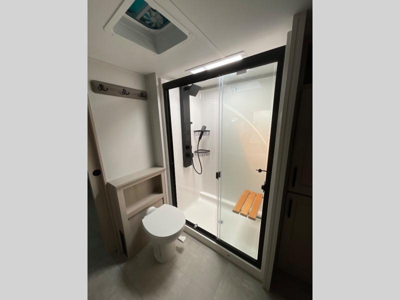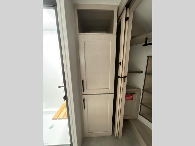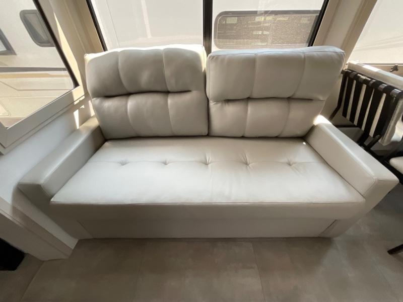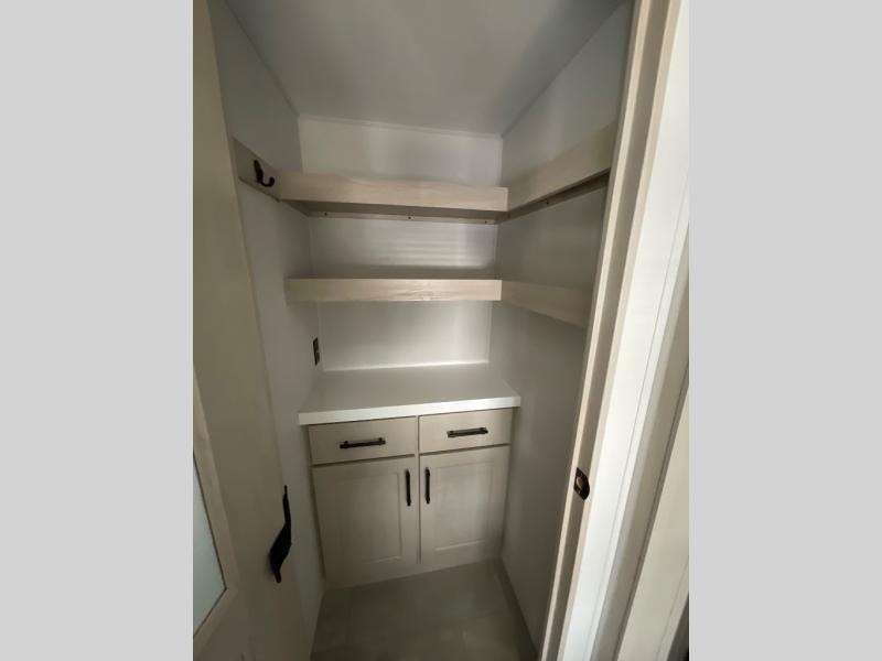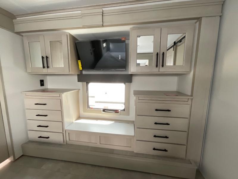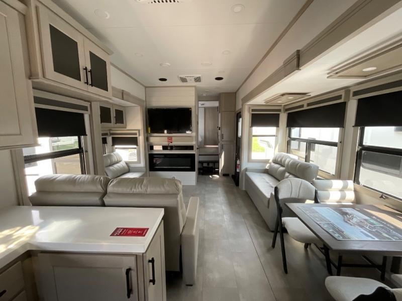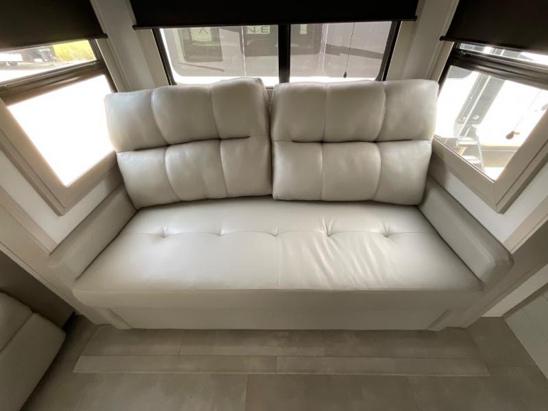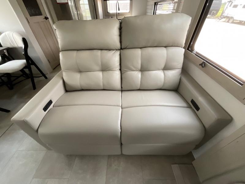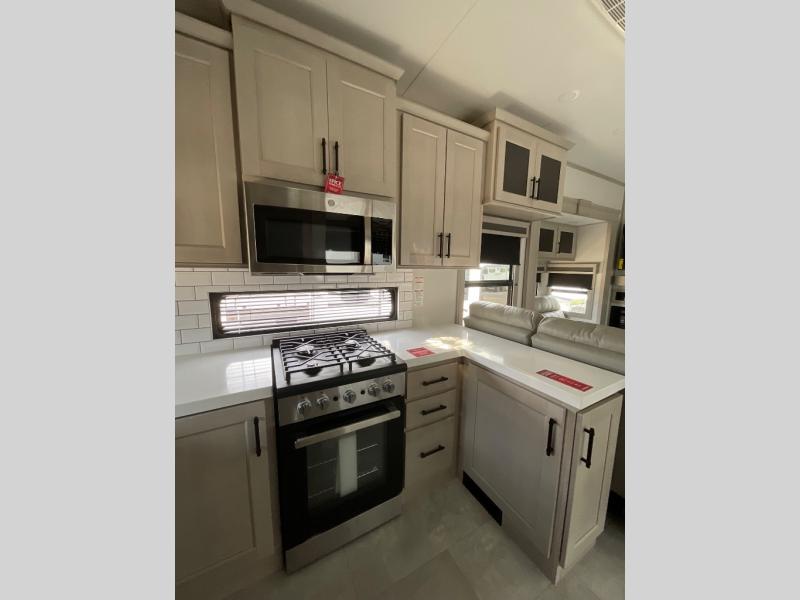Comfort will come easy in this four slide out fifth wheel! You will feel right at home with a master bedroom that includes a queen bed slide out with a king bed option, dual dressers with a seat in between, plus a large front bath with tons of space. The convenient half bath is right as you enter the unit for convenience. Your crew can get cozy on the dual tri-fold sofas within dual opposing slides, or on the theater seating across from the LED TV and fireplace. One feature you will love about this fifth wheel is the rear kitchen with wrap-around counter space, a built-in oven, plus a 20 cu. ft. 12V refrigerator and a large pantry to keep food fresh.