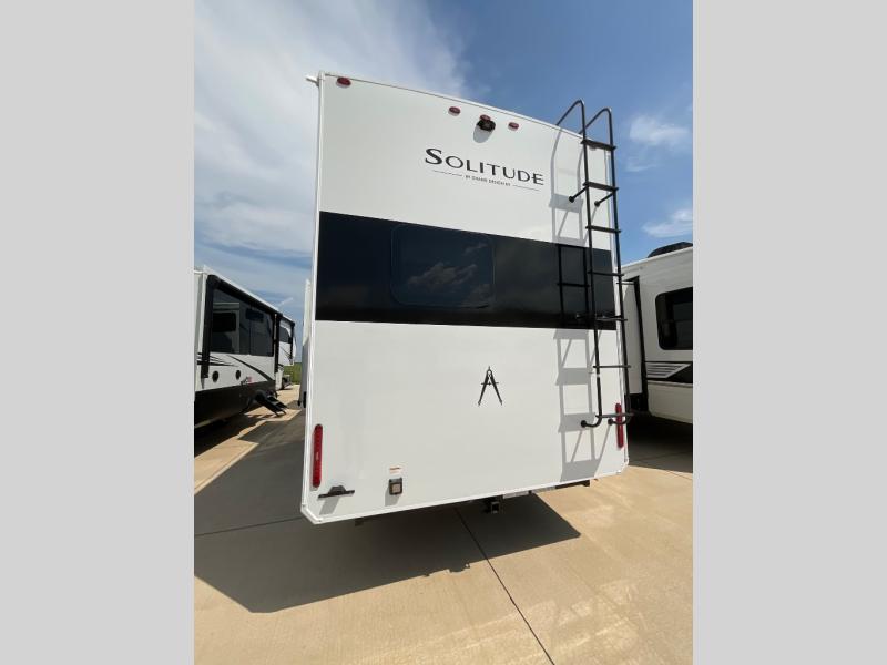 Each Solitude fifth wheel by Grand Design features a 101" wide-body construction, heavy duty 8,000 lb. axles, frameless tinted windows, and high-gloss gel coat sidewalls. You can camp year around thanks to the Weather-Tek Package that includes a 35K BTU high-capacity furnace, an all-in-one enclosed and heated utility center, and a fully enclosed underbelly with heated tanks and storage. Inside, you'll love the premium roller shades, hardwood cabinet doors, solid surface countertops, plus residential finishes throughout to make you truly feel at home. Each model also includes a MORryde CRE3000 suspension system, self adjusting brakes, and a MORryde pin box that will provide smooth towing from home to campground. Affordable luxury is possible with the Solitude fifth wheels; choose yours today!