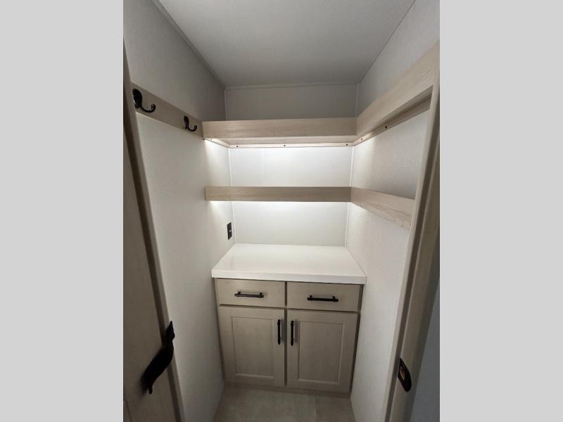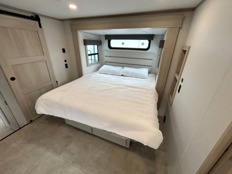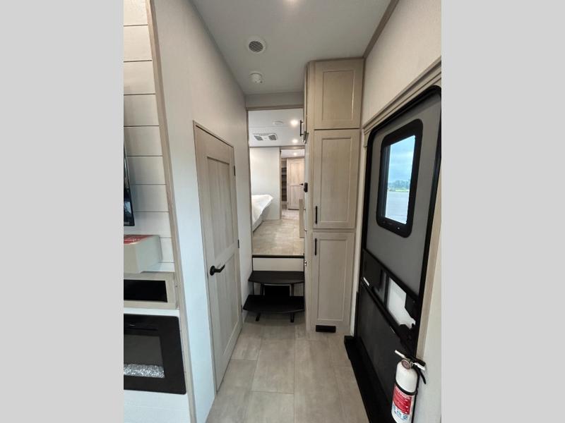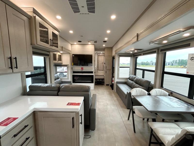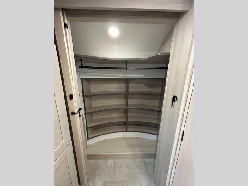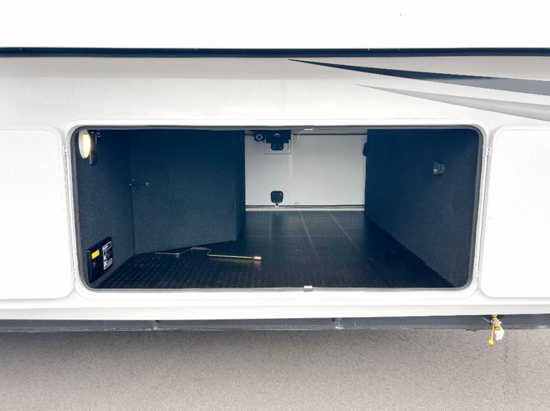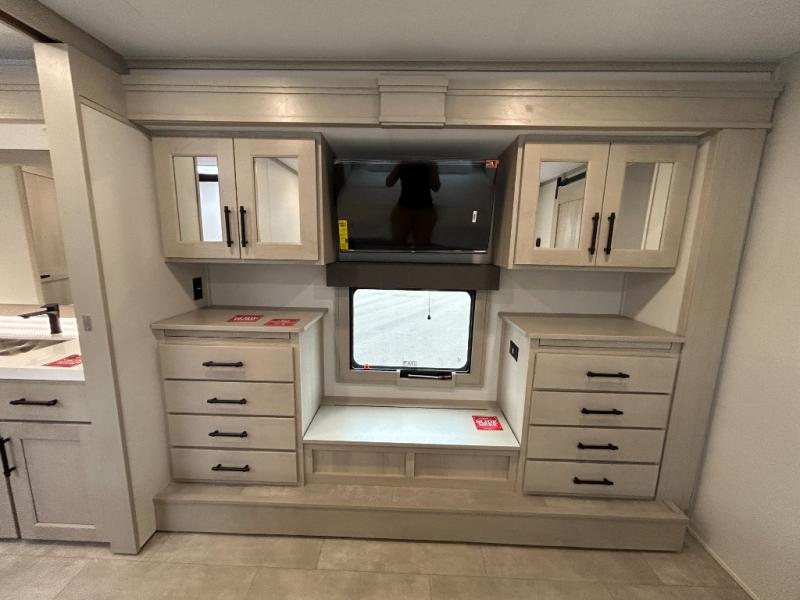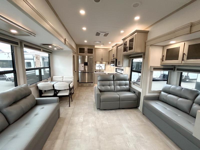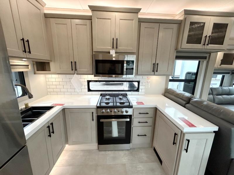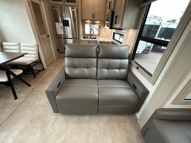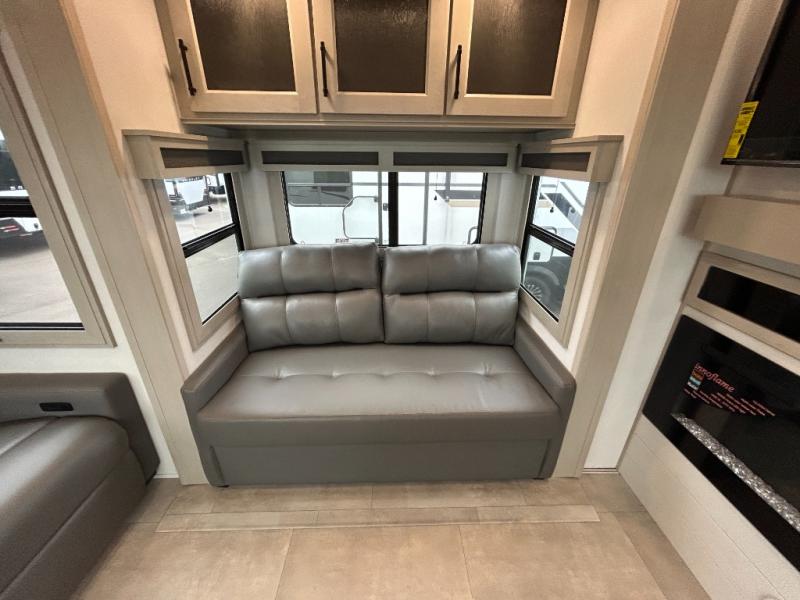 Comfort will come easy in this four slide out fifth wheel! You will feel right at home with a master bedroom that includes a queen bed slide out with a king bed option, dual dressers with a seat in between, plus a large front bath with tons of space. The convenient half bath is right as you enter the unit for convenience. Your crew can get cozy on the dual tri-fold sofas within dual opposing slides, or on the theater seating across from the LED TV and fireplace. One feature you will love about this fifth wheel is the rear kitchen with wrap-around counter space, a built-in oven, plus a 20 cu. ft. 12V refrigerator and a large pantry to keep food fresh.