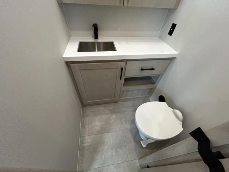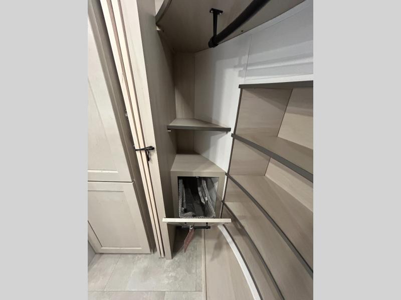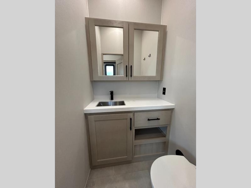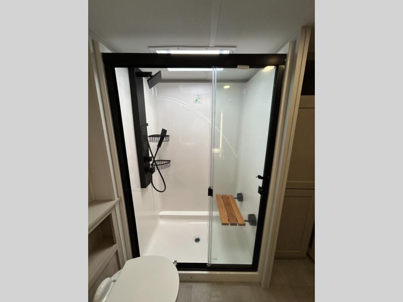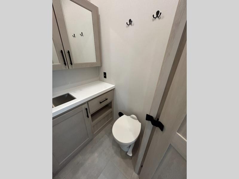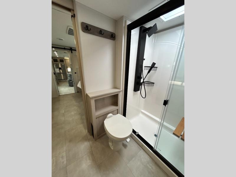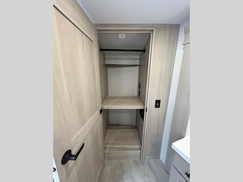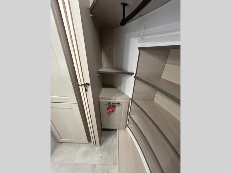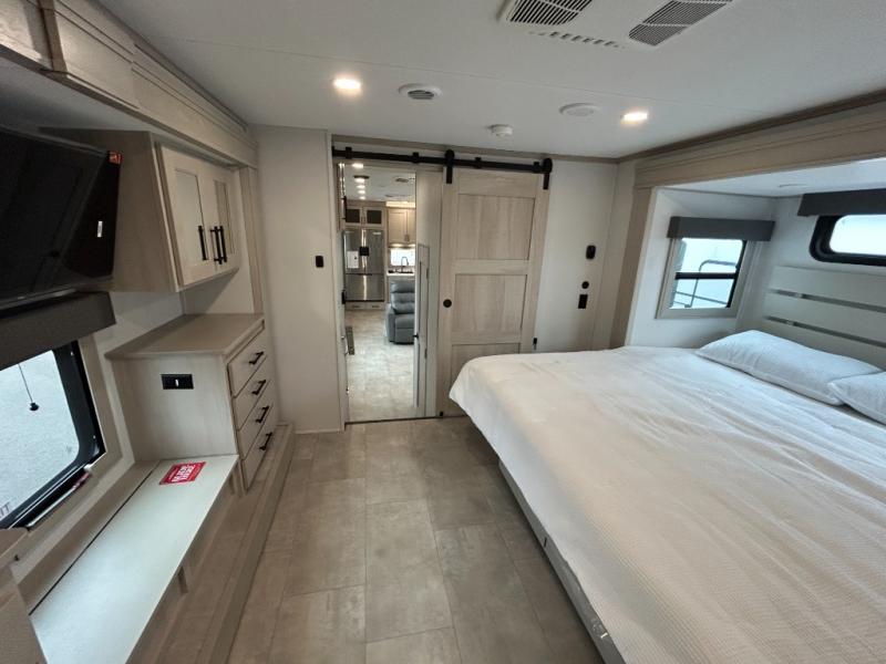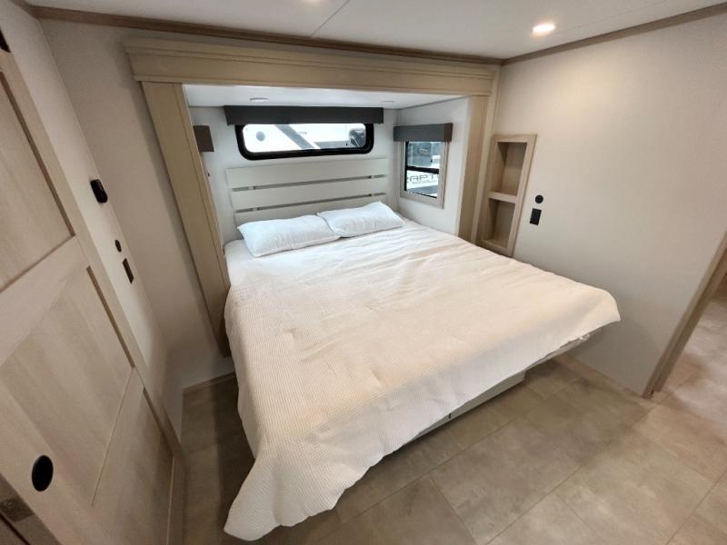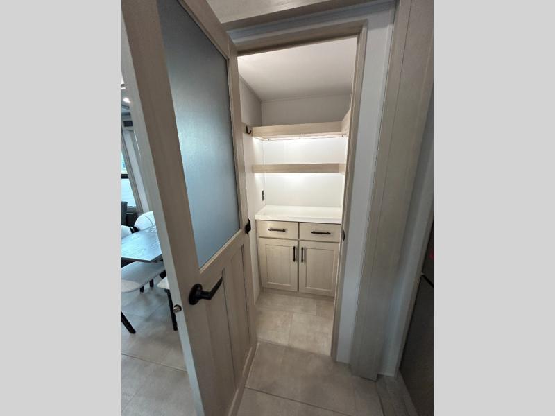 Comfort will come easy in this four slide out fifth wheel! You will feel right at home with a master bedroom that includes a queen bed slide out with a king bed option, dual dressers with a seat in between, plus a large front bath with tons of space. The convenient half bath is right as you enter the unit for convenience. Your crew can get cozy on the dual tri-fold sofas within dual opposing slides, or on the theater seating across from the LED TV and fireplace. One feature you will love about this fifth wheel is the rear kitchen with wrap-around counter space, a built-in oven, plus a 20 cu. ft. 12V refrigerator and a large pantry to keep food fresh.