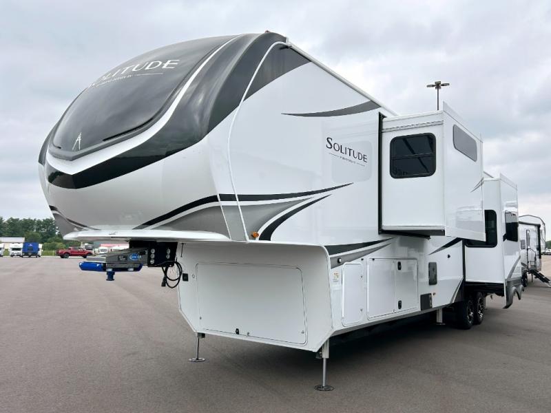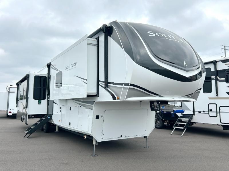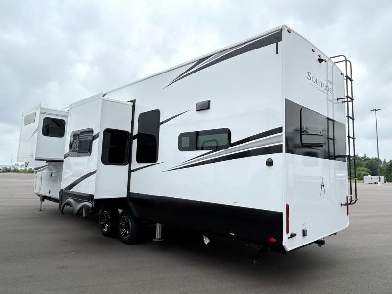 Each Solitude fifth wheel by Grand Design features a 101" wide-body construction, heavy duty 8,000 lb. axles, frameless tinted windows, and high-gloss gel coat sidewalls. You can camp year around thanks to the Weather-Tek Package that includes a 35K BTU high-capacity furnace, an all-in-one enclosed and heated utility center, and a fully enclosed underbelly with heated tanks and storage. Inside, you'll love the premium roller shades, hardwood cabinet doors, solid surface countertops, plus residential finishes throughout to make you truly feel at home. Each model also includes a MORryde CRE3000 suspension system, self adjusting brakes, and a MORryde pin box that will provide smooth towing from home to campground. Affordable luxury is possible with the Solitude fifth wheels; choose yours today!