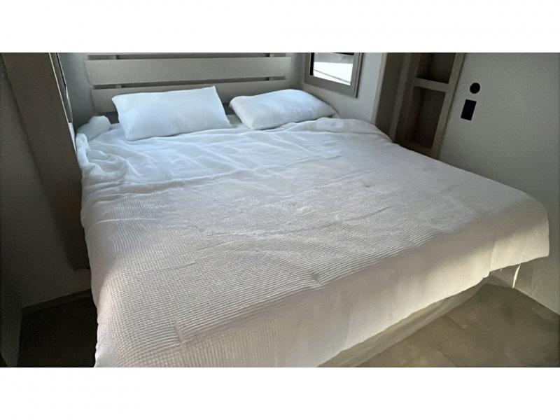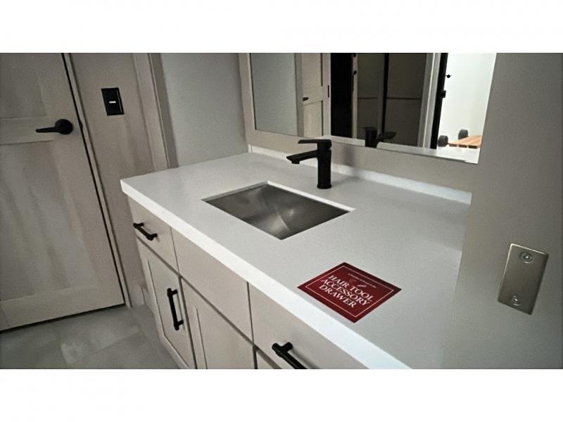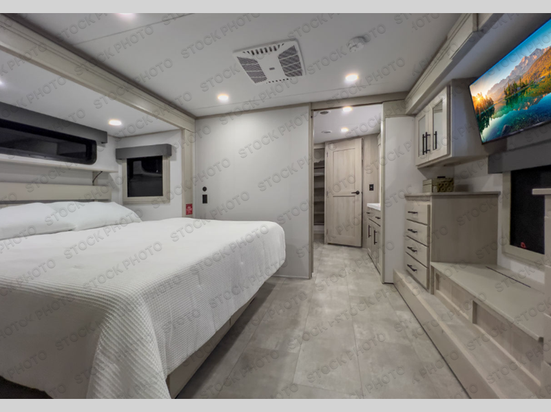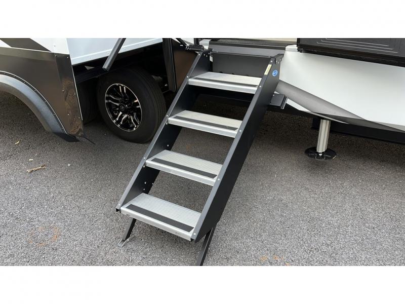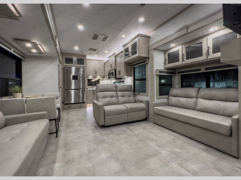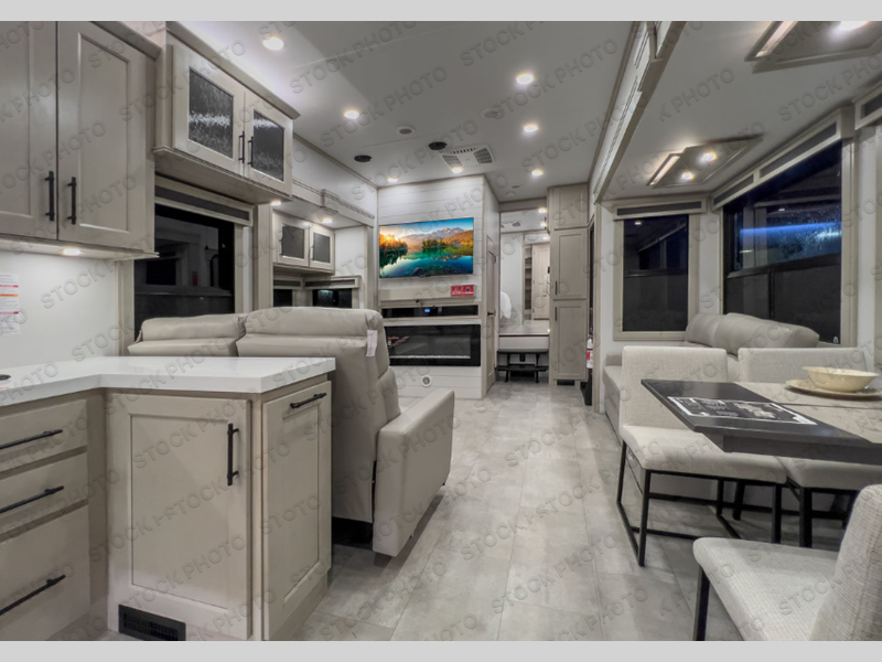 Comfort will come easy in this four slide out fifth wheel! You will feel right at home with a master bedroom that includes a queen bed slide out with a king bed option, dual dressers with a seat in between, plus a large front bath with tons of space. The convenient half bath is right as you enter the unit for convenience. Your crew can get cozy on the dual tri-fold sofas within dual opposing slides, or on the theater seating across from the LED TV and fireplace. One feature you will love about this fifth wheel is the rear kitchen with wrap-around counter space, a built-in oven, plus a 20 cu. ft. 12V refrigerator and a large pantry to keep food fresh.