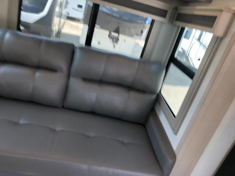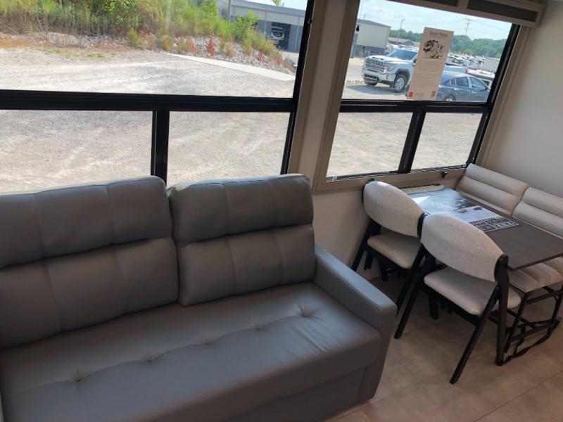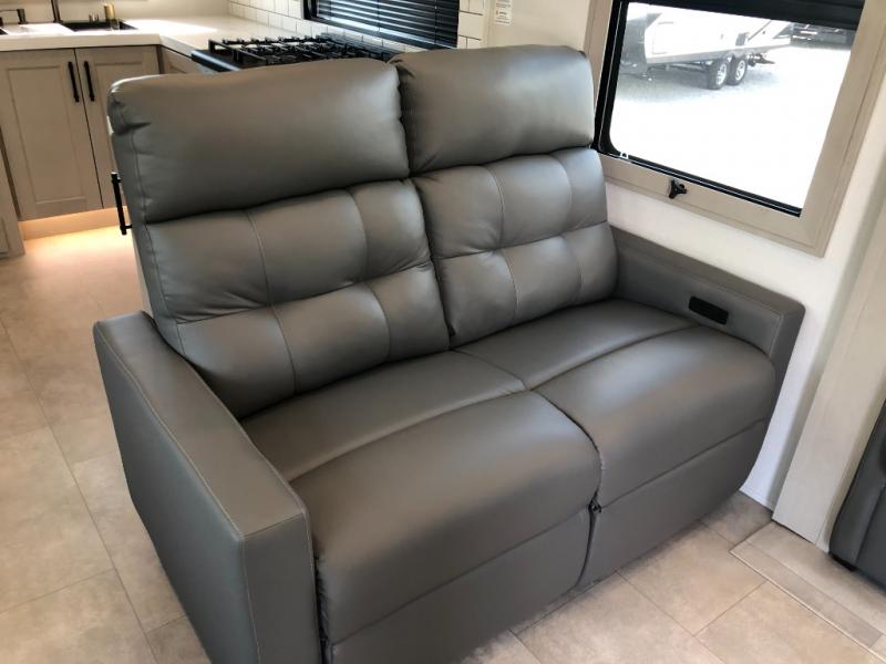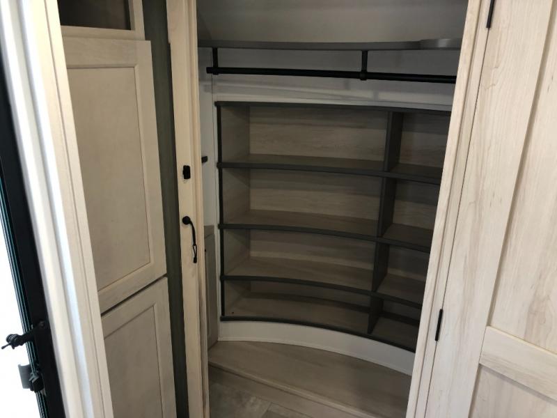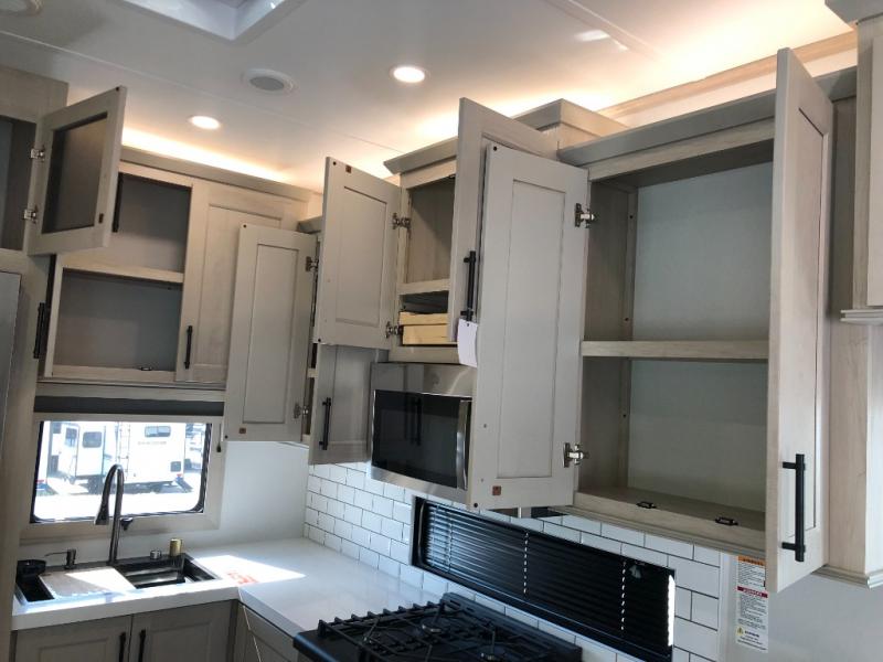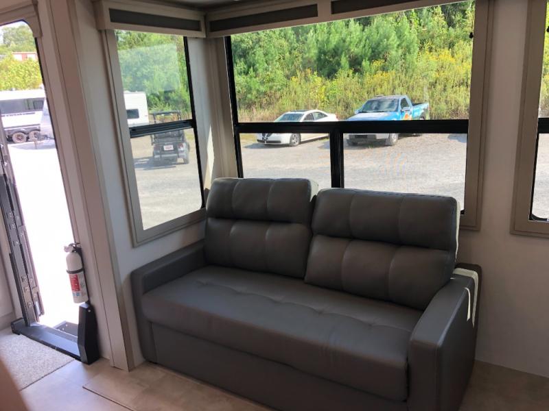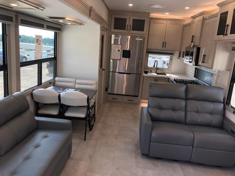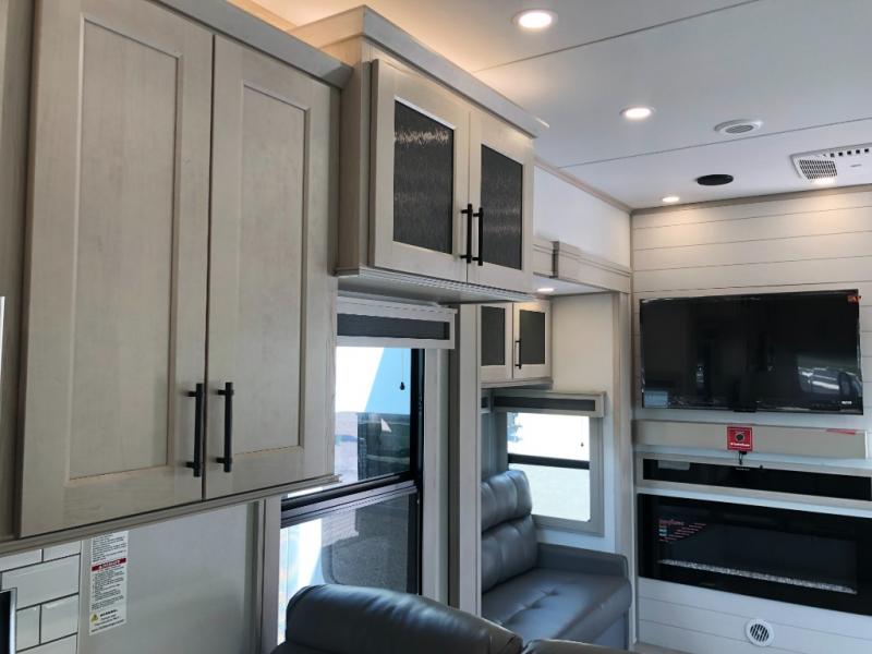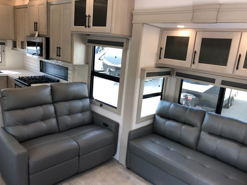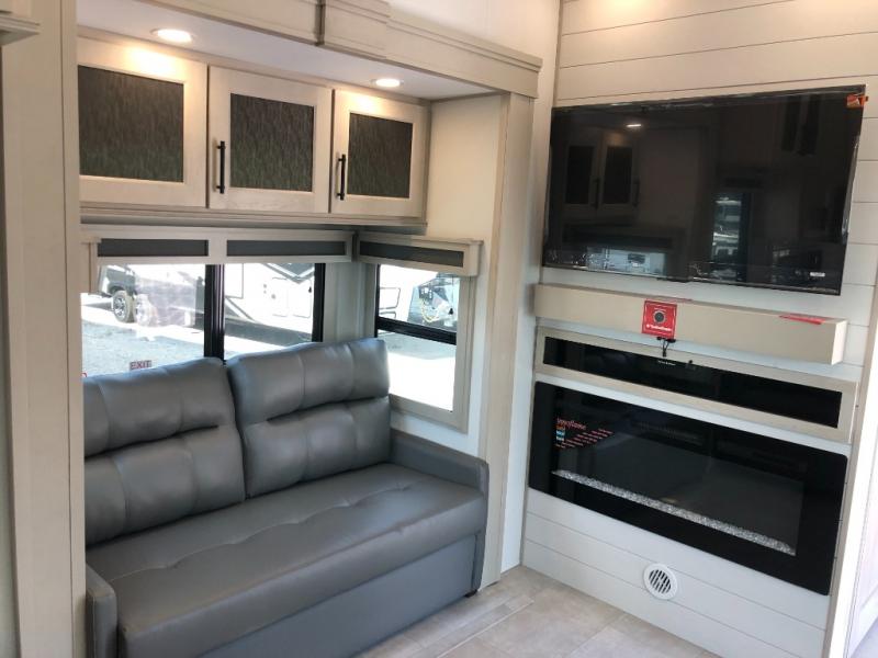 Comfort will come easy in this four slide out fifth wheel! You will feel right at home with a master bedroom that includes a queen bed slide out with a king bed option, dual dressers with a seat in between, plus a large front bath with tons of space. The convenient half bath is right as you enter the unit for convenience. Your crew can get cozy on the dual tri-fold sofas within dual opposing slides, or on the theater seating across from the LED TV and fireplace. One feature you will love about this fifth wheel is the rear kitchen with wrap-around counter space, a built-in oven, plus a 20 cu. ft. 12V refrigerator and a large pantry to keep food fresh.
