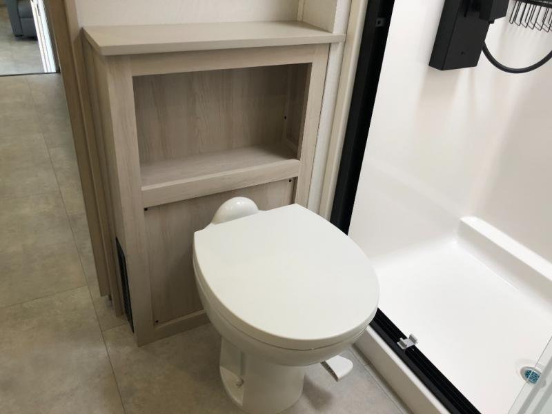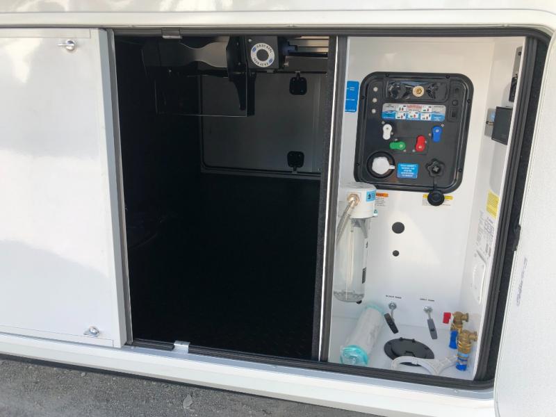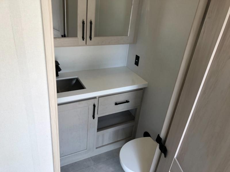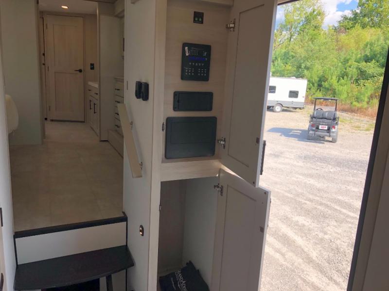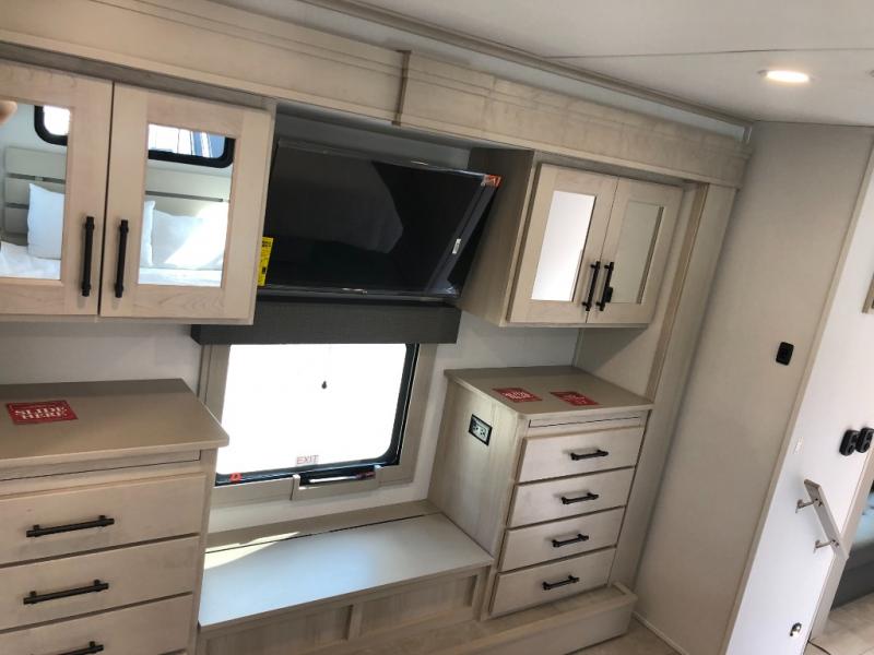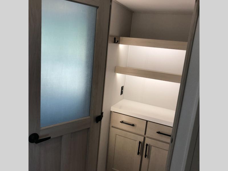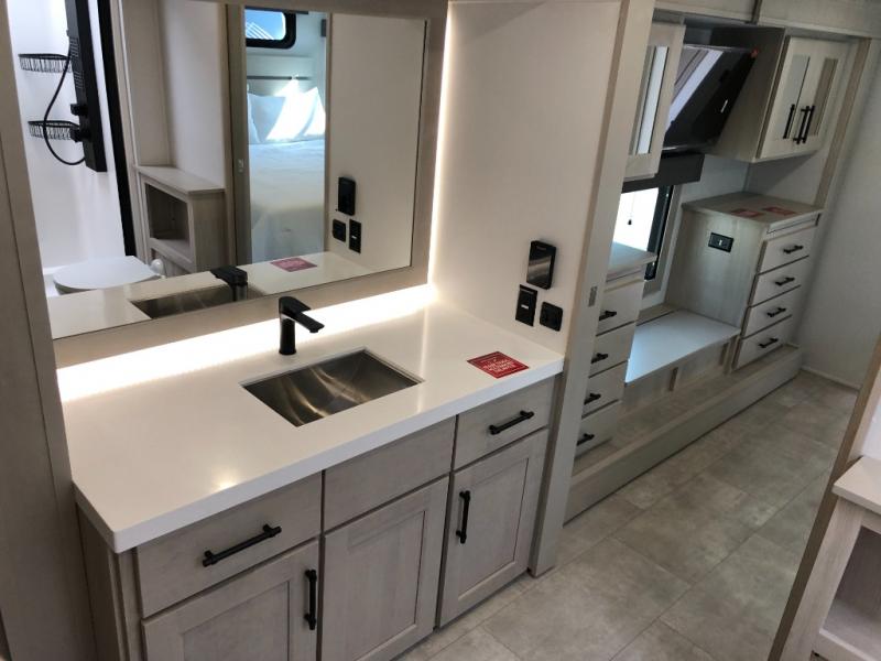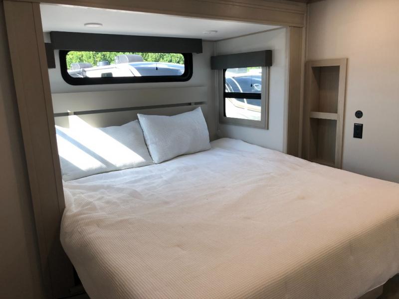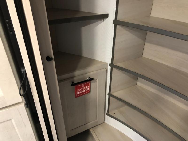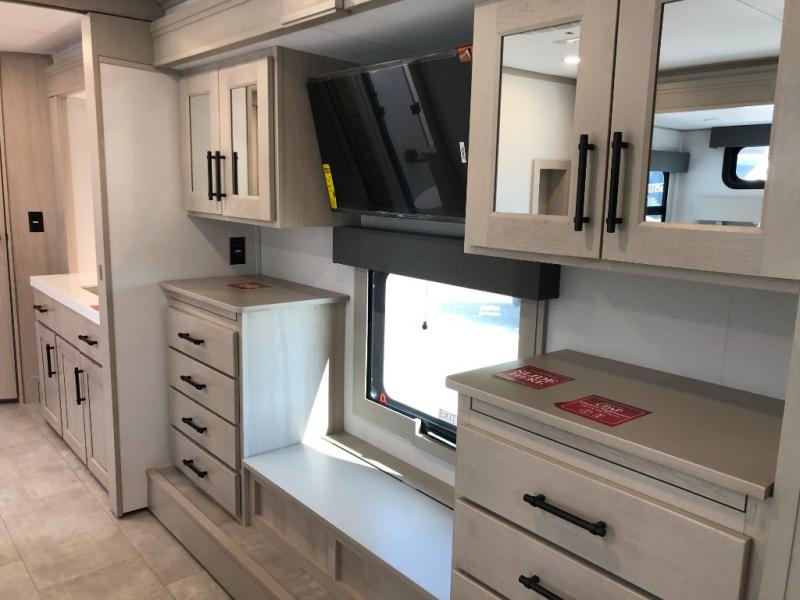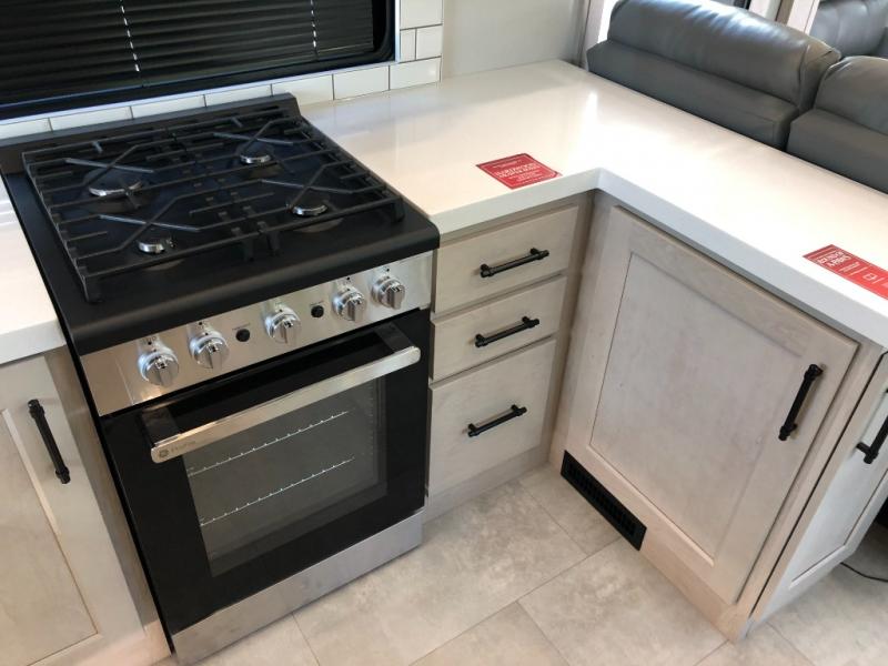 Comfort will come easy in this four slide out fifth wheel! You will feel right at home with a master bedroom that includes a queen bed slide out with a king bed option, dual dressers with a seat in between, plus a large front bath with tons of space. The convenient half bath is right as you enter the unit for convenience. Your crew can get cozy on the dual tri-fold sofas within dual opposing slides, or on the theater seating across from the LED TV and fireplace. One feature you will love about this fifth wheel is the rear kitchen with wrap-around counter space, a built-in oven, plus a 20 cu. ft. 12V refrigerator and a large pantry to keep food fresh.