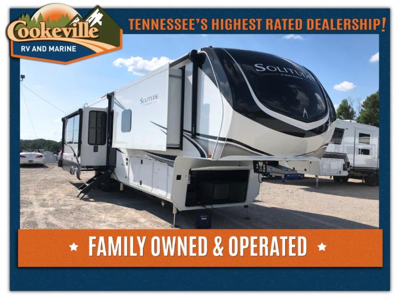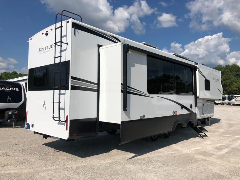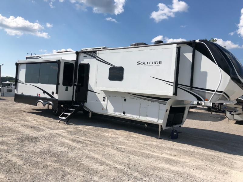 Each Solitude fifth wheel by Grand Design features a 101" wide-body construction, heavy duty 8,000 lb. axles, frameless tinted windows, and high-gloss gel coat sidewalls. You can camp year around thanks to the Weather-Tek Package that includes a 35K BTU high-capacity furnace, an all-in-one enclosed and heated utility center, and a fully enclosed underbelly with heated tanks and storage. Inside, you'll love the premium roller shades, hardwood cabinet doors, solid surface countertops, plus residential finishes throughout to make you truly feel at home. Each model also includes a MORryde CRE3000 suspension system, self adjusting brakes, and a MORryde pin box that will provide smooth towing from home to campground. Affordable luxury is possible with the Solitude fifth wheels; choose yours today!