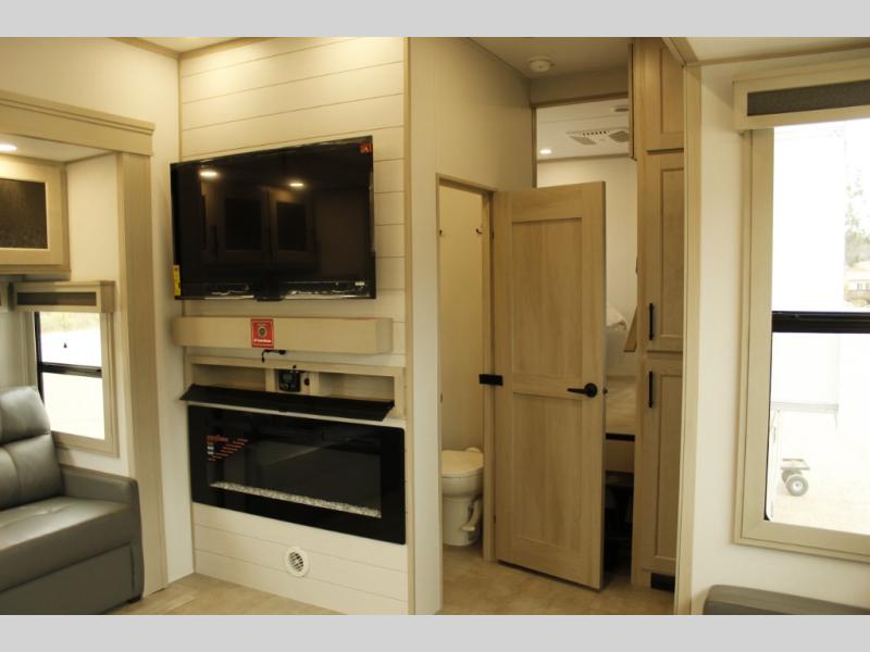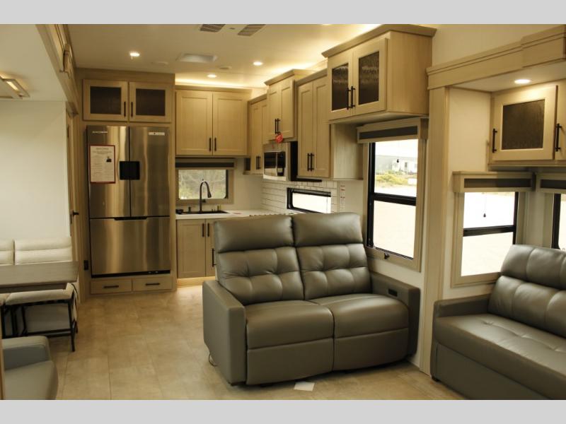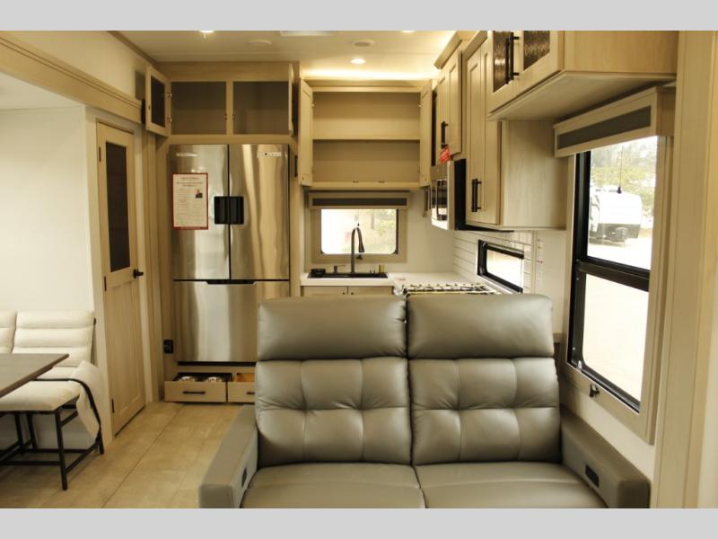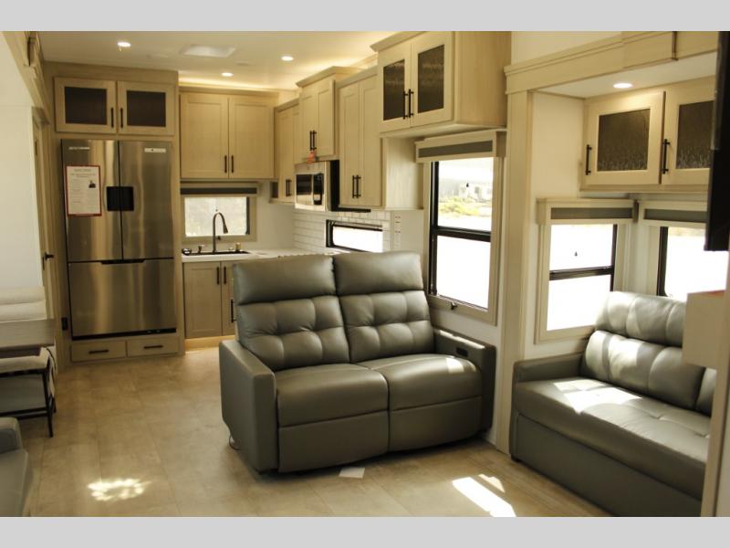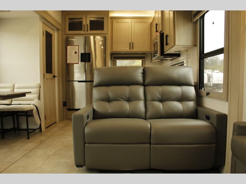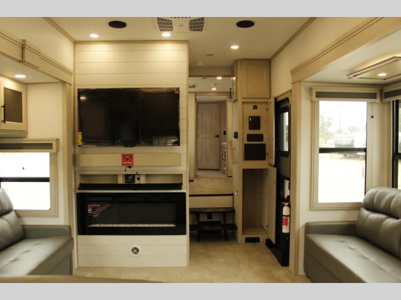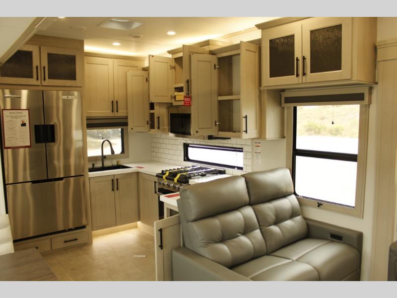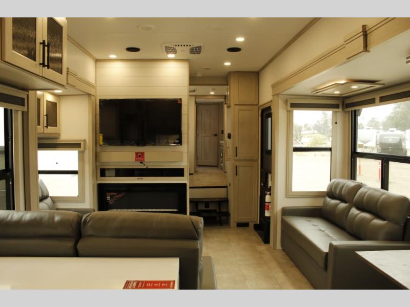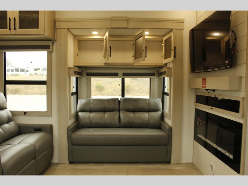 Comfort will come easy in this four slide out fifth wheel! You will feel right at home with a master bedroom that includes a queen bed slide out with a king bed option, dual dressers with a seat in between, plus a large front bath with tons of space. The convenient half bath is right as you enter the unit for convenience. Your crew can get cozy on the dual tri-fold sofas within dual opposing slides, or on the theater seating across from the LED TV and fireplace. One feature you will love about this fifth wheel is the rear kitchen with wrap-around counter space, a built-in oven, plus a 20 cu. ft. 12V refrigerator and a large pantry to keep food fresh.