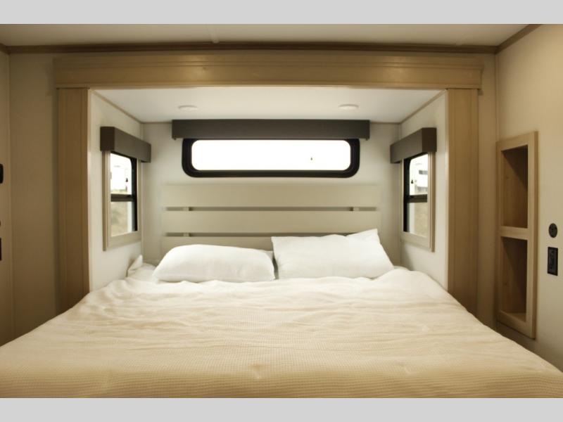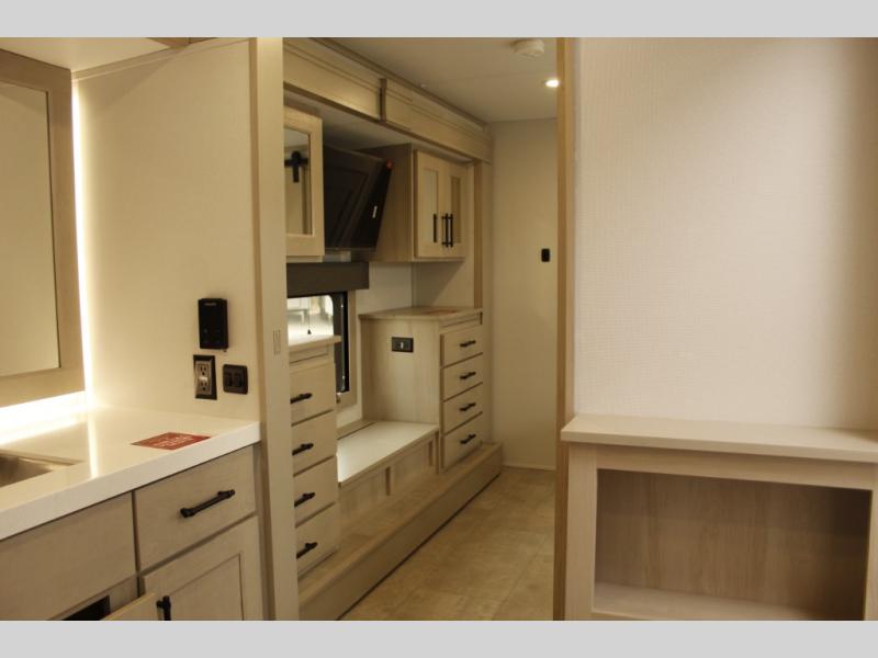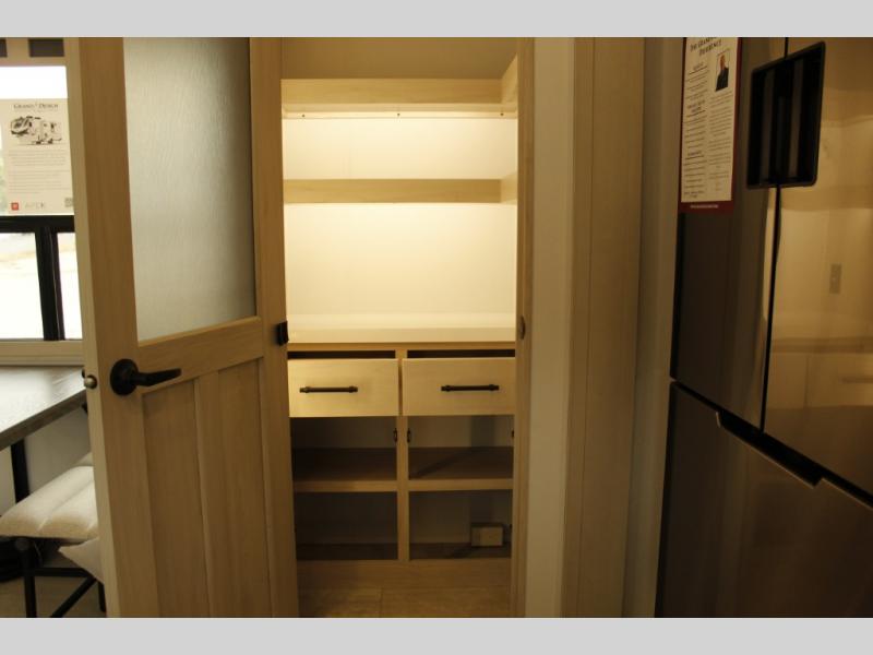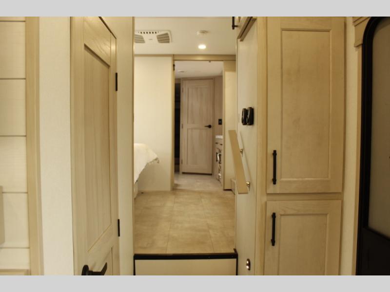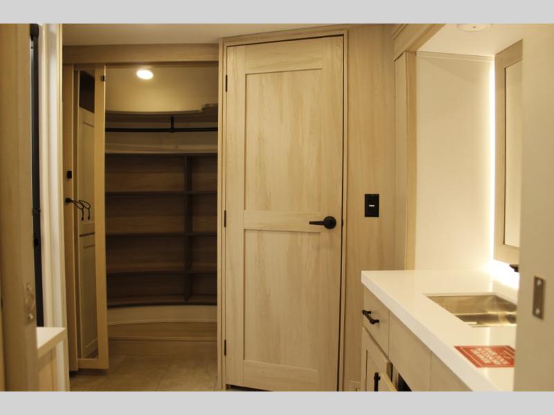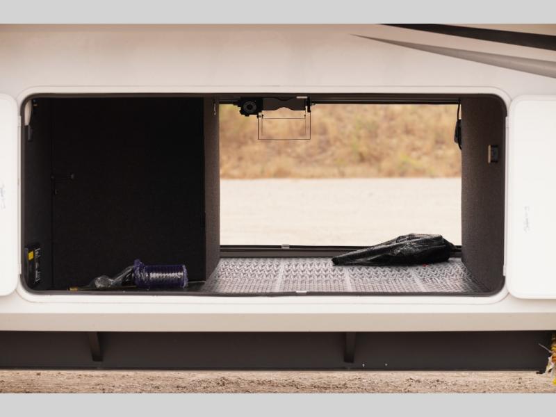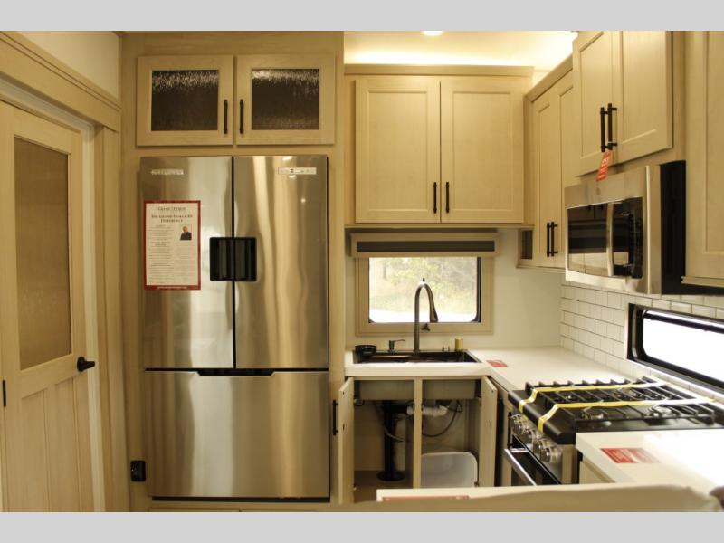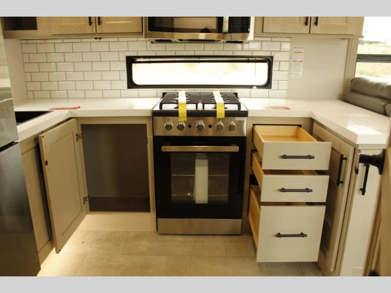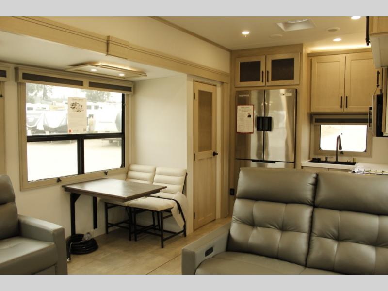 Comfort will come easy in this four slide out fifth wheel! You will feel right at home with a master bedroom that includes a queen bed slide out with a king bed option, dual dressers with a seat in between, plus a large front bath with tons of space. The convenient half bath is right as you enter the unit for convenience. Your crew can get cozy on the dual tri-fold sofas within dual opposing slides, or on the theater seating across from the LED TV and fireplace. One feature you will love about this fifth wheel is the rear kitchen with wrap-around counter space, a built-in oven, plus a 20 cu. ft. 12V refrigerator and a large pantry to keep food fresh.