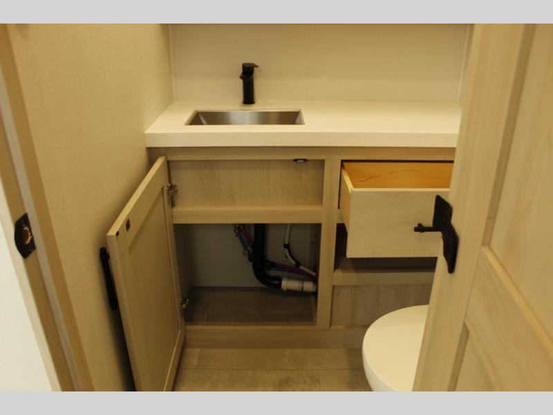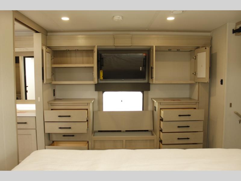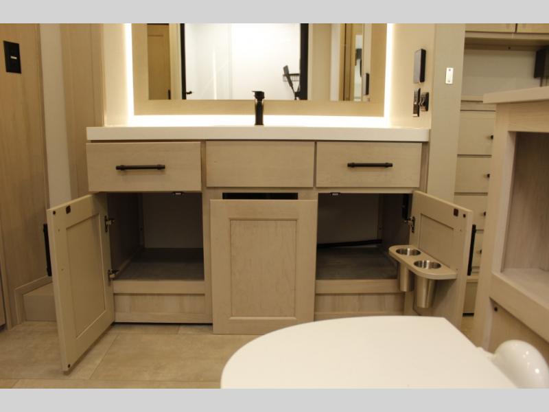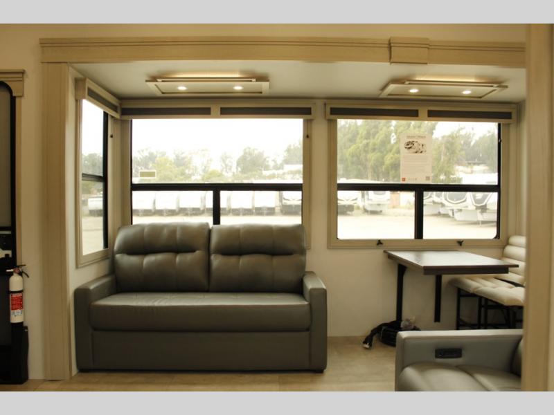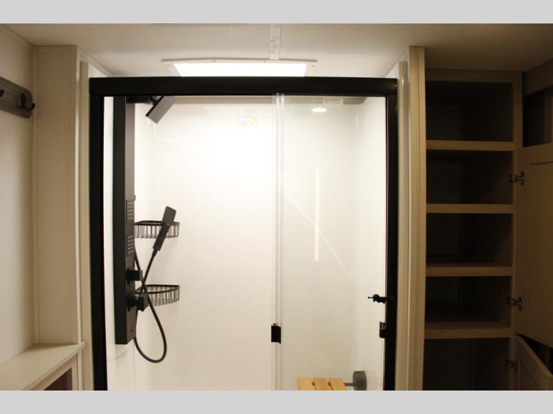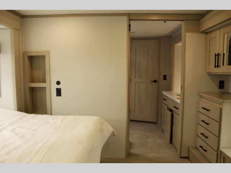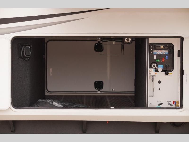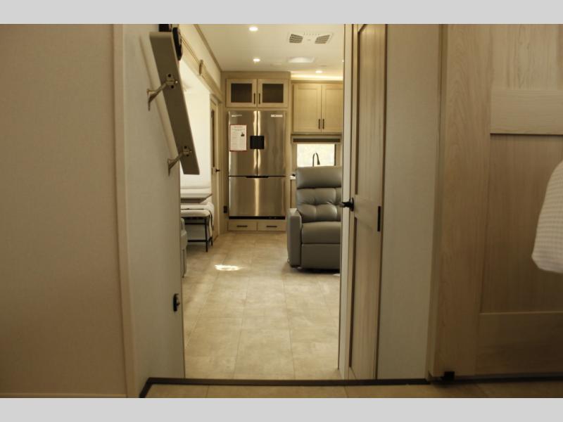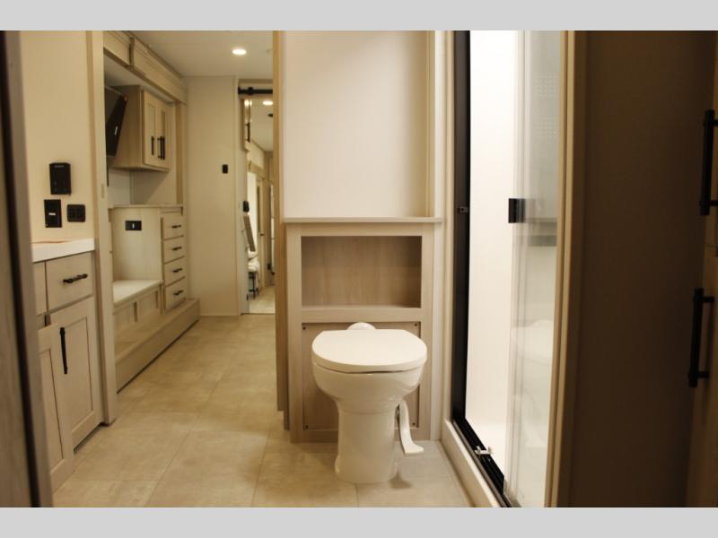 Comfort will come easy in this four slide out fifth wheel! You will feel right at home with a master bedroom that includes a queen bed slide out with a king bed option, dual dressers with a seat in between, plus a large front bath with tons of space. The convenient half bath is right as you enter the unit for convenience. Your crew can get cozy on the dual tri-fold sofas within dual opposing slides, or on the theater seating across from the LED TV and fireplace. One feature you will love about this fifth wheel is the rear kitchen with wrap-around counter space, a built-in oven, plus a 20 cu. ft. 12V refrigerator and a large pantry to keep food fresh.