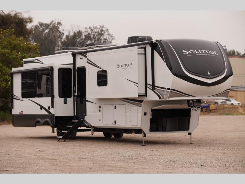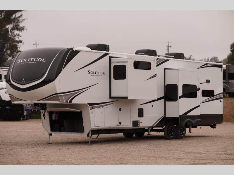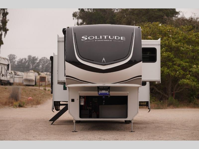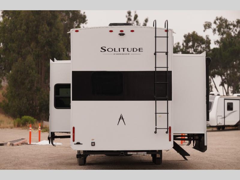 Each Solitude fifth wheel by Grand Design features a 101" wide-body construction, heavy duty 8,000 lb. axles, frameless tinted windows, and high-gloss gel coat sidewalls. You can camp year around thanks to the Weather-Tek Package that includes a 35K BTU high-capacity furnace, an all-in-one enclosed and heated utility center, and a fully enclosed underbelly with heated tanks and storage. Inside, you'll love the premium roller shades, hardwood cabinet doors, solid surface countertops, plus residential finishes throughout to make you truly feel at home. Each model also includes a MORryde CRE3000 suspension system, self adjusting brakes, and a MORryde pin box that will provide smooth towing from home to campground. Affordable luxury is possible with the Solitude fifth wheels; choose yours today!