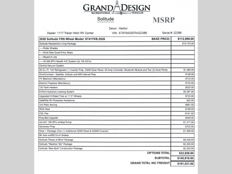 SALE PRICE INCLUDES UPGRADE TO 1060W CUSTOM SOLAR PACKAGE, 2 LITHIUM BATTERIES OR 6 VOLTS, FIFTH WHEEL HITCH + INSTALL, DELUXE AWNING TOPPER. PLUS A $2000 VOUCHER TO OUR MASSIVE PARTS STORE. IN BUSINESS FOR OVER 50 YEARS