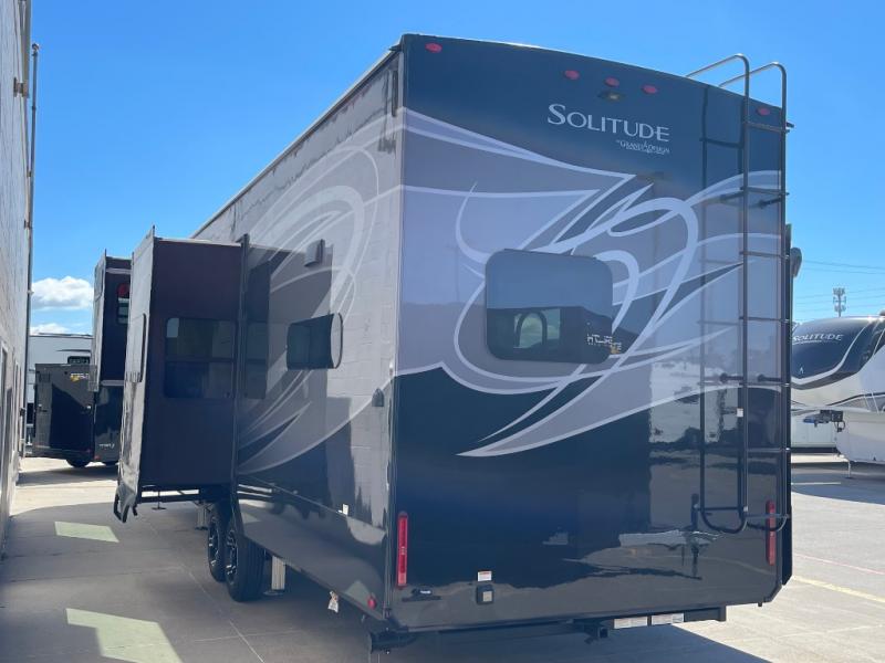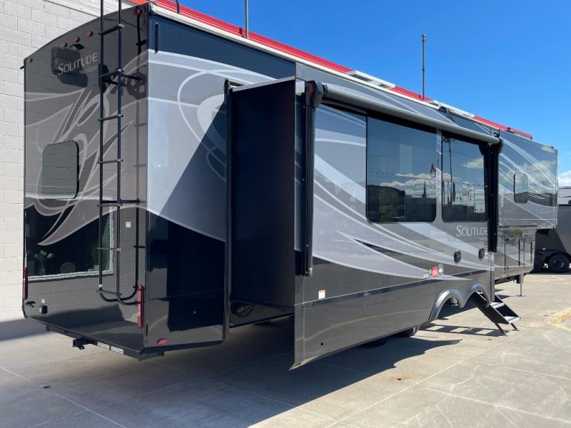Each Solitude fifth wheel by Grand Design features a 101" wide-body construction, heavy duty 8,000 lb. axles, frameless tinted windows, and high-gloss gel coat sidewalls. You can camp year around thanks to the Weather-Tek Package that includes a 35K BTU high-capacity furnace, an all-in-one enclosed and heated utility center, and a fully enclosed underbelly with heated tanks and storage. Inside, you'll love the premium roller shades, hardwood cabinet doors, solid surface countertops, plus residential finishes throughout to make you truly feel at home. Each model also includes a MORryde CRE3000 suspension system, self adjusting brakes, and a MORryde pin box that will provide smooth towing from home to campground. Affordable luxury is possible with the Solitude fifth wheels; choose yours today!