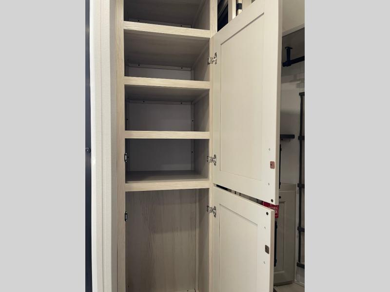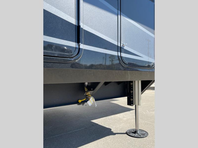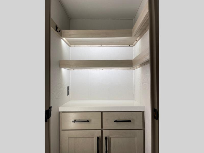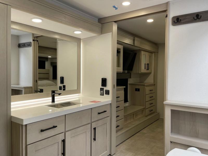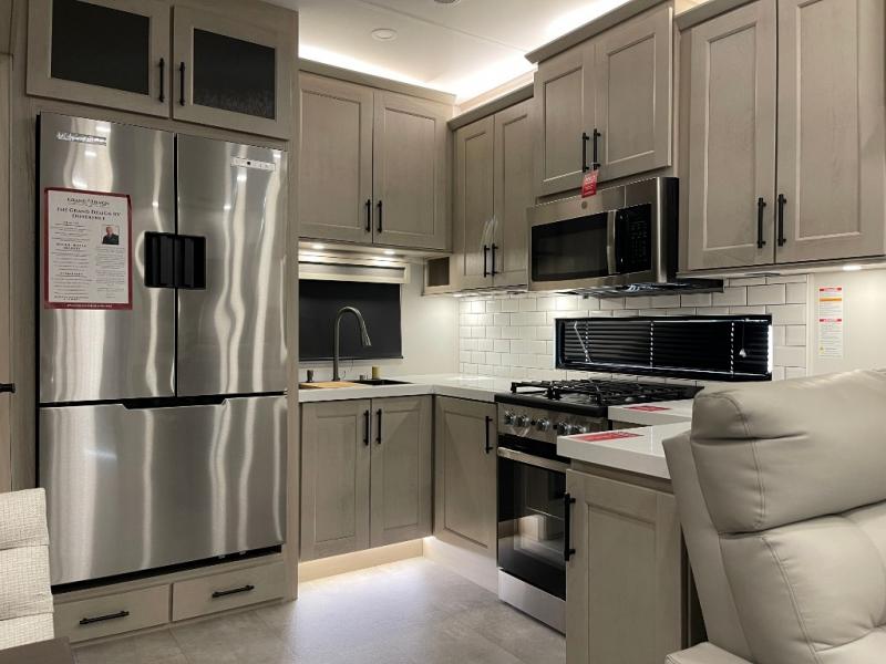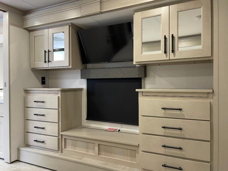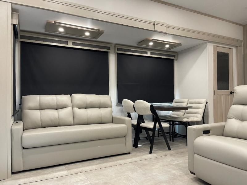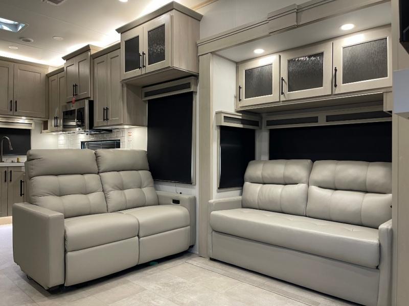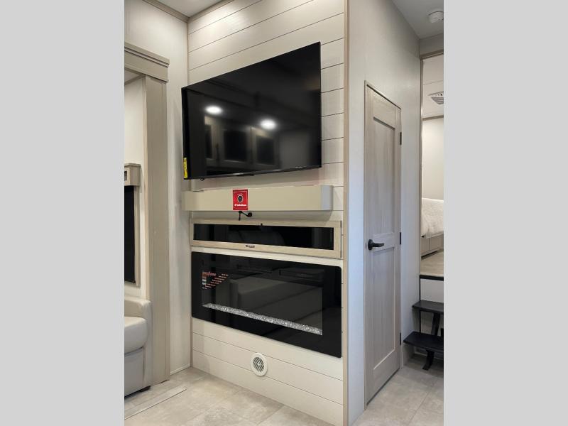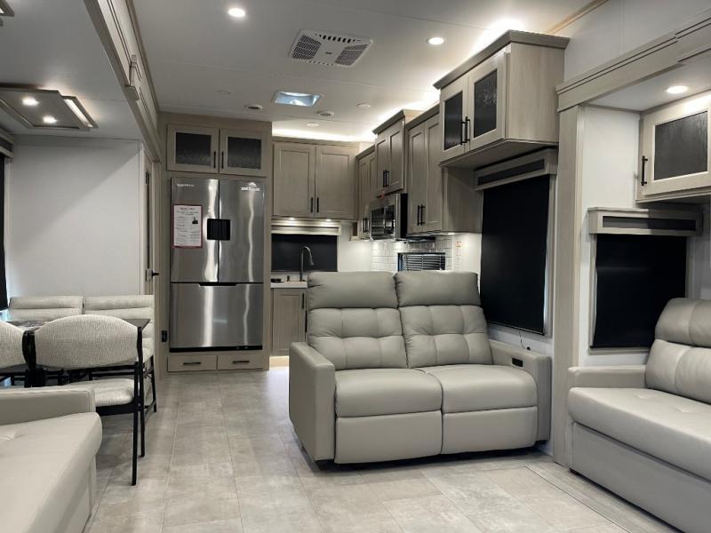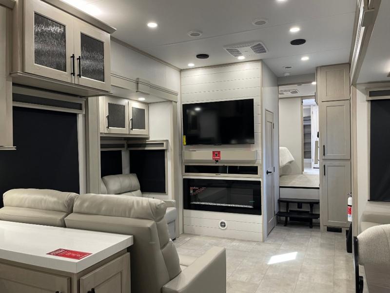 Comfort will come easy in this four slide out fifth wheel! You will feel right at home with a master bedroom that includes a queen bed slide out with a king bed option, dual dressers with a seat in between, plus a large front bath with tons of space. The convenient half bath is right as you enter the unit for convenience. Your crew can get cozy on the dual tri-fold sofas within dual opposing slides, or on the theater seating across from the LED TV and fireplace. One feature you will love about this fifth wheel is the rear kitchen with wrap-around counter space, a built-in oven, plus a 20 cu. ft. 12V refrigerator and a large pantry to keep food fresh.