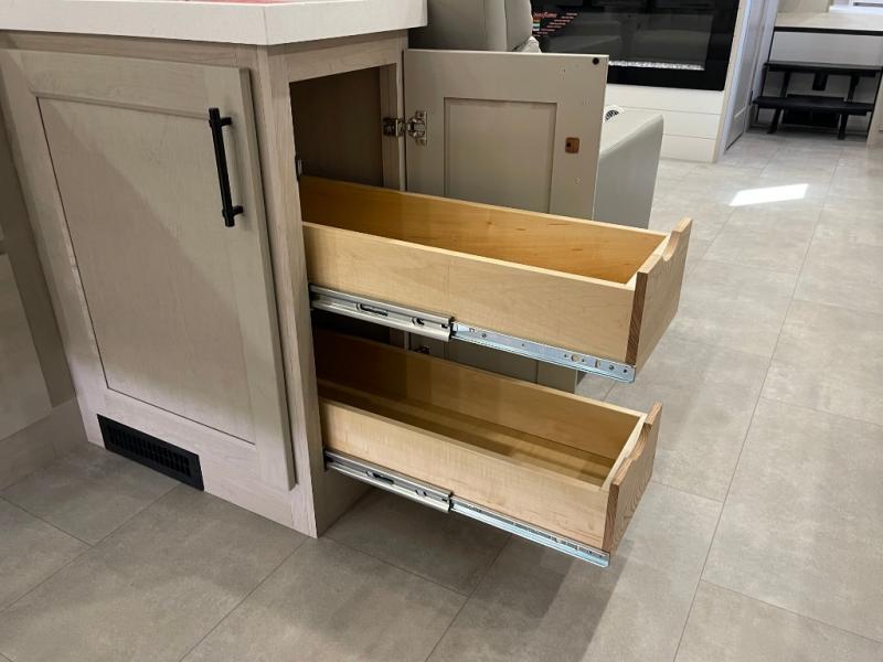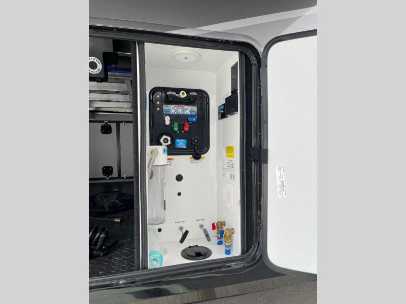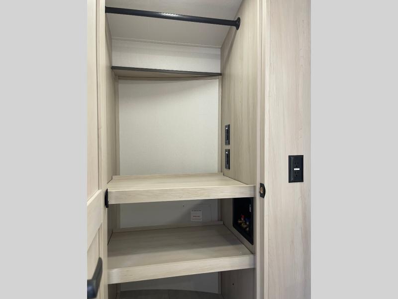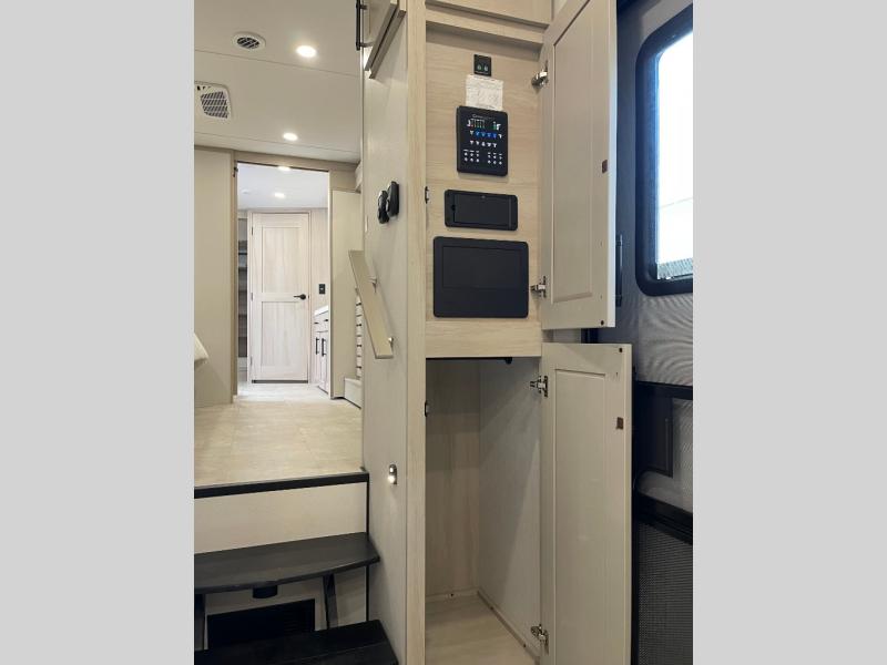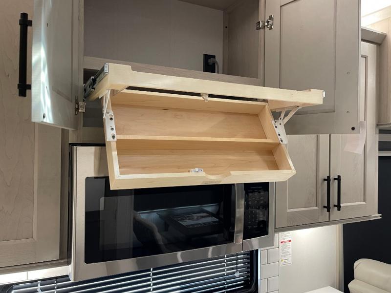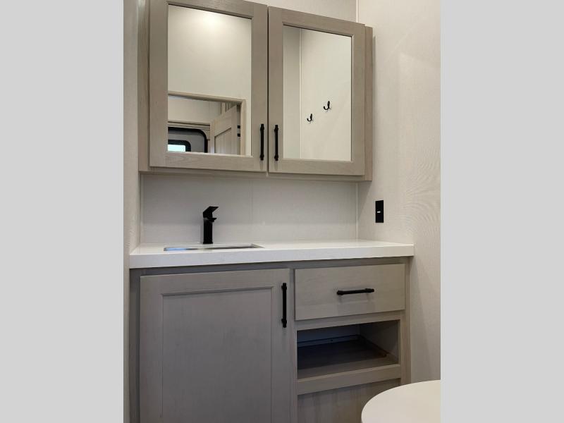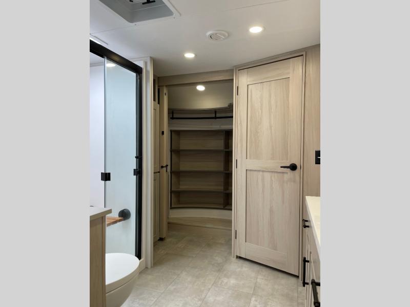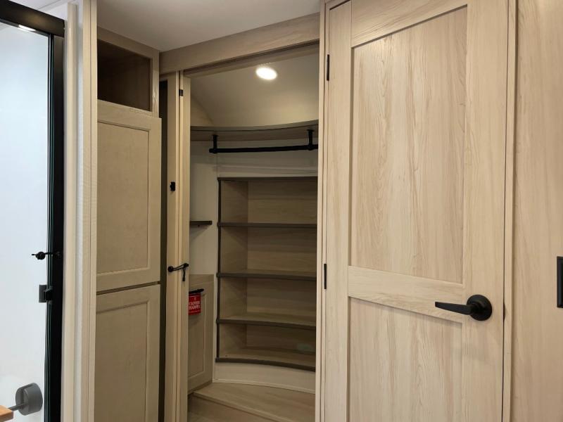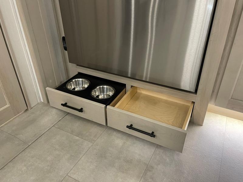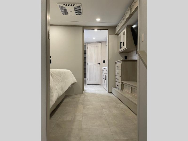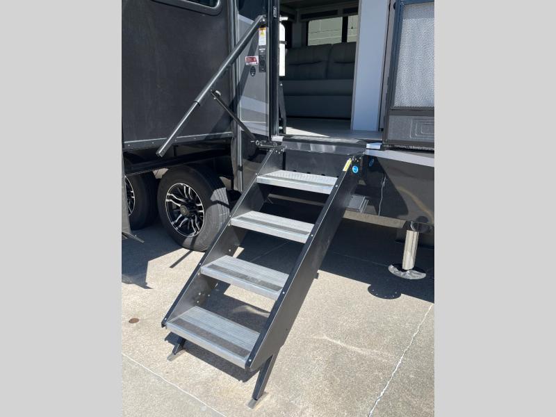 Comfort will come easy in this four slide out fifth wheel! You will feel right at home with a master bedroom that includes a queen bed slide out with a king bed option, dual dressers with a seat in between, plus a large front bath with tons of space. The convenient half bath is right as you enter the unit for convenience. Your crew can get cozy on the dual tri-fold sofas within dual opposing slides, or on the theater seating across from the LED TV and fireplace. One feature you will love about this fifth wheel is the rear kitchen with wrap-around counter space, a built-in oven, plus a 20 cu. ft. 12V refrigerator and a large pantry to keep food fresh.