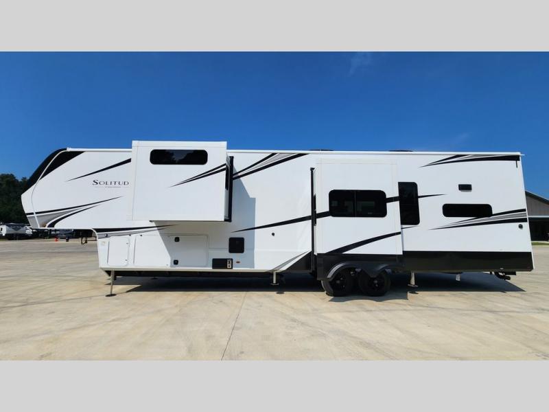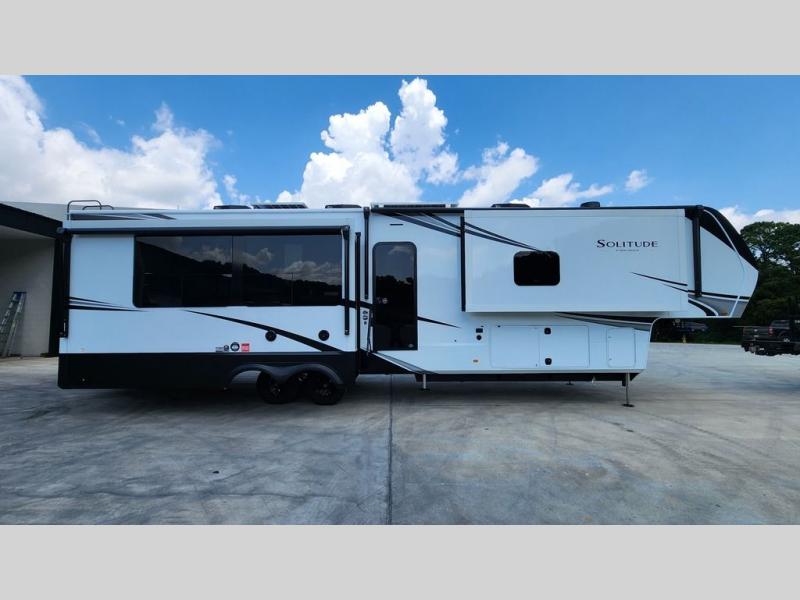Each Solitude fifth wheel by Grand Design features a 101" wide-body construction, heavy duty 8,000 lb. axles, frameless tinted windows, and high-gloss gel coat sidewalls. You can camp year around thanks to the Weather-Tek Package that includes a 35K BTU high-capacity furnace, an all-in-one enclosed and heated utility center, and a fully enclosed underbelly with heated tanks and storage. Inside, you'll love the premium roller shades, hardwood cabinet doors, solid surface countertops, plus residential finishes throughout to make you truly feel at home. Each model also includes a MORryde CRE3000 suspension system, self adjusting brakes, and a MORryde pin box that will provide smooth towing from home to campground. Affordable luxury is possible with the Solitude fifth wheels; choose yours today!