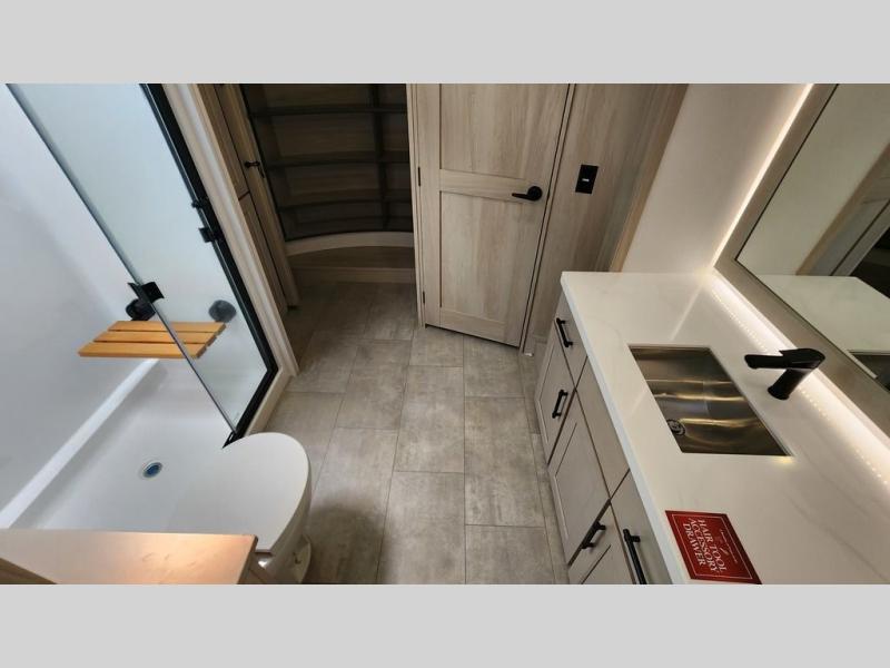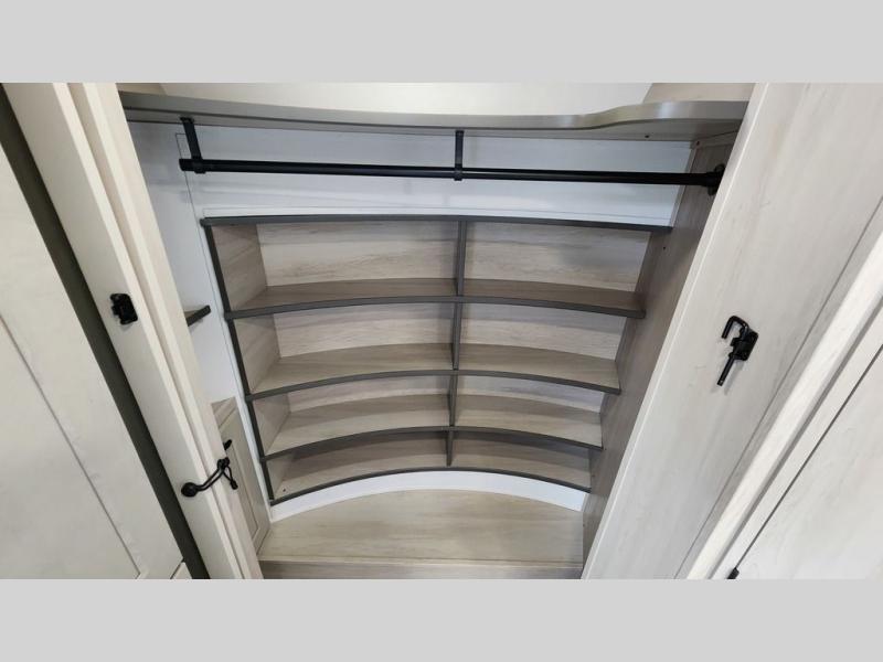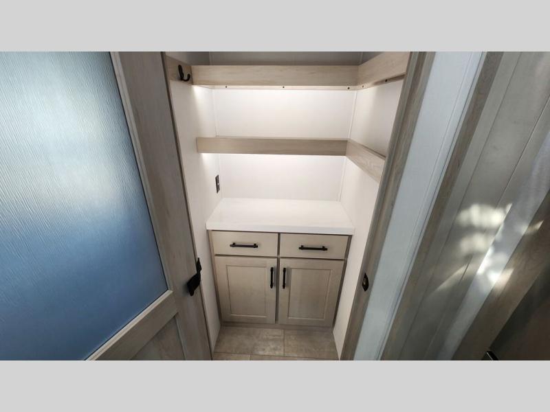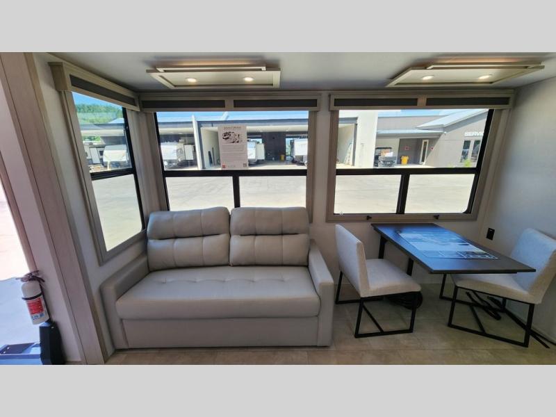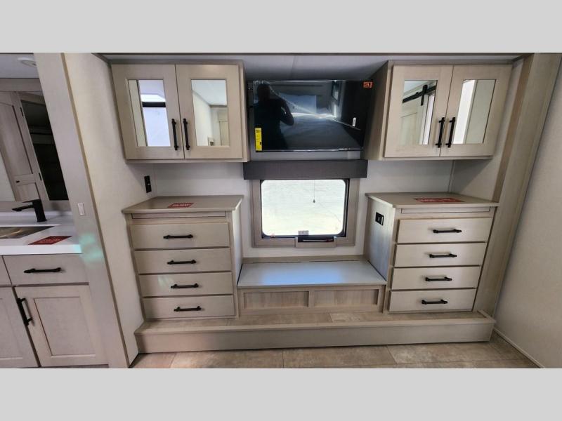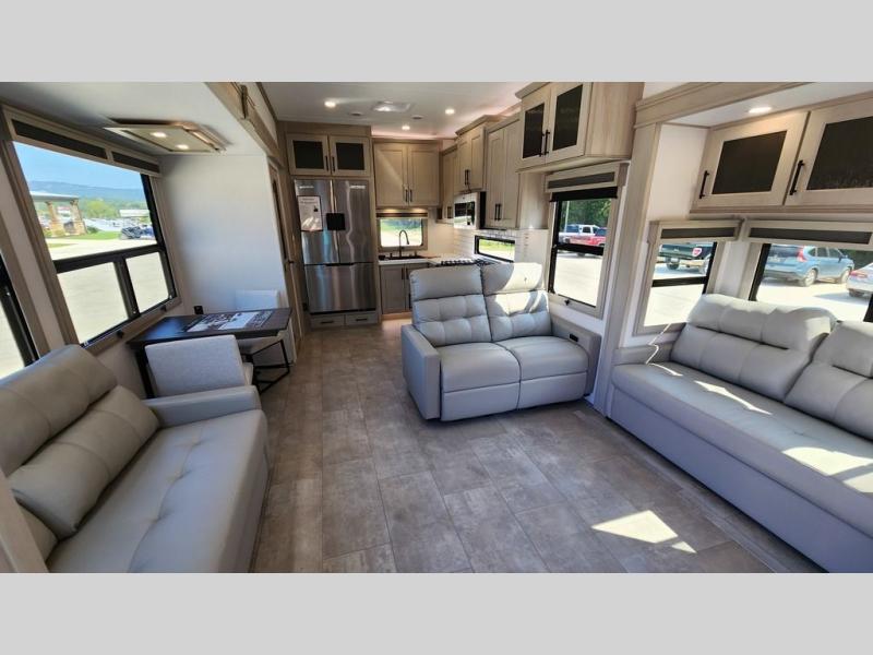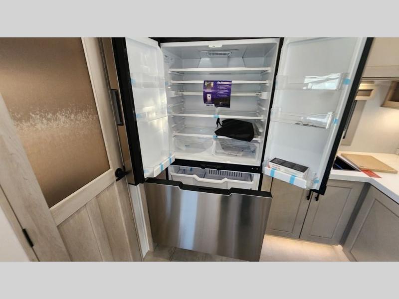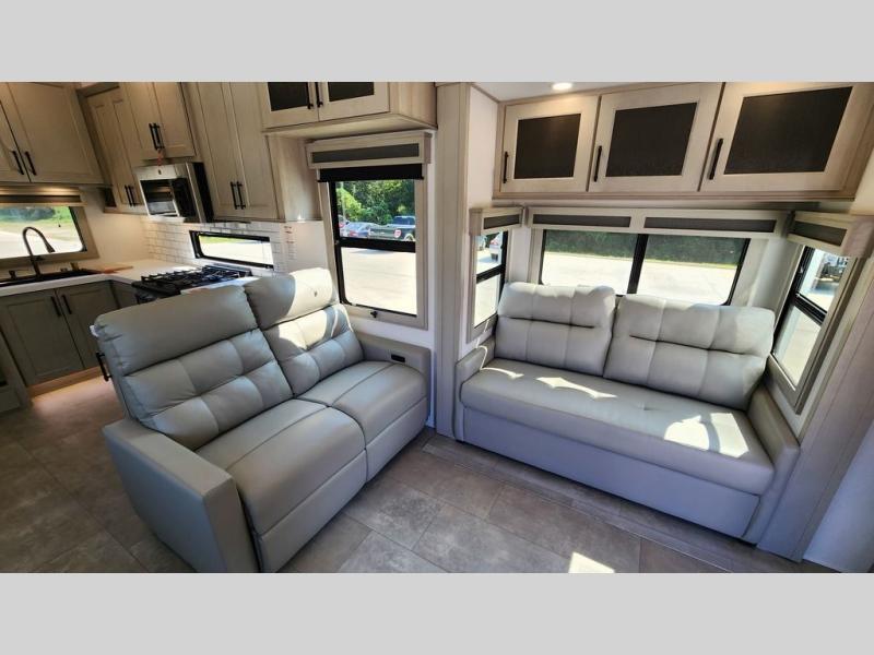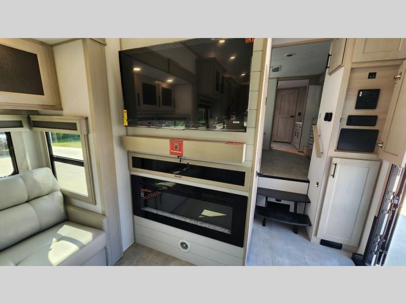 Comfort will come easy in this four slide out fifth wheel! You will feel right at home with a master bedroom that includes a queen bed slide out with a king bed option, dual dressers with a seat in between, plus a large front bath with tons of space. The convenient half bath is right as you enter the unit for convenience. Your crew can get cozy on the dual tri-fold sofas within dual opposing slides, or on the theater seating across from the LED TV and fireplace. One feature you will love about this fifth wheel is the rear kitchen with wrap-around counter space, a built-in oven, plus a 20 cu. ft. 12V refrigerator and a large pantry to keep food fresh.