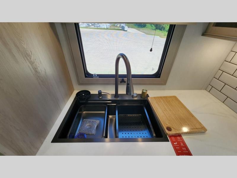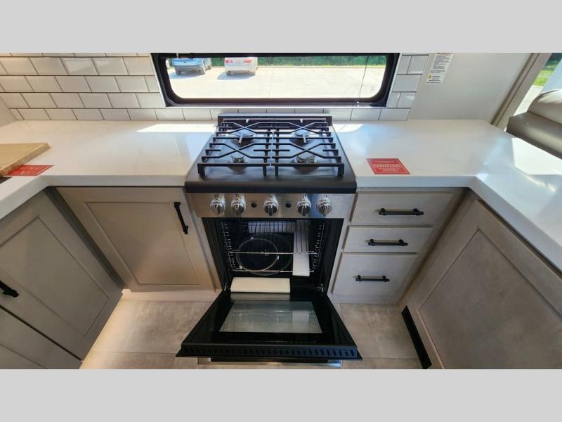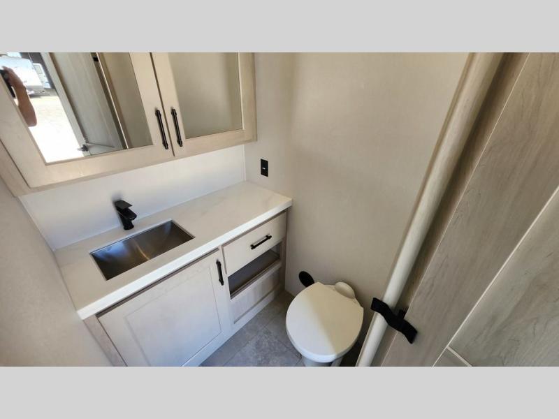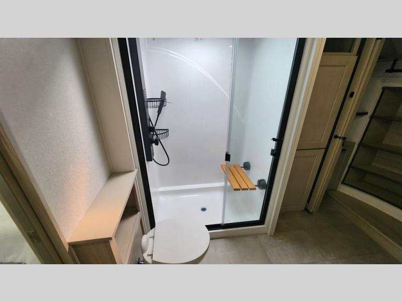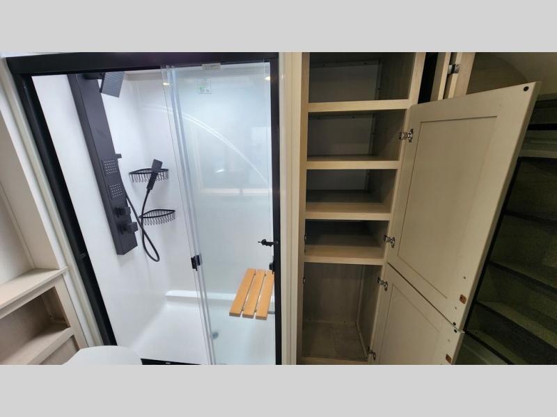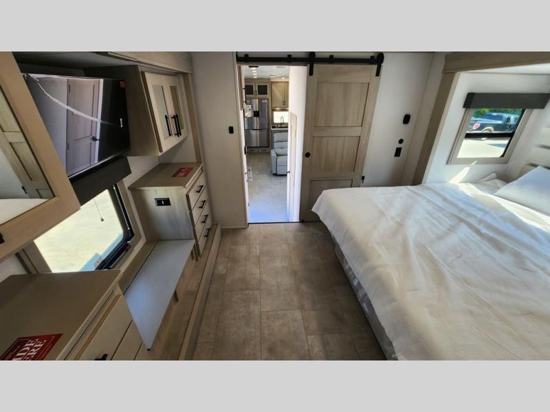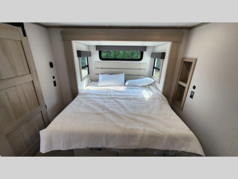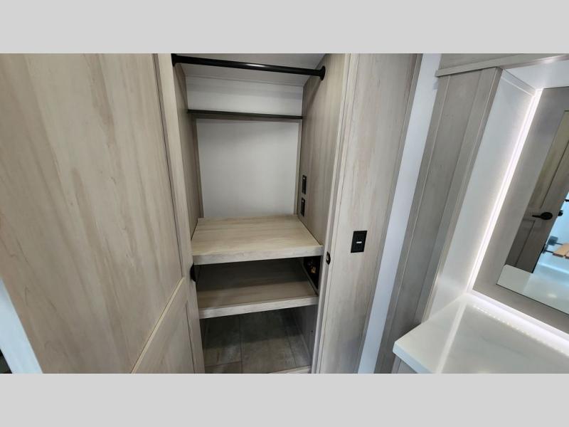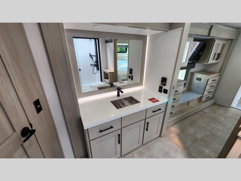 Comfort will come easy in this four slide out fifth wheel! You will feel right at home with a master bedroom that includes a queen bed slide out with a king bed option, dual dressers with a seat in between, plus a large front bath with tons of space. The convenient half bath is right as you enter the unit for convenience. Your crew can get cozy on the dual tri-fold sofas within dual opposing slides, or on the theater seating across from the LED TV and fireplace. One feature you will love about this fifth wheel is the rear kitchen with wrap-around counter space, a built-in oven, plus a 20 cu. ft. 12V refrigerator and a large pantry to keep food fresh.