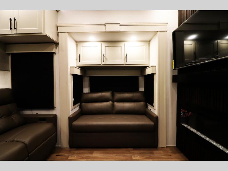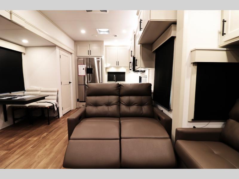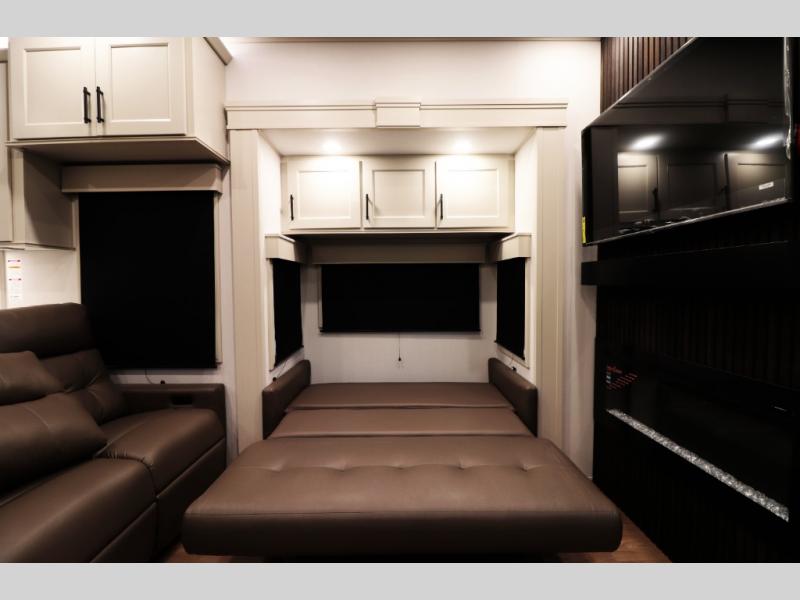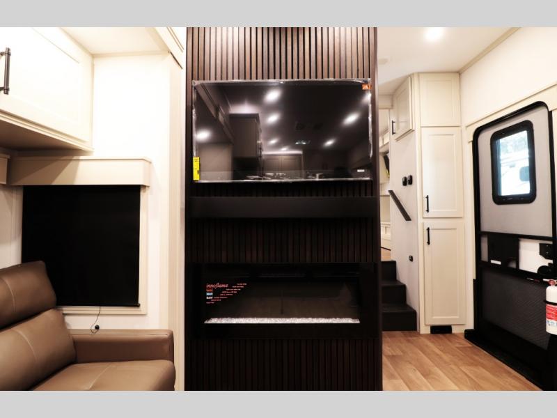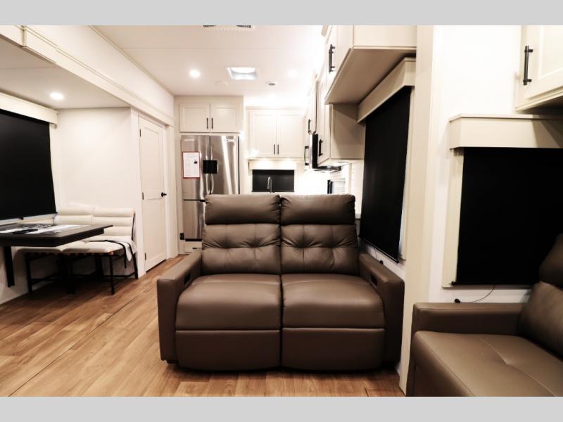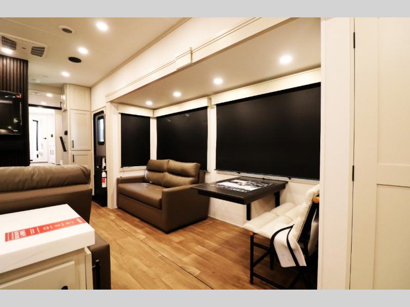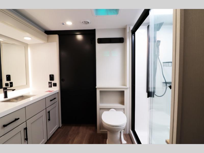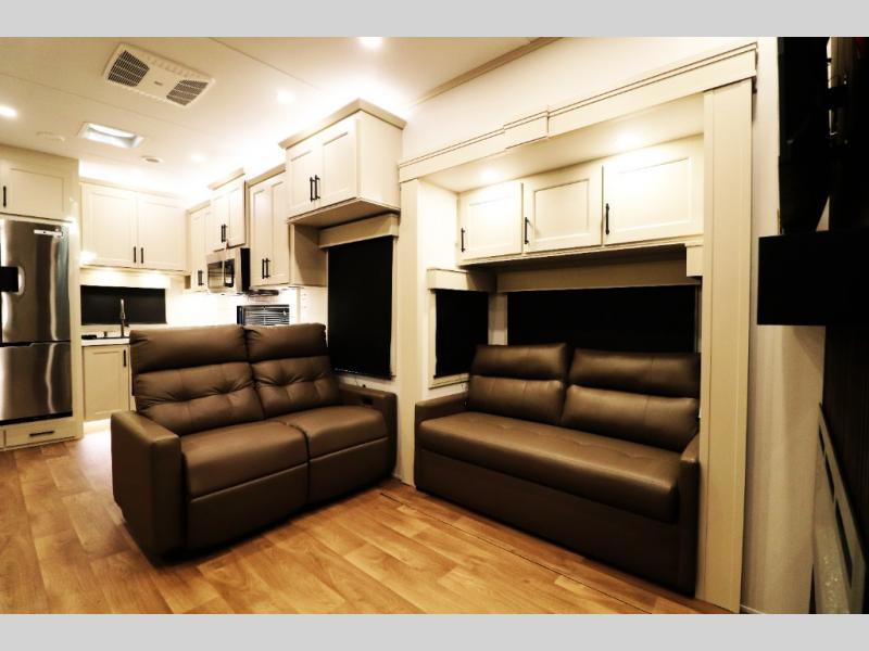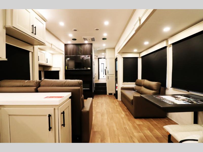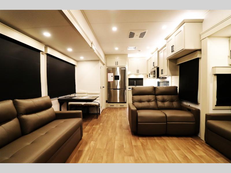 All-Season Ready (Weather-Tek Package): Heavy-duty 8,000 lb axles, fully enclosed and heated underbelly with heated tanks/storage, 35,000 BTU high-capacity furnace, tankless on-demand water heater, and dual-pane frameless tinted windows make this 417KB suitable for year-round RV living — even in colder climates or off-season travel.
